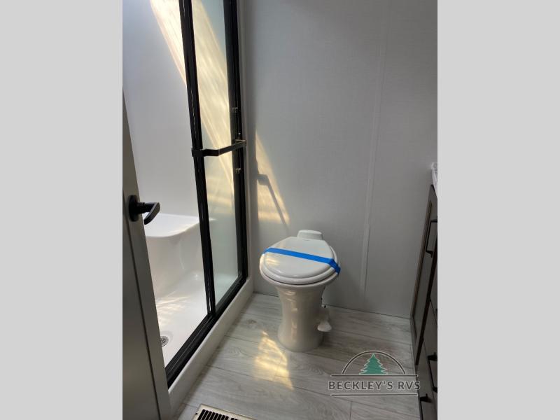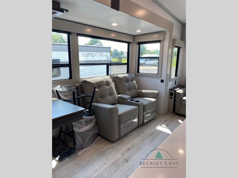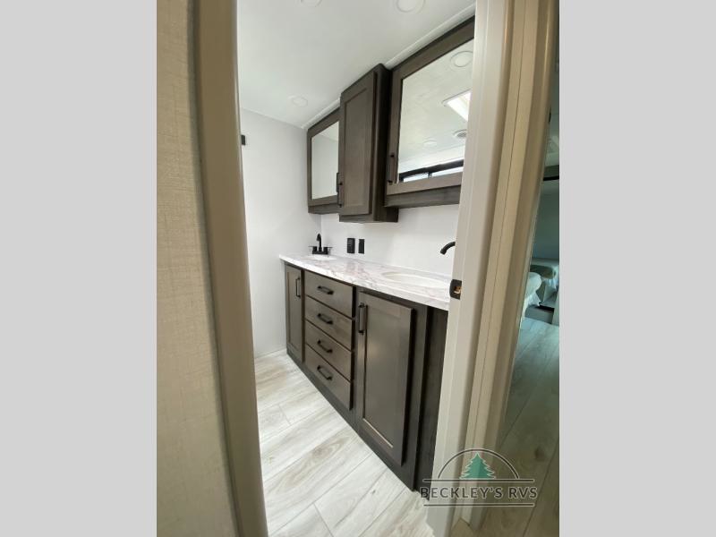 You can live life to its fullest in this Montana High Country fifth wheel! There are opposing slides in the main living area for more space, and the fireplace adds coziness to this space. Spend time relaxing on the power theater seating, and use the hide-a-bed sofa as an extra bed when you have friends turn into overnight guests. The pantry will help you keep your snacks stored away, and full bathroom has a dual-sink vanity and 48" x 30" shower with seat for a convenient way to get clean. The front bedroom has a king bed slide with storage underneath the bed, and the wardrobe and dresser provide more storage space.