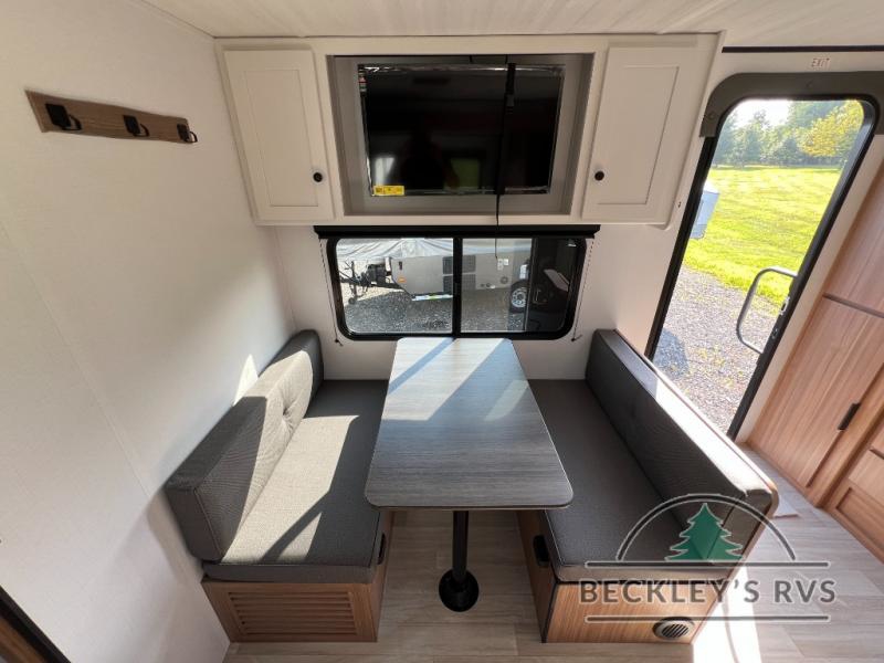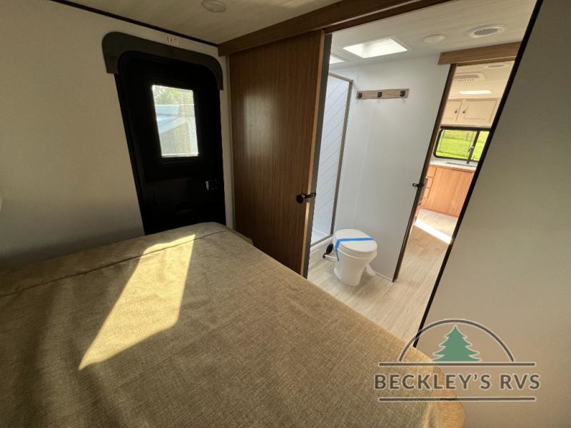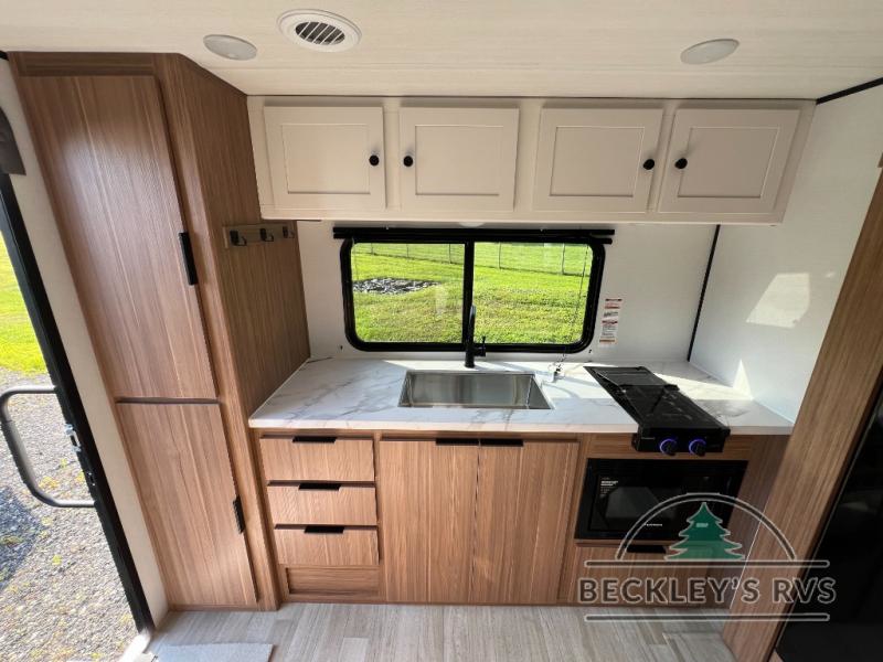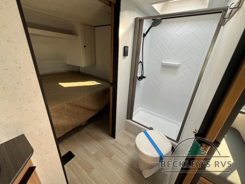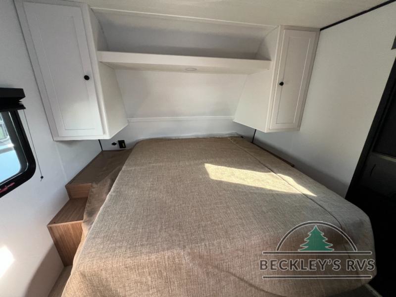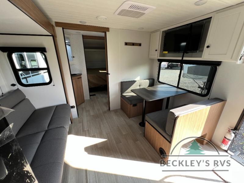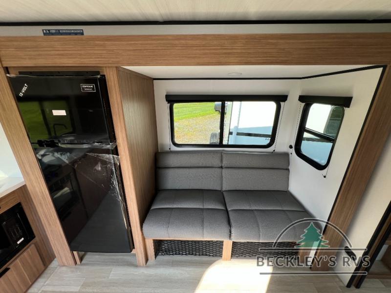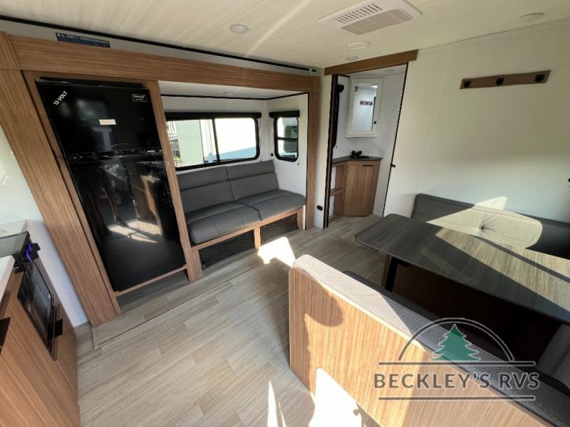 Camping trips in this spacious travel trailer will be trips well spent! With dual entry doors, you can enter in through the front private bedroom or the rear kitchen. Not only will find a walk-around queen bed in the bedroom, but you can also keep your things organized with the dual bedside wardrobes and nightstands. The walk-thru bath leads to the main living area that includes a jack knife sofa slide out and booth dinette. And the chef of your group will love cooking in the rear kitchen with a two burner cooktop, microwave oven, plus a pantry and 12V refrigerator for food storage!