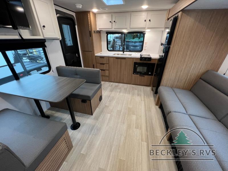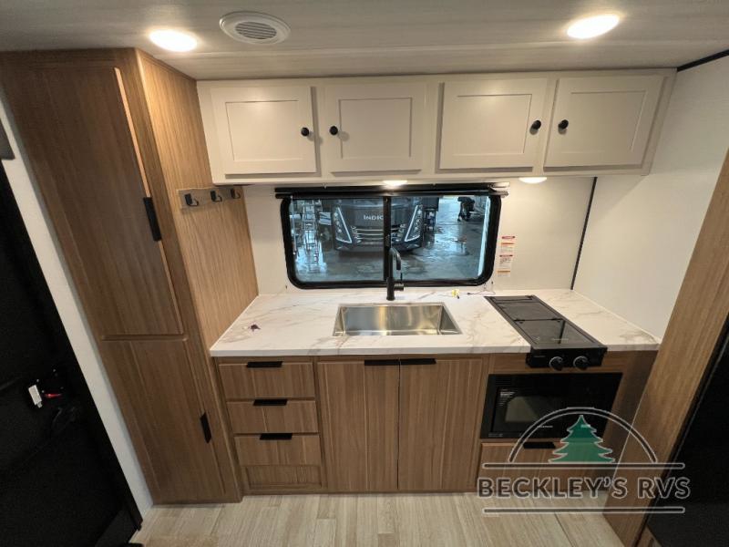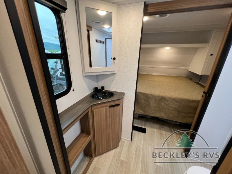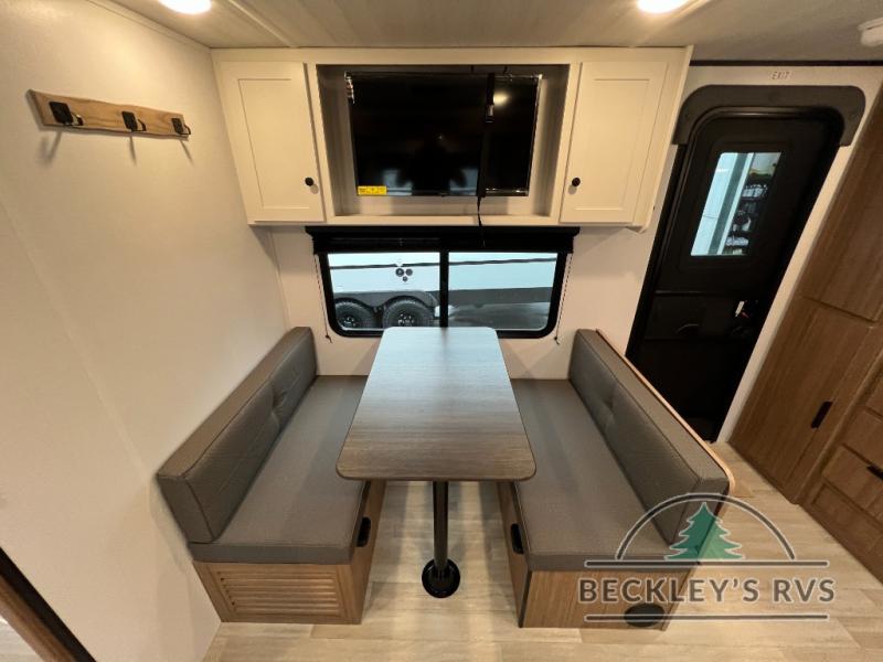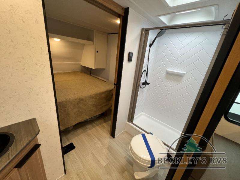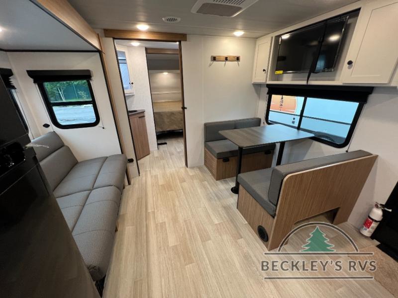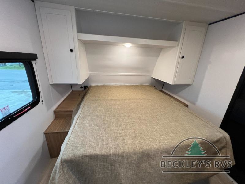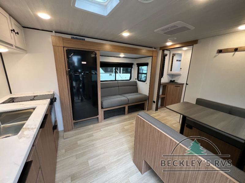 Camping trips in this spacious travel trailer will be trips well spent! With dual entry doors, you can enter in through the front private bedroom or the rear kitchen. Not only will find a walk-around queen bed in the bedroom, but you can also keep your things organized with the dual bedside wardrobes and nightstands. The walk-thru bath leads to the main living area that includes a jack knife sofa slide out and booth dinette. And the chef of your group will love cooking in the rear kitchen with a two burner cooktop, microwave oven, plus a pantry and 12V refrigerator for food storage!