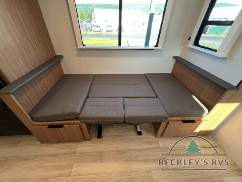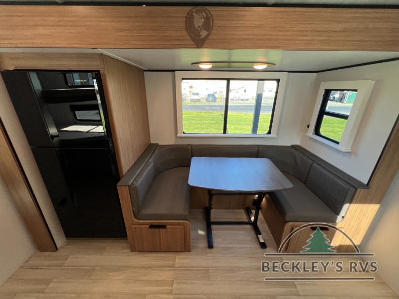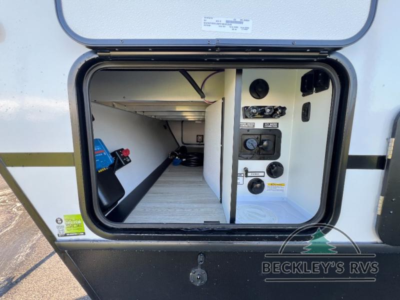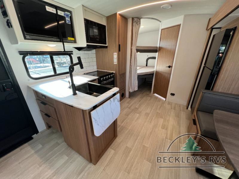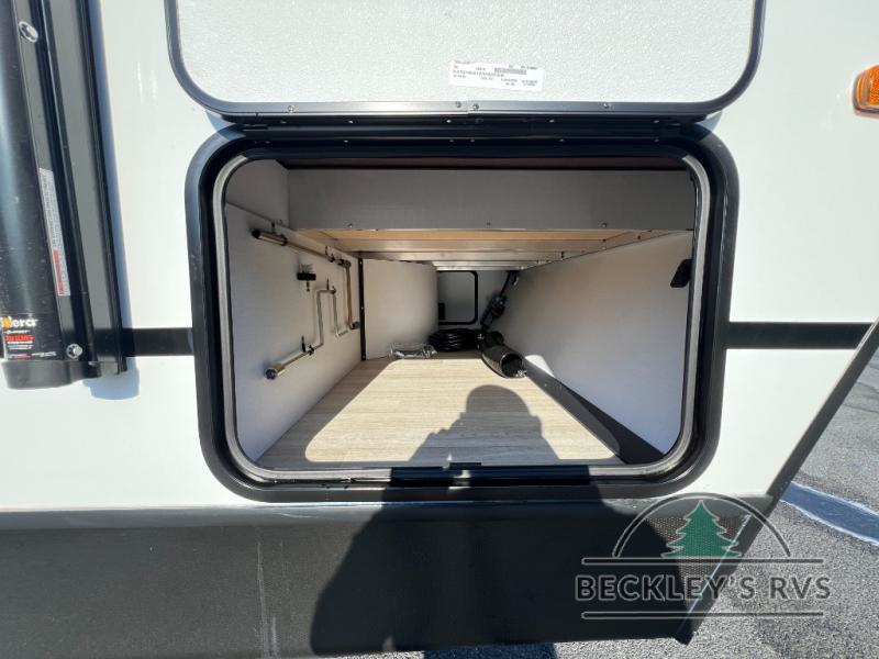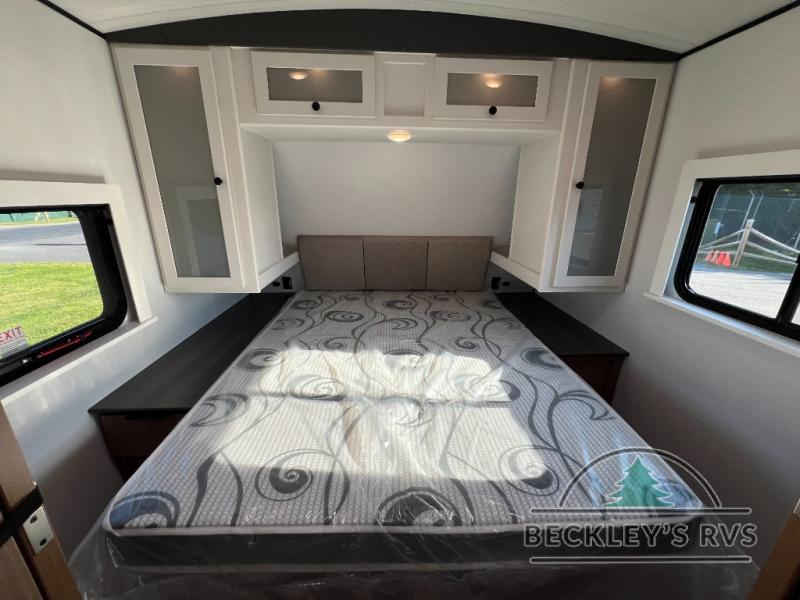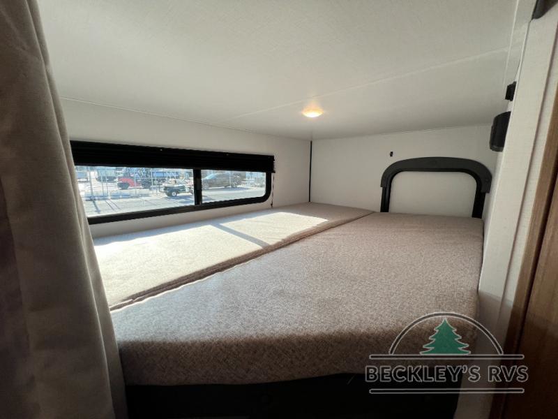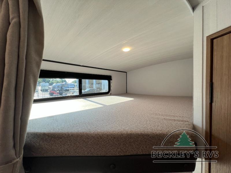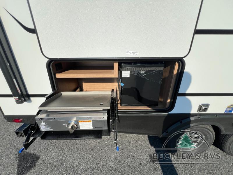 Trips to the lake with a larger group are made easy in this spacious travel trailer! The double-size bunks include a flip-up bunk for added storage, and there is a rear cargo door here so you can easily load gear from outside. The full bath is conveniently located right by the bunks for easy nighttime use, and the pantry is also close by if anyone needs a midnight snack! You will sleep like a baby in the front bedroom that includes a queen bed and dual wardrobes to keep your clothes tidy. In the morning, everyone can meet in the combined living area and kitchen while the chef makes breakfast on the three burner cooktop, and there is a U-shaped do-more dinette table to dine at. If the weather is nice, the chef just may want to cook on the outside kitchen with a griddle, and everyone can sit at the picnic table under the 15' awning!