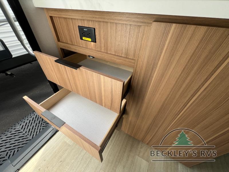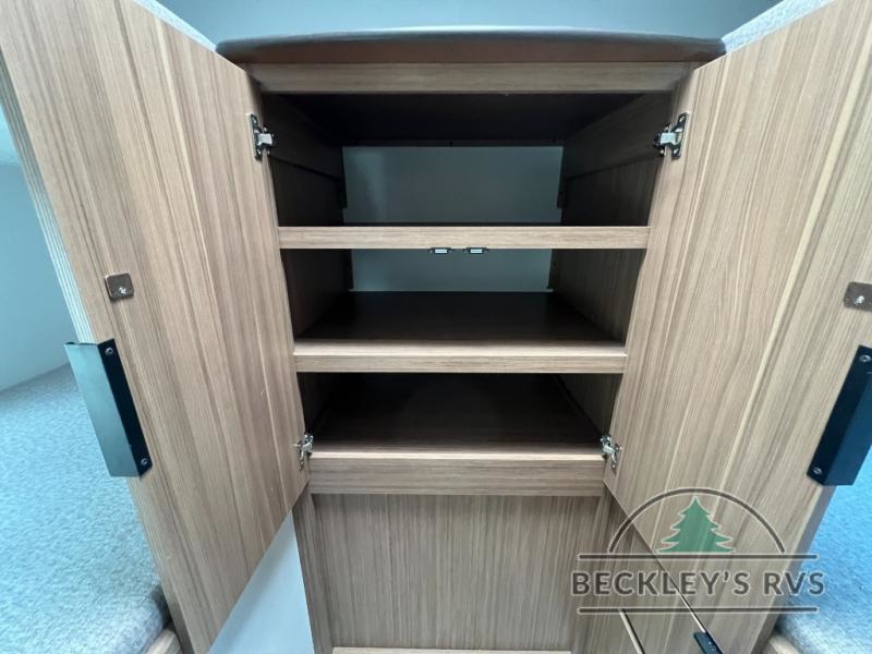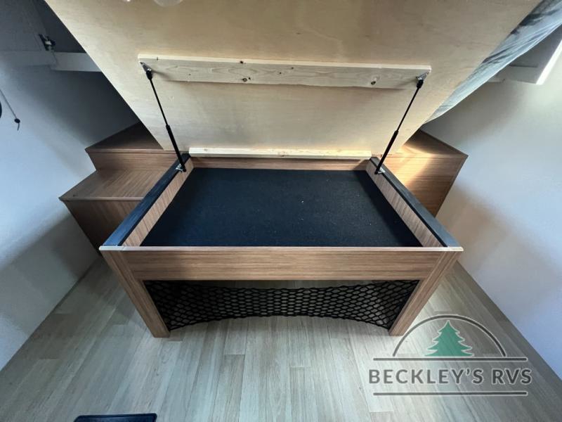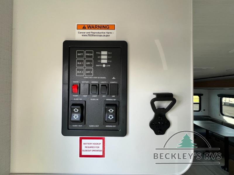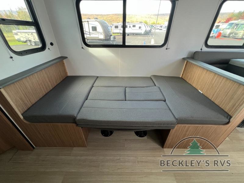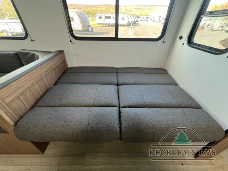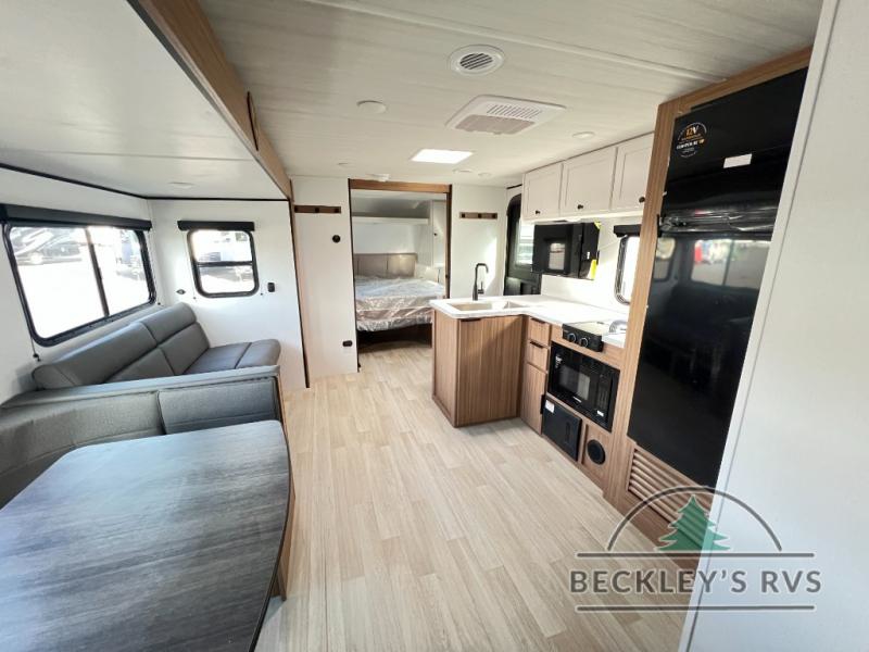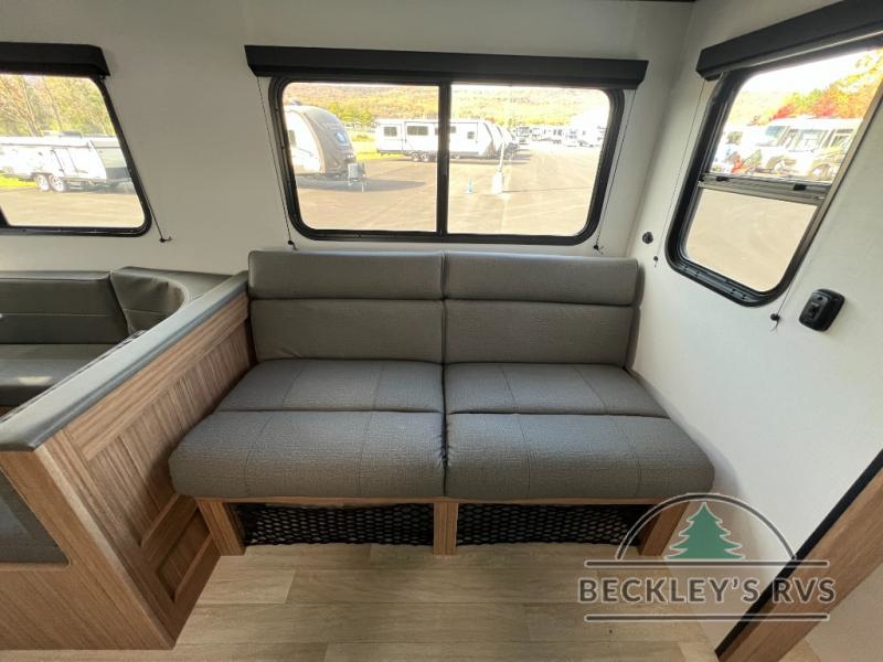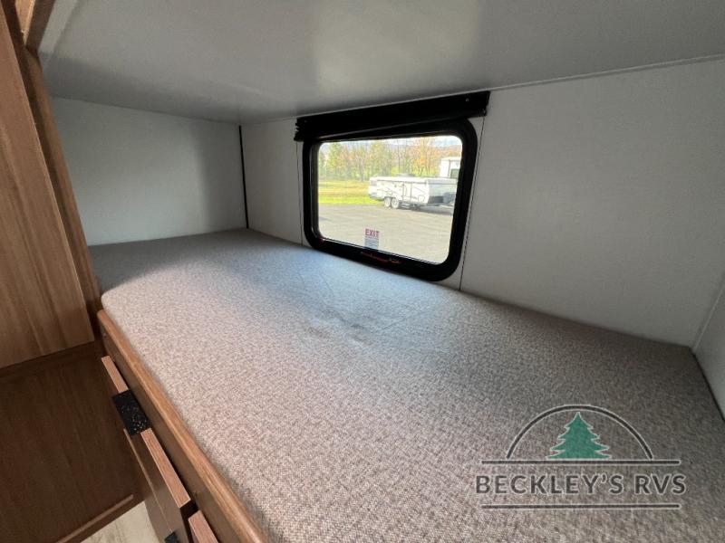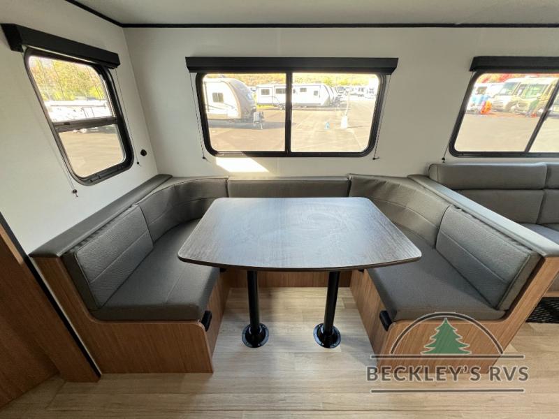 This spacious travel trailer is perfect for a large group or family since it can sleep eight to ten people each night. The bunkhouse will be a favorite spot for the littles ones to enjoy, especially with four bunk beds and a wardrobe with storage. You'll have a queen bed up front in the private bedroom, and if you have any other guests, they can sleep on the jack knife sofa and booth dinette! The two burner range and microwave oven allow you to make meals each day, and the large double door 12V refrigerator will keep leftovers fresh.