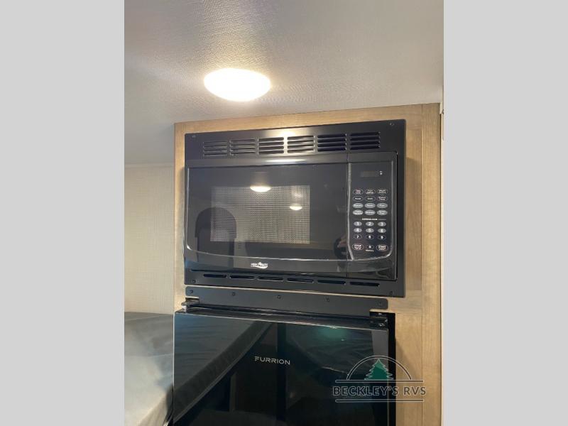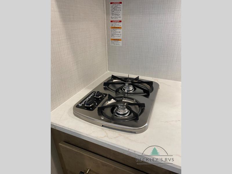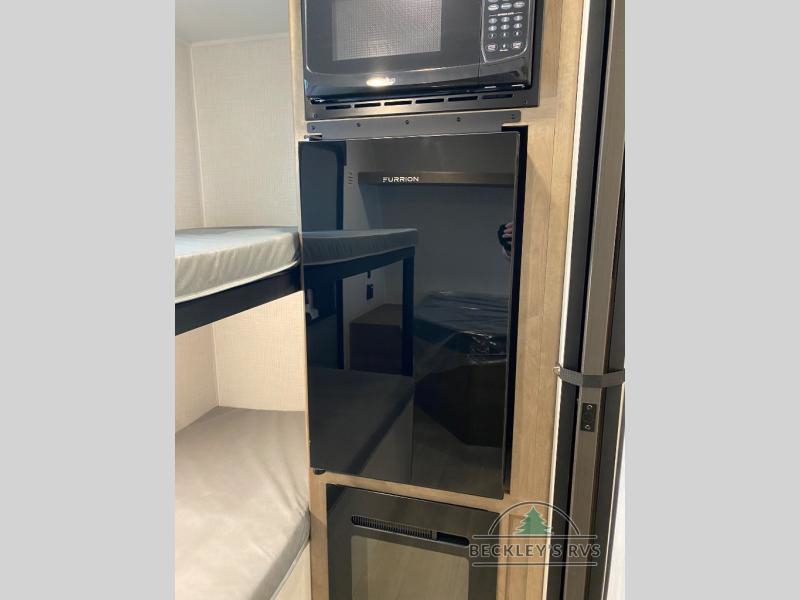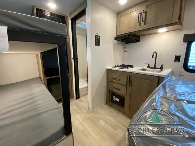 This lightweight travel trailer is perfect for four happy campers. You'll enjoy the front full-size bed, while your guests or little ones take the 28" x 74" bunk beds. There is also a shelf above the bed to keep your things organized. A private bath includes a shower with a toilet so you can freshen up each day without having to leave your camper. You can make your meals on the two burner gas cooktop or in the microwave oven, then take your plate outdoors to eat under the 8' power awning!