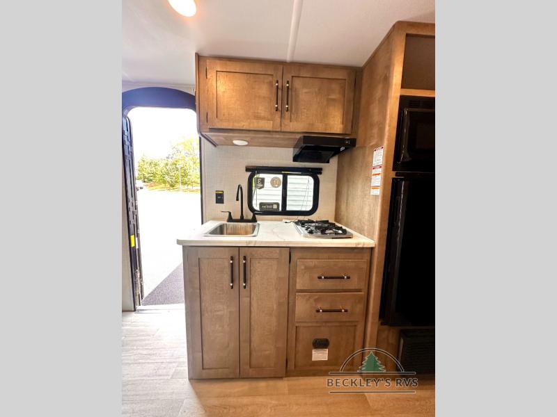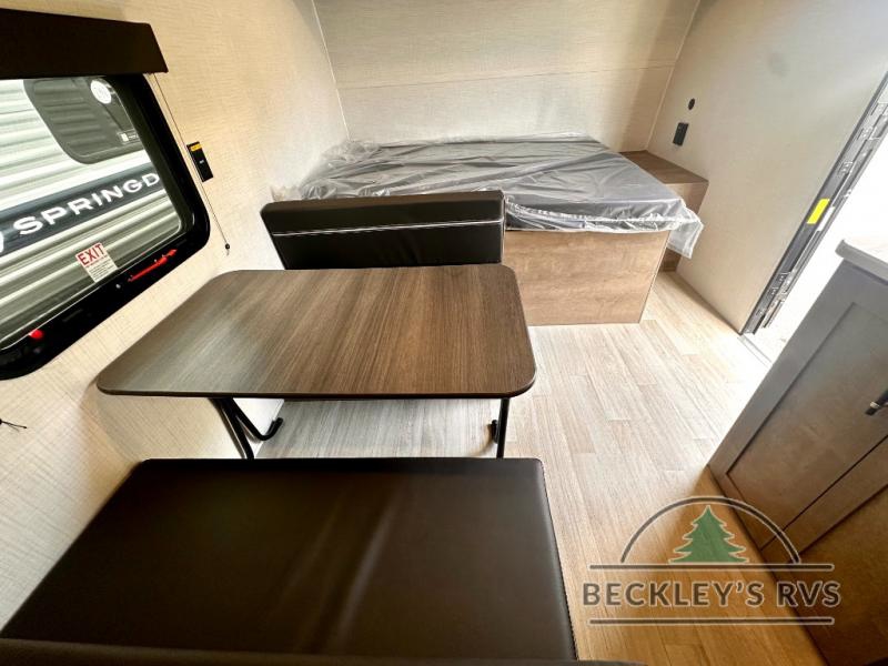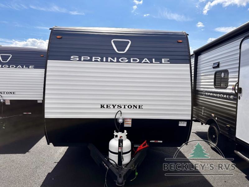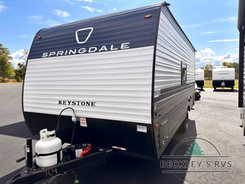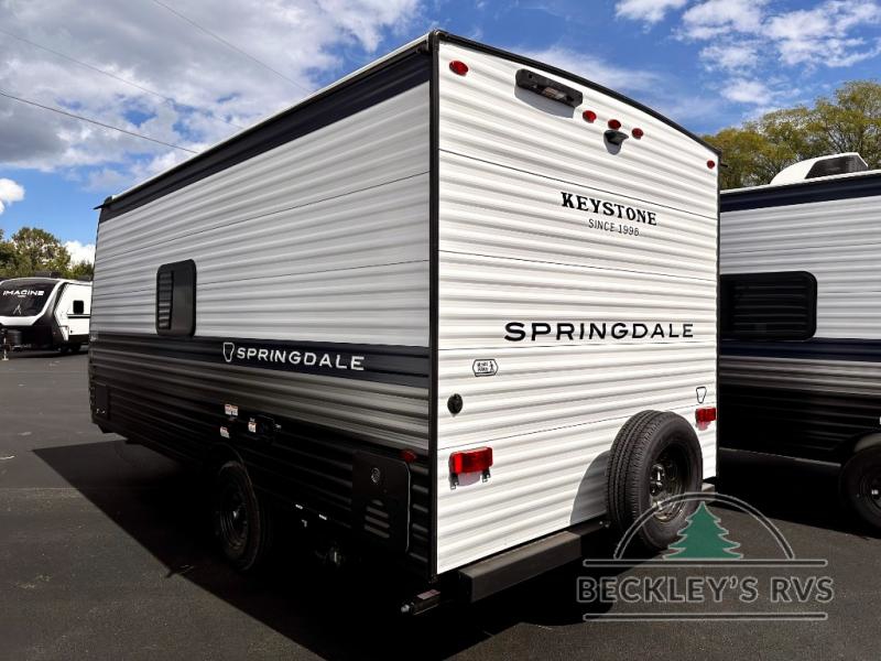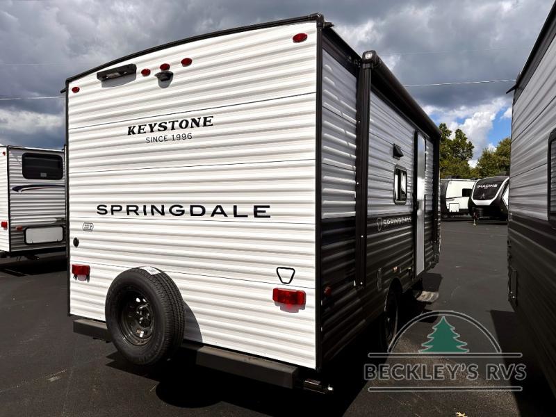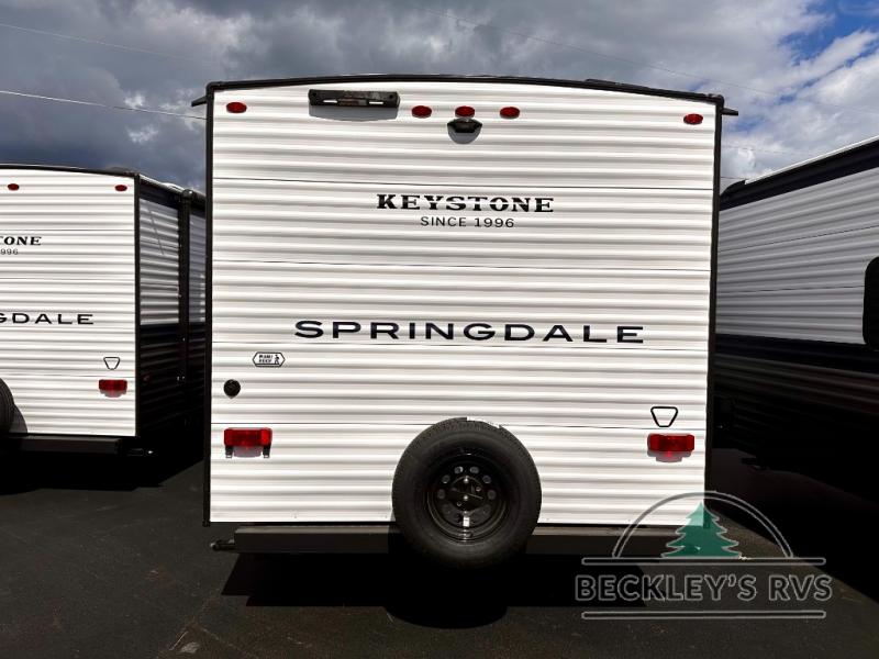 With any Springdale Mini travel trailer by Keystone, you will enjoy lightweight towing thanks to their single-axle! The AlphaPly TPO roof membrane is ultra durable, and the power awning will provide protection from the sun as you relax in your camp chairs outside. Each model includes blackout night shades, LED lighting, plus many more interior comforts. There is also a roof A/C and 20K BTU furnace to keep you comfortable, plus a tankless water heater for endless hot showers!