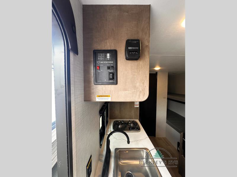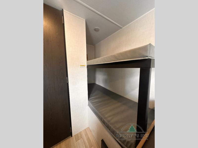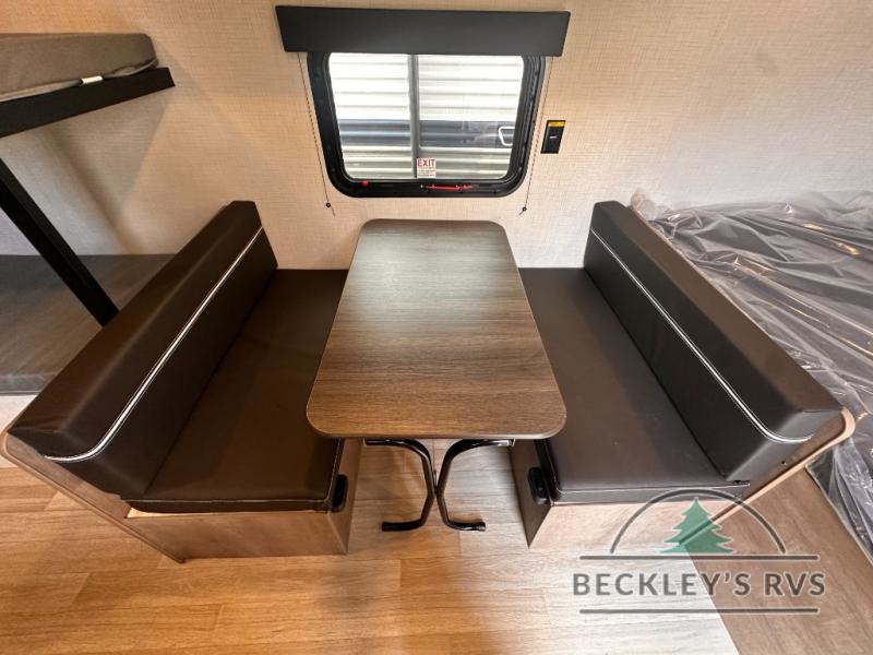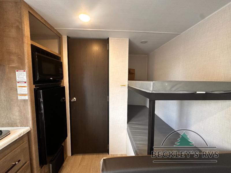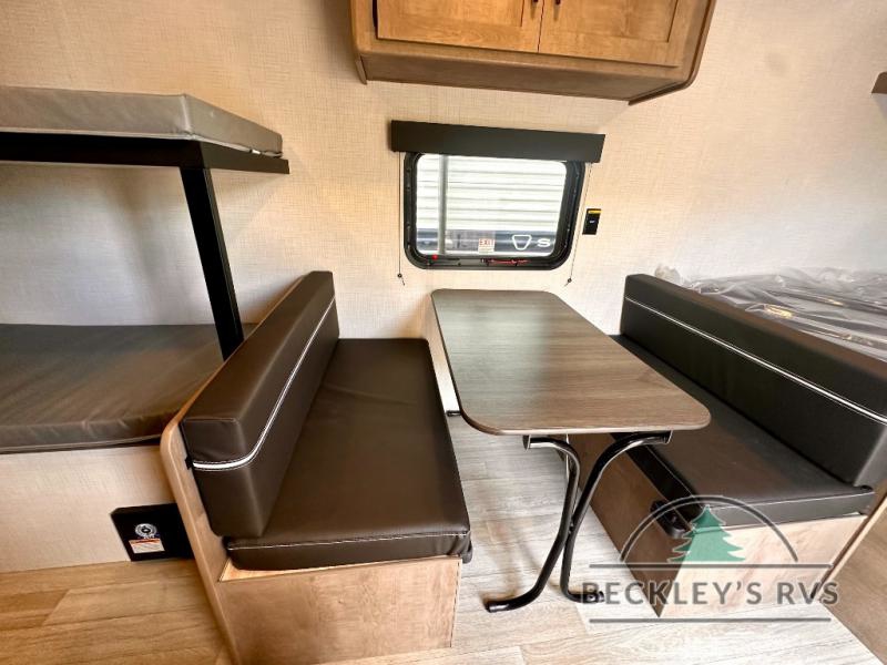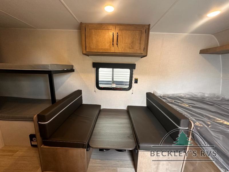 Get ready for outdoor fun with your favorite people when you have this trailer in tow! Once at your campsite, you can easily setup the 10' power awning, grab your camping chairs from the pass-thru storage, and relax or start playing. The cook will love the galley kitchen with the two burner cooktop, plus a refrigerator for cold items. If you like, you can eat inside at the booth dinette which doubles as sleeping space, and of course the kids will love the bunk beds next to the full bathroom. And you will sleep soundly on the front queen bed