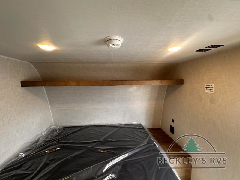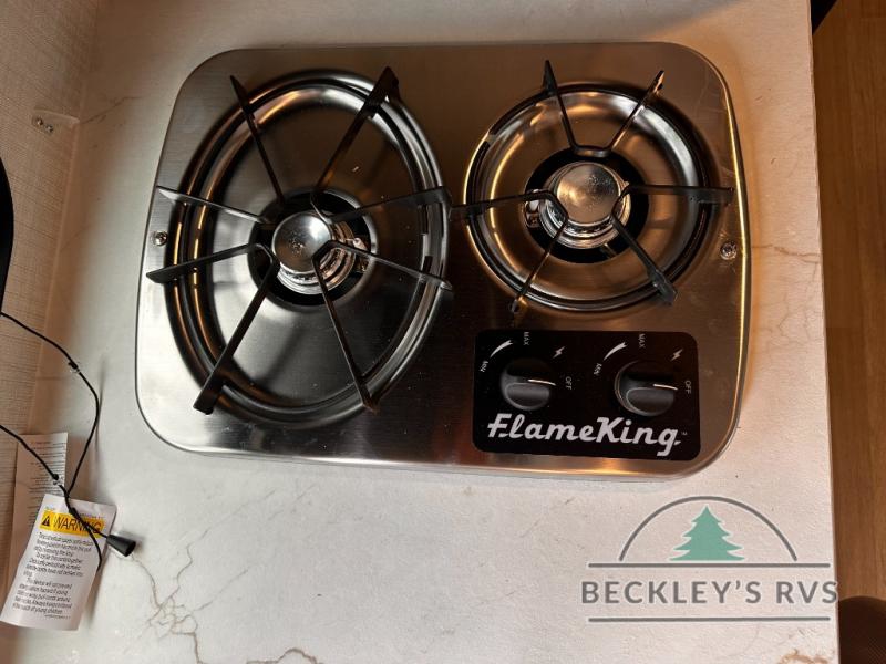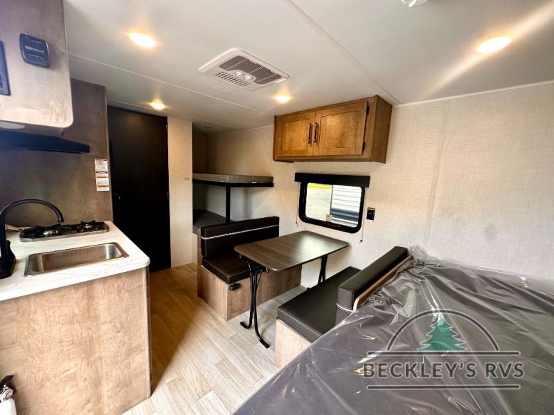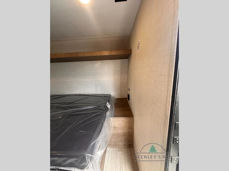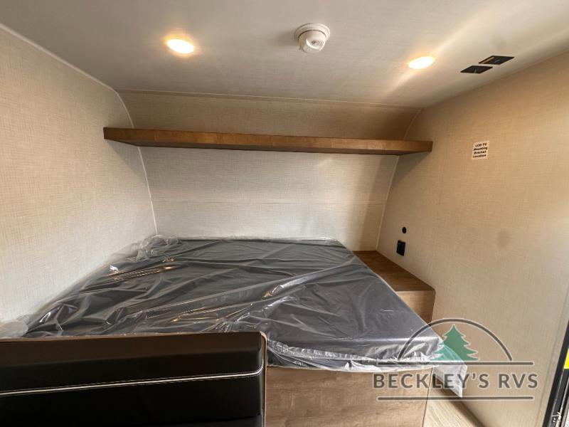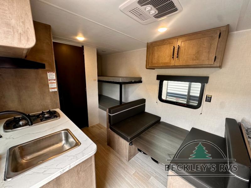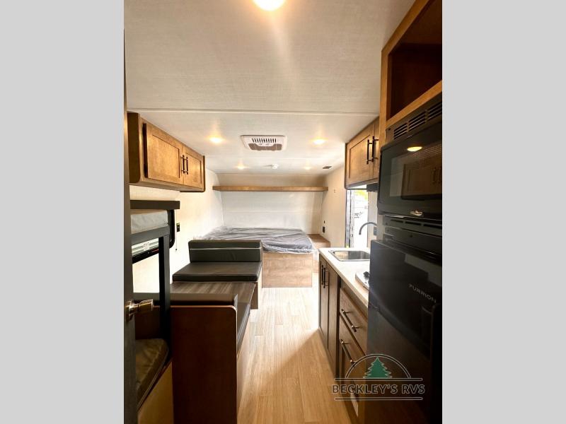 Get ready for outdoor fun with your favorite people when you have this trailer in tow! Once at your campsite, you can easily setup the 10' power awning, grab your camping chairs from the pass-thru storage, and relax or start playing. The cook will love the galley kitchen with the two burner cooktop, plus a refrigerator for cold items. If you like, you can eat inside at the booth dinette which doubles as sleeping space, and of course the kids will love the bunk beds next to the full bathroom. And you will sleep soundly on the front queen bed
