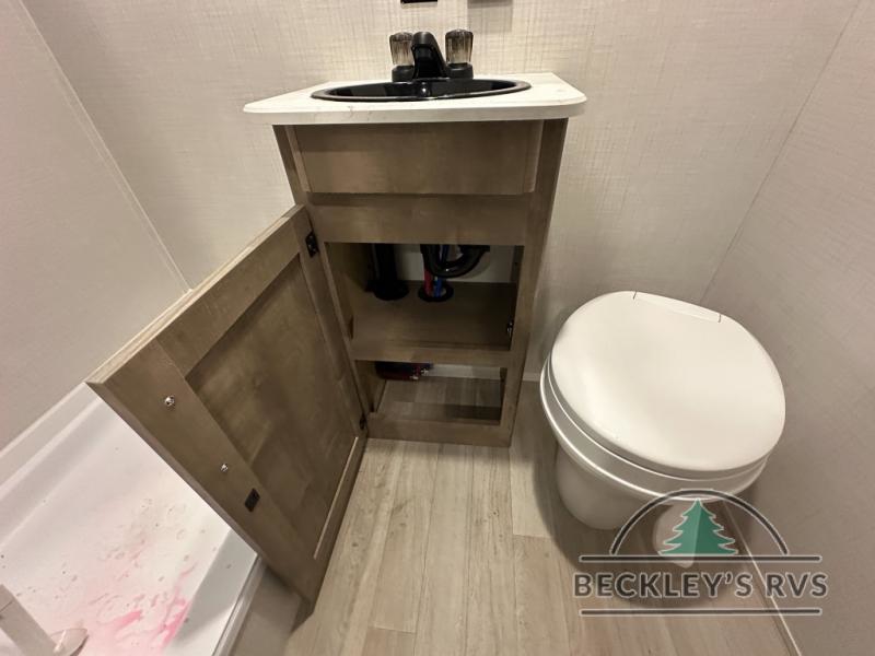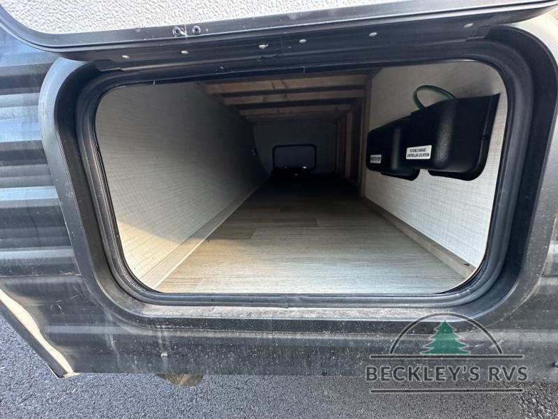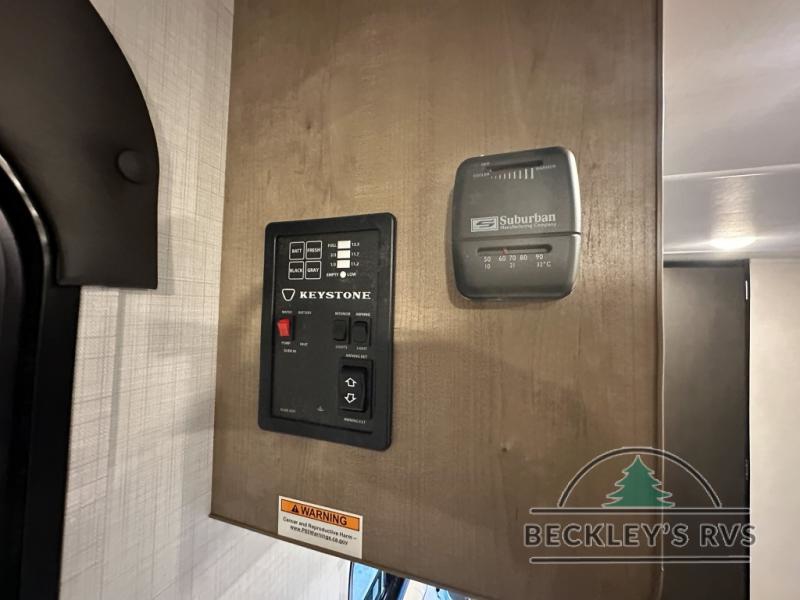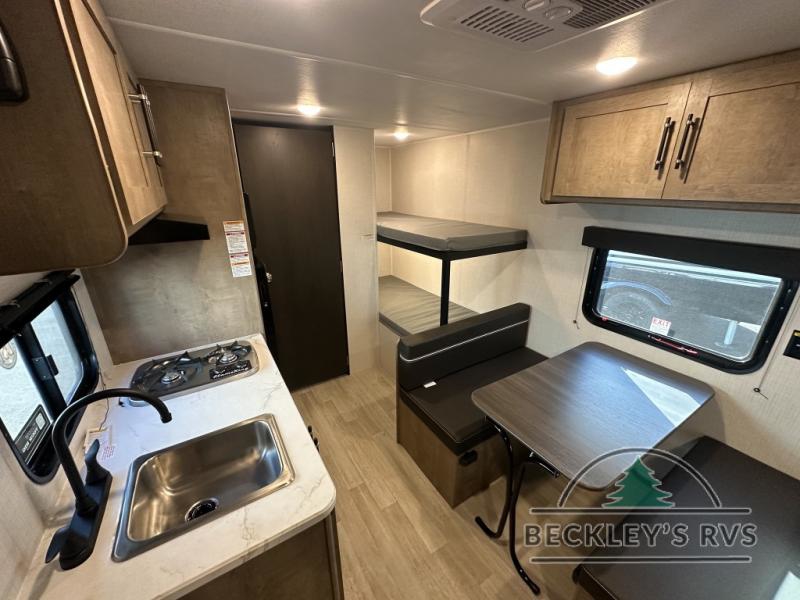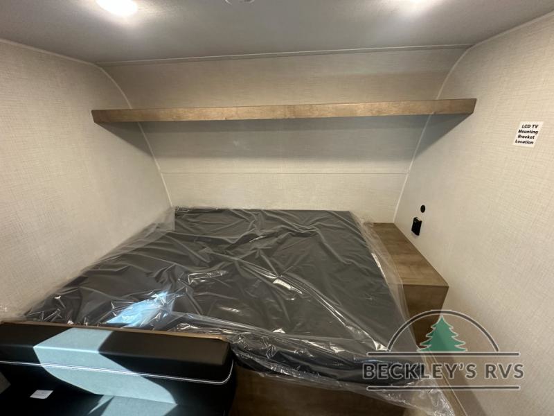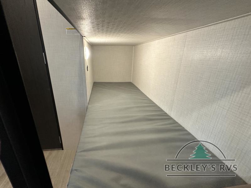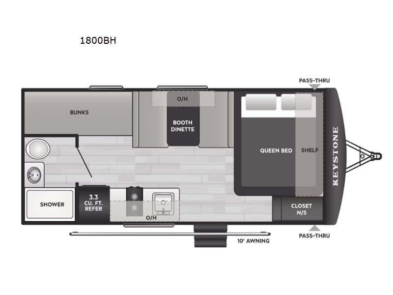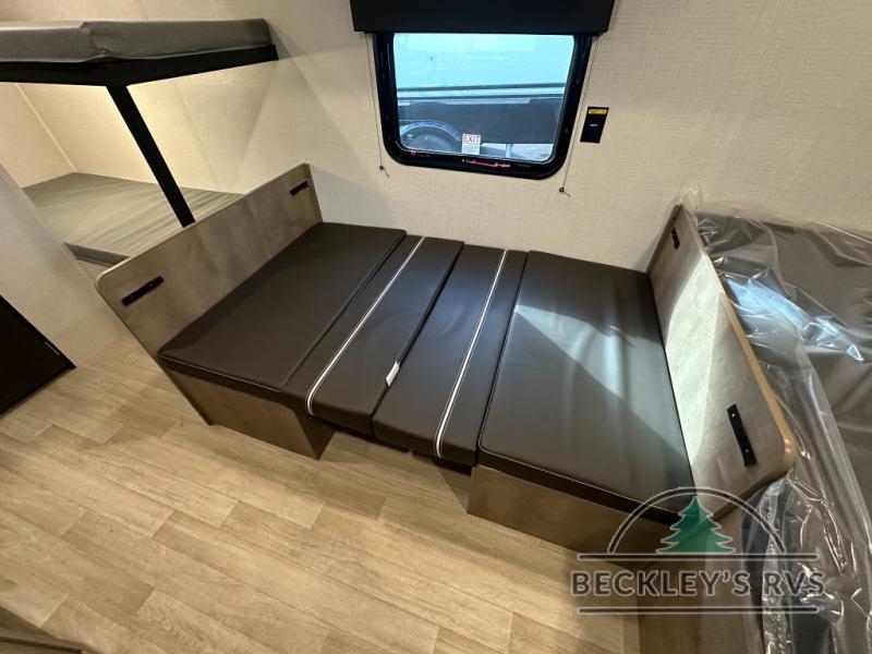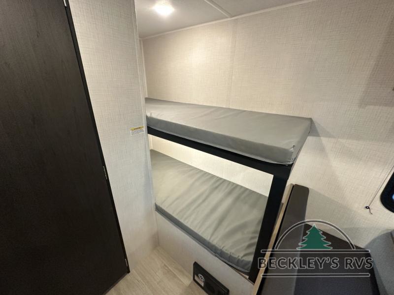 Get ready for outdoor fun with your favorite people when you have this trailer in tow! Once at your campsite, you can easily setup the 10' power awning, grab your camping chairs from the pass-thru storage, and relax or start playing. The cook will love the galley kitchen with the two burner cooktop, plus a refrigerator for cold items. If you like, you can eat inside at the booth dinette which doubles as sleeping space, and of course the kids will love the bunk beds next to the full bathroom. And you will sleep soundly on the front queen bed