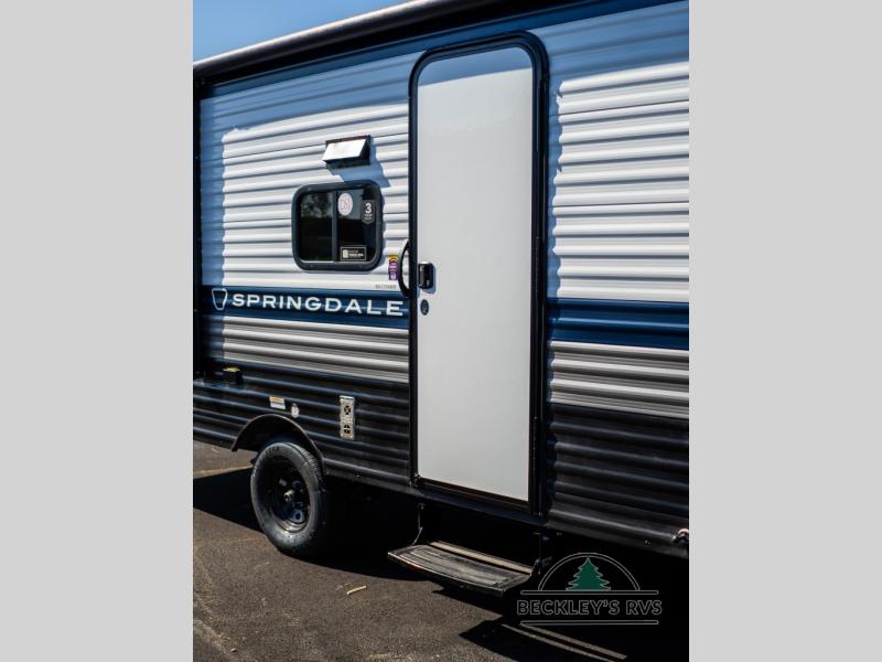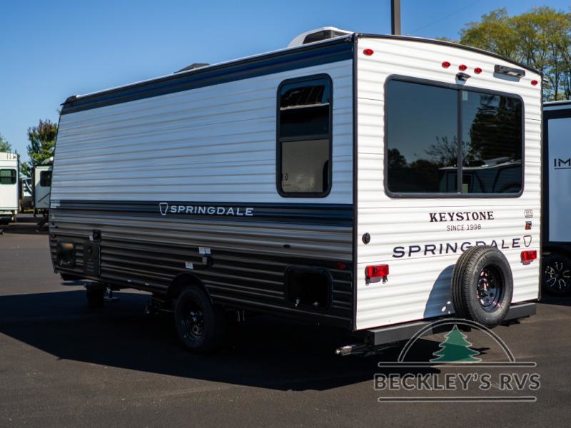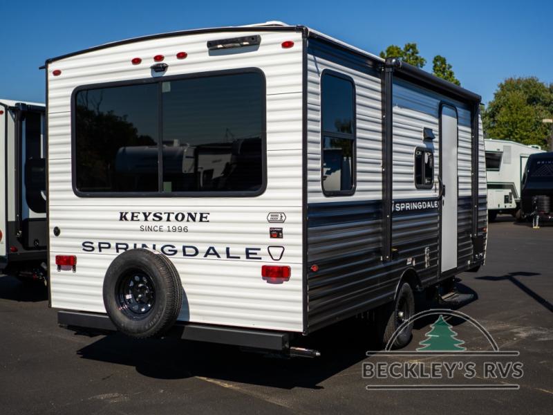 With any Springdale Mini travel trailer by Keystone, you will enjoy lightweight towing thanks to their single-axle! The AlphaPly TPO roof membrane is ultra durable, and the power awning will provide protection from the sun as you relax in your camp chairs outside. Each model includes blackout night shades, LED lighting, plus many more interior comforts. There is also a roof A/C and 20K BTU furnace to keep you comfortable, plus a tankless water heater for endless hot showers!