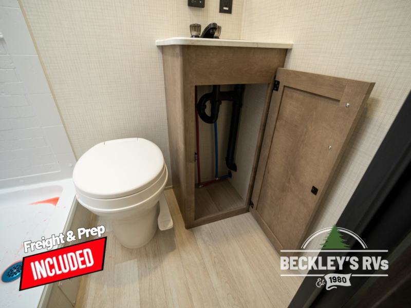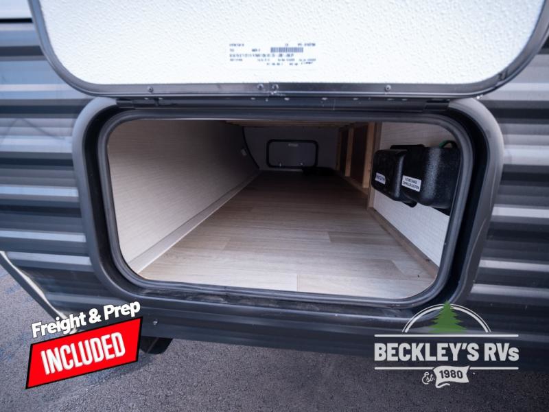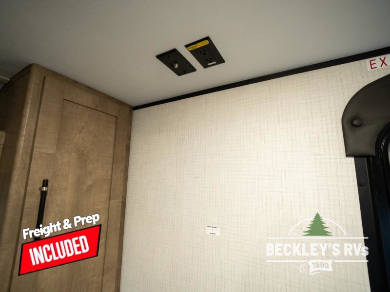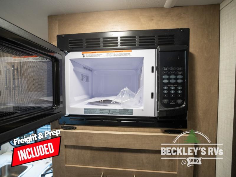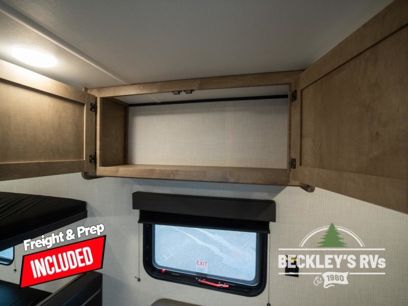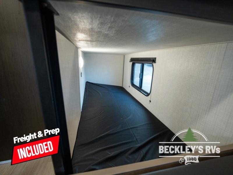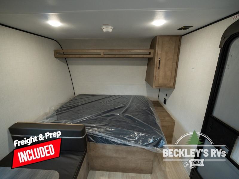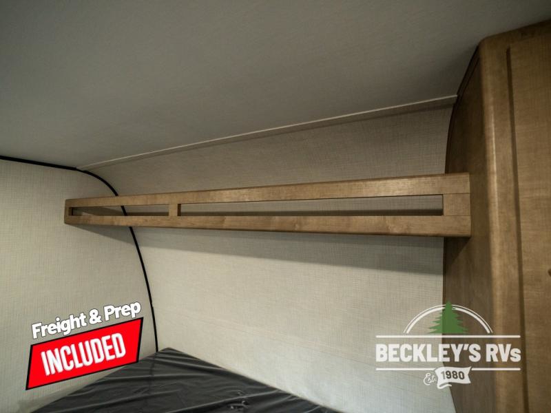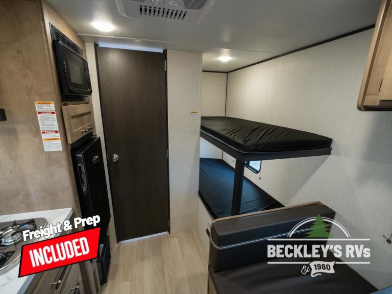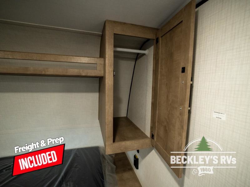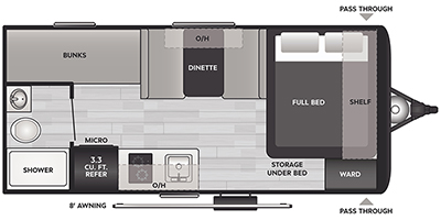 This travel trailer with rear corner bunk beds is sure to be a hit at the campground! While your guests or little ones take the bunks, you can enjoy the front full-size bed to yourselves. There is even storage under the bed, an overhead shelf, and a wardrobe for your things. The chef of your group can whip up meals on the two-burner cooktop or in the microwave oven, and there is a 3.3 cu. ft. 12V refrigerator to keep food fresh. A booth dinette provides a place to dine together, or you can take your plate outdoors to sit under the 8' power awning with LED lights!