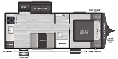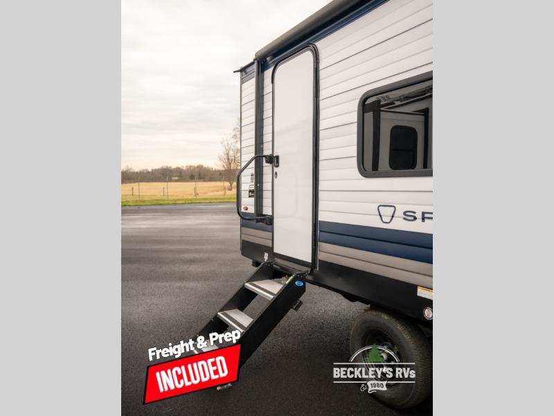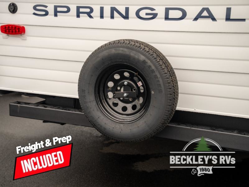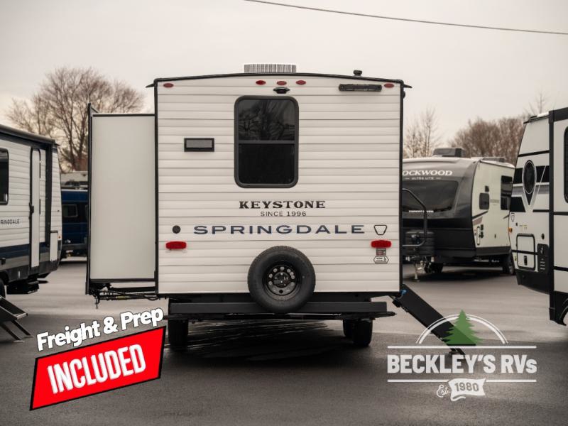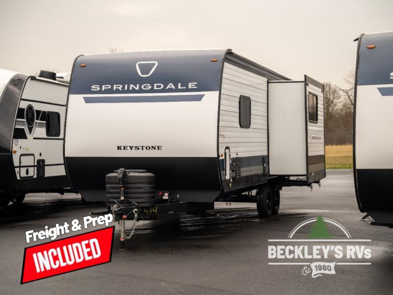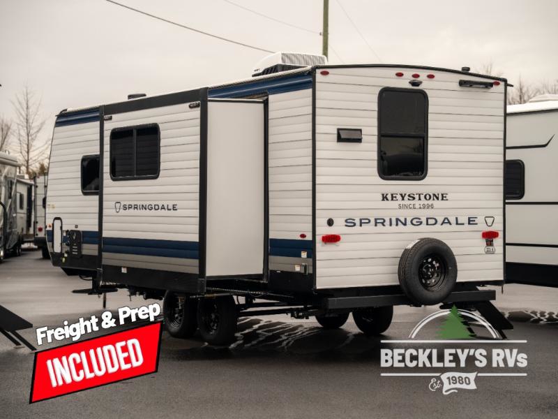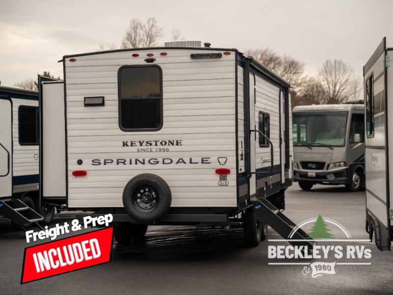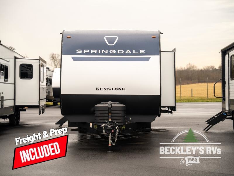 The Springdale travel trailers by Keystone will provide you and your family many great outdoor experiences and at-home comforts. Each one is constructed with a AlphaPly TPO roof membrane, Solid Step entry steps and XL tinted safety glass windows. There are also heavy-duty stabilizer jacks, along with an outside shower, a power awning with LED lights, and each model is SolarFlex ready if you choose to add solar power. Inside, you'll find blackout night shades, pressed membrane premium countertops, a stainless-steel sink, and LED lighting to keep your space well lit.