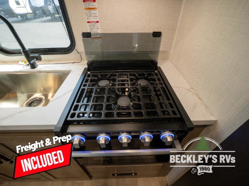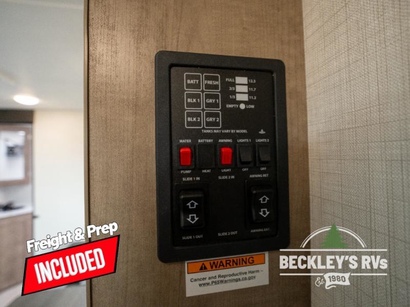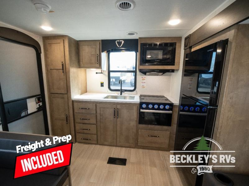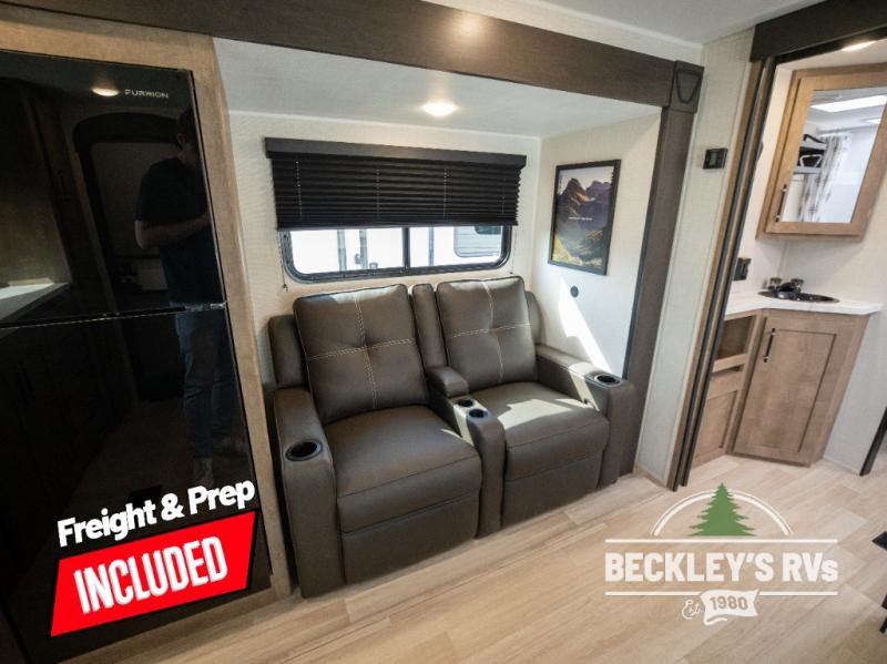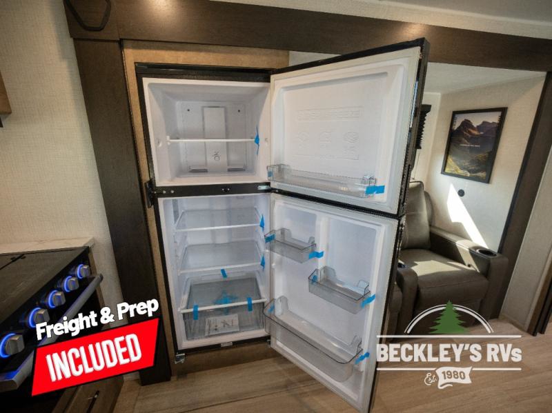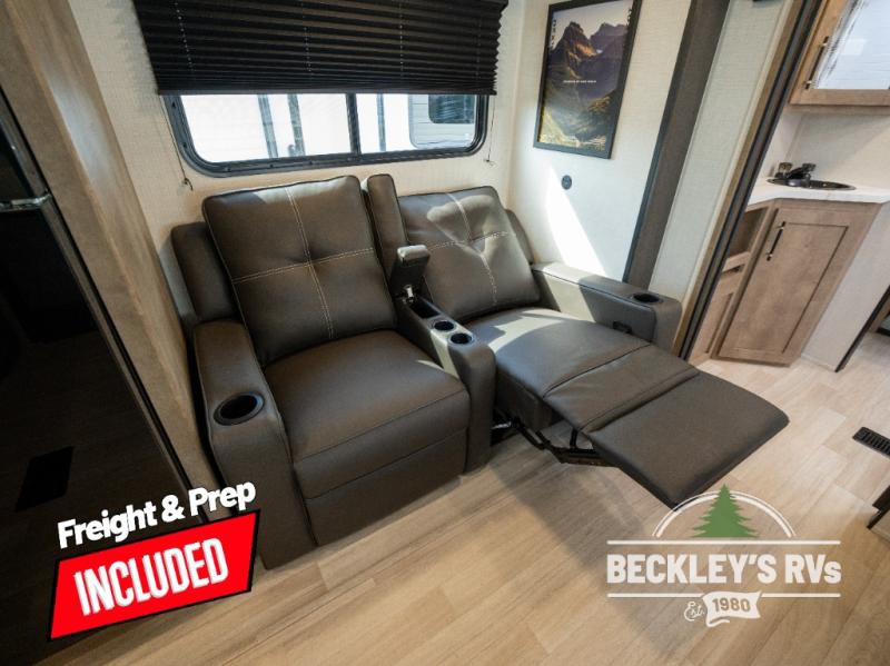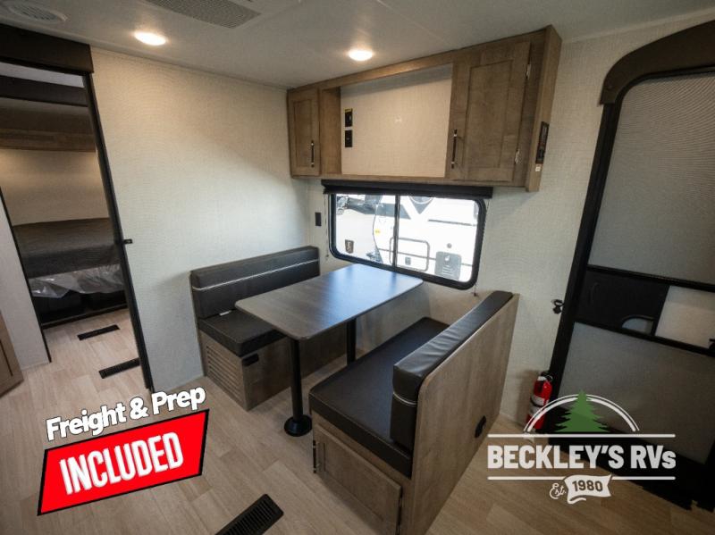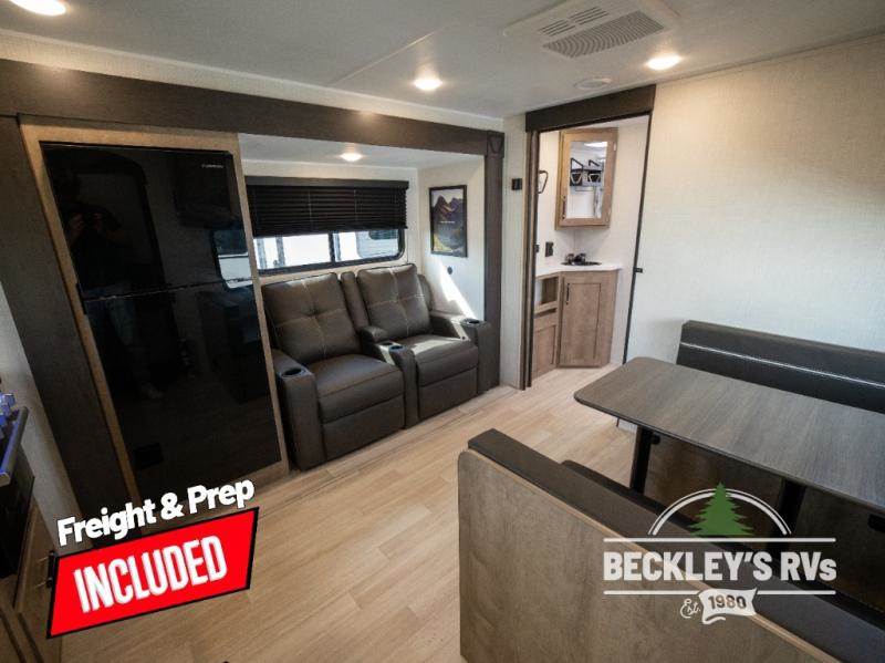 Comfort comes easy in this dual entry travel trailer! You can enter in through the front master bedroom with an Olympic RV queen bed or the rear kitchen with generous counter space and a pantry for snacks. A three-burner cooktop and air fryer microwave will let you make meals each day, and a booth dinette provides a place to dine together. There is also a slide out that houses the jack knife sofa, giving you more space to relax and stretch out! And don't overlook the walk-through bath that is easily accessible from the bedroom or main living area!