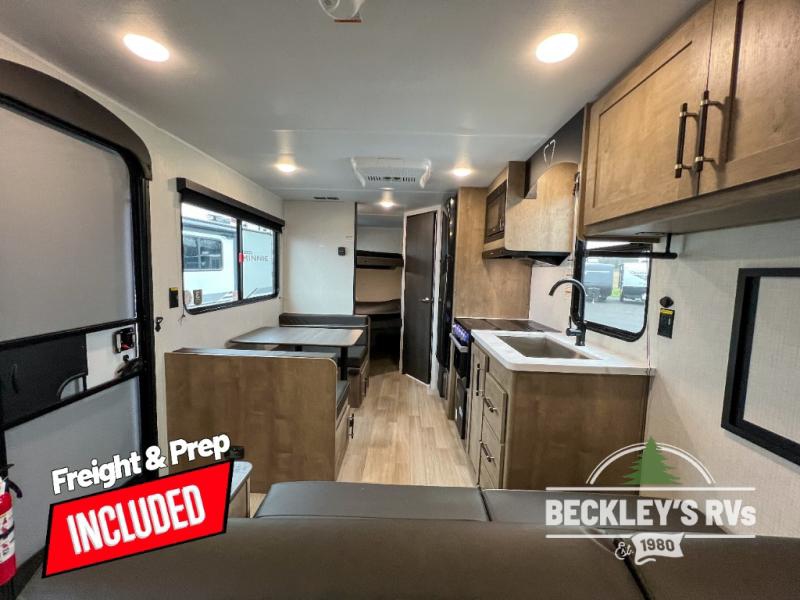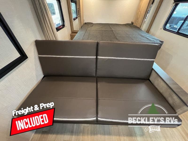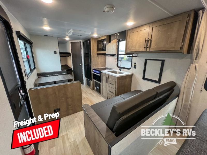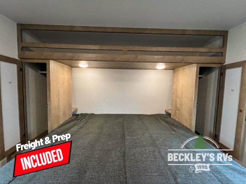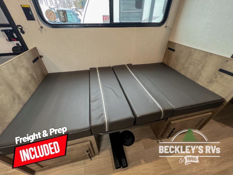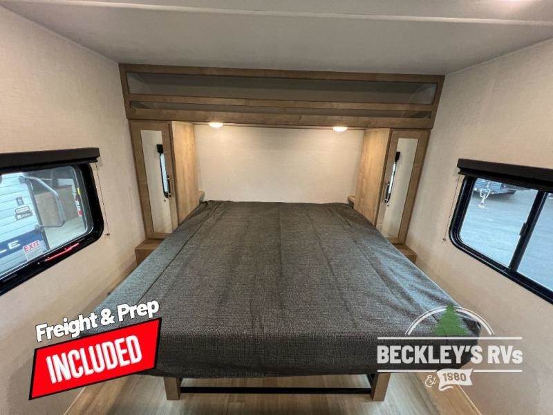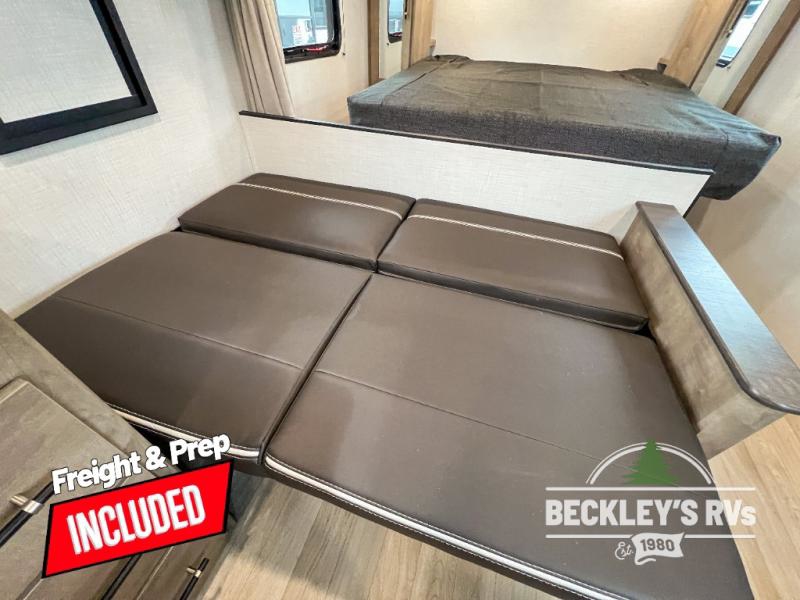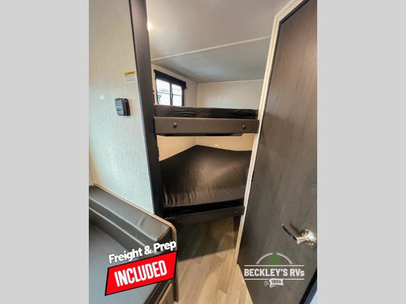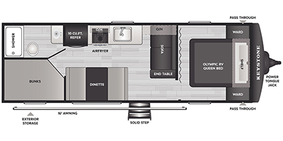 Plan fun trips at the campground in this travel trailer with double-size bunks for your guests or little ones, plus a front bedroom with a walk-around Olympic RV queen bed! The dual bedside wardrobes and overhead shelf will keep your personal belongings organized, and the exterior pass-through will be perfect for fishing poles and camp gear. A full kitchen includes a three-burner cooktop and an air fryer microwave to cook your best meals, and a booth dinette provides a place to dine at. There is also a sofa with an end table where you can enjoy your morning coffee at.