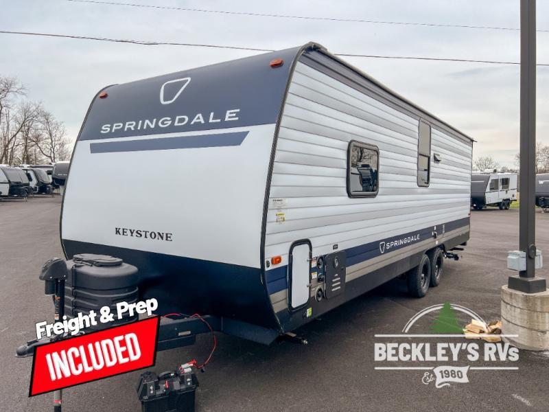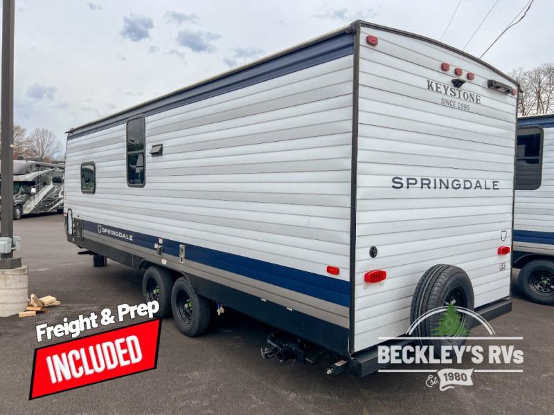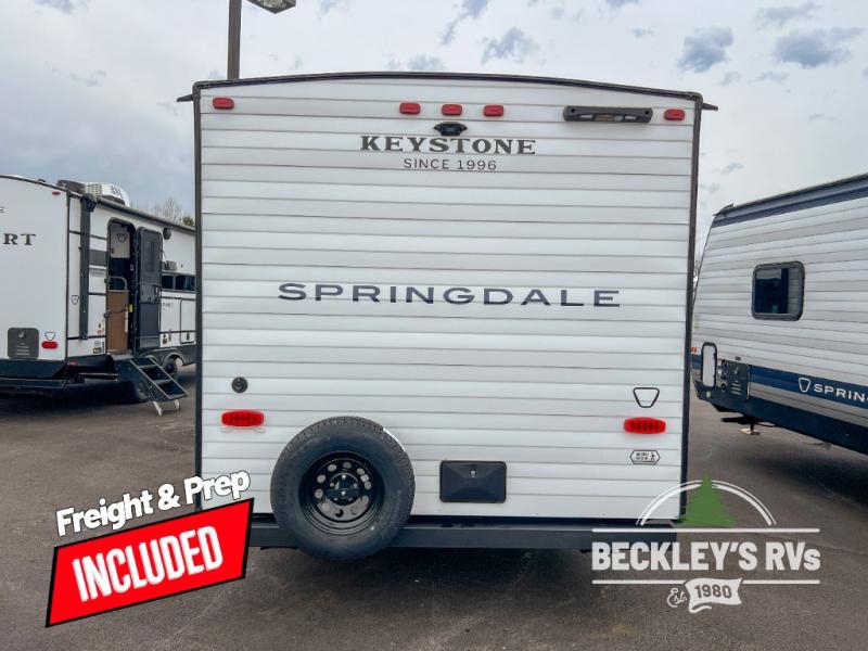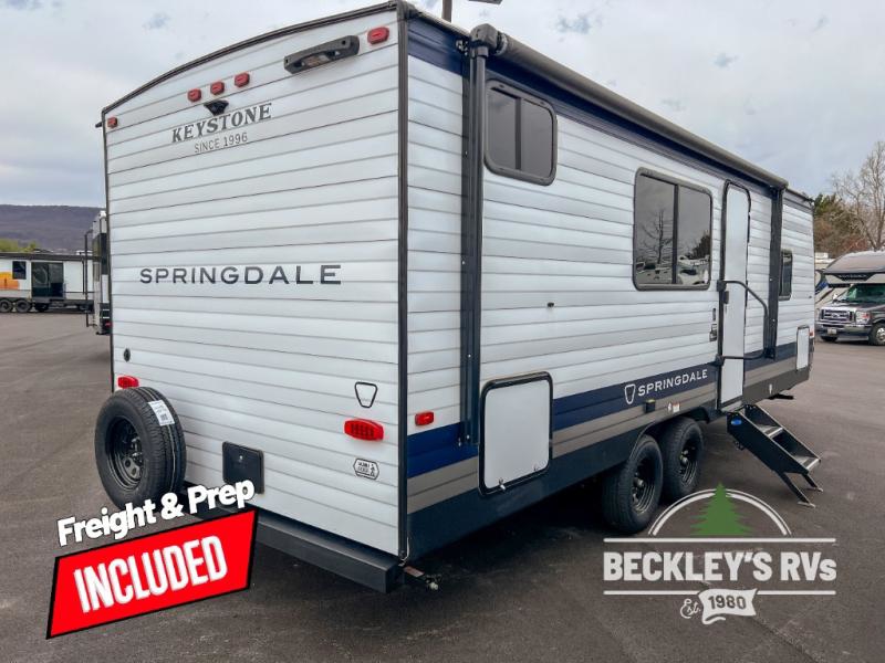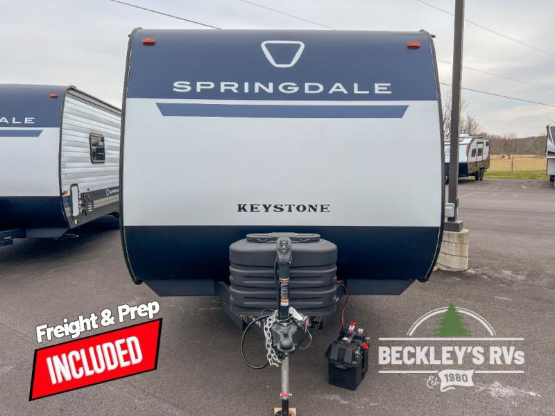The Springdale travel trailers by Keystone will provide you and your family many great outdoor experiences and at-home comforts. Each one is constructed with a AlphaPly TPO roof membrane, Solid Step entry steps and XL tinted safety glass windows. There are also heavy-duty stabilizer jacks, along with an outside shower, a power awning with LED lights, and each model is SolarFlex ready if you choose to add solar power. Inside, you'll find blackout night shades, pressed membrane premium countertops, a stainless-steel sink, and LED lighting to keep your space well lit.