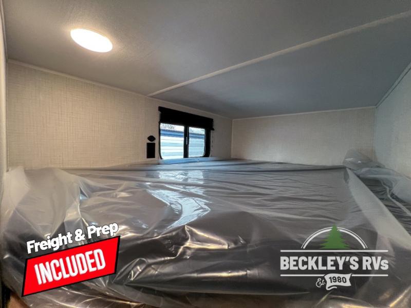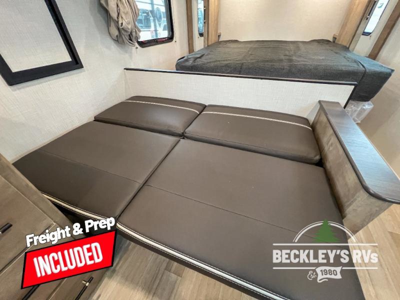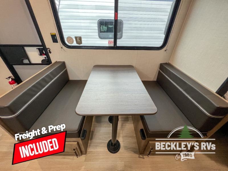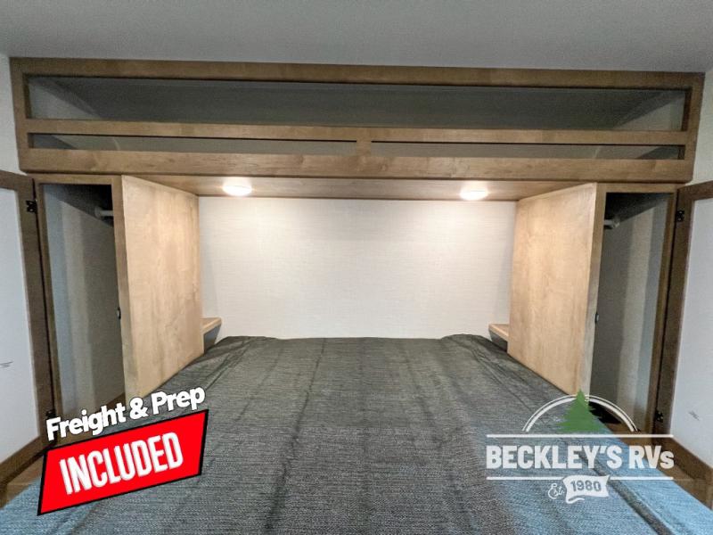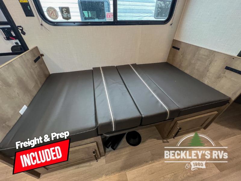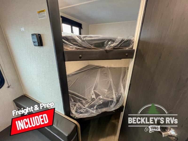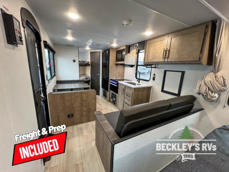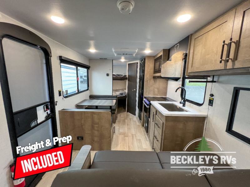 Plan fun trips at the campground in this travel trailer with double-size bunks for your guests or little ones, plus a front bedroom with a walk-around Olympic RV queen bed! The dual bedside wardrobes and overhead shelf will keep your personal belongings organized, and the exterior pass-through will be perfect for fishing poles and camp gear. A full kitchen includes a three-burner cooktop and an air fryer microwave to cook your best meals, and a booth dinette provides a place to dine at. There is also a sofa with an end table where you can enjoy your morning coffee at.