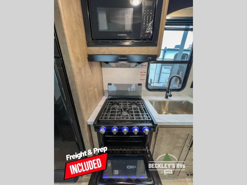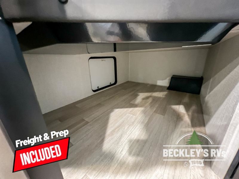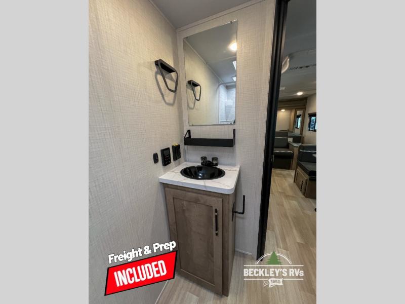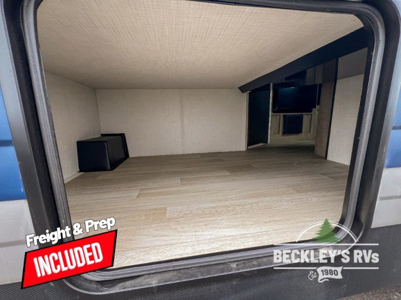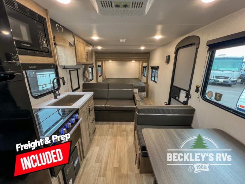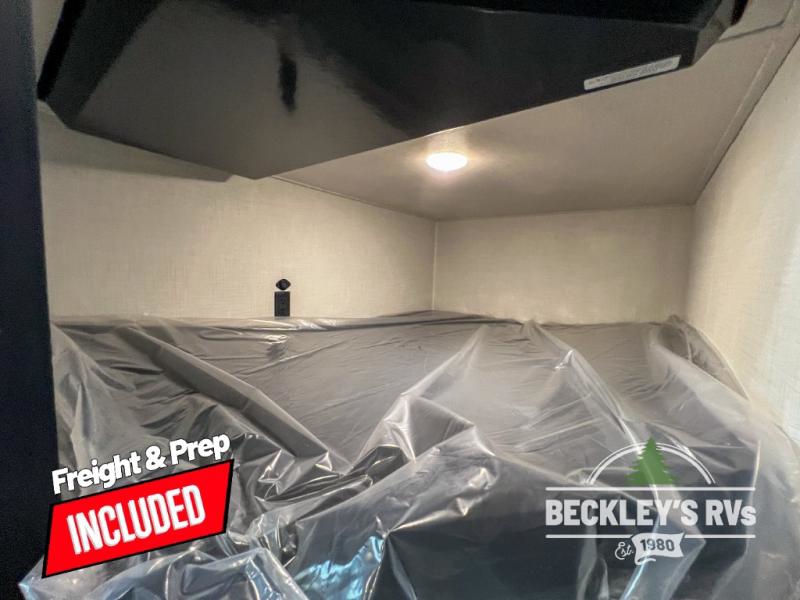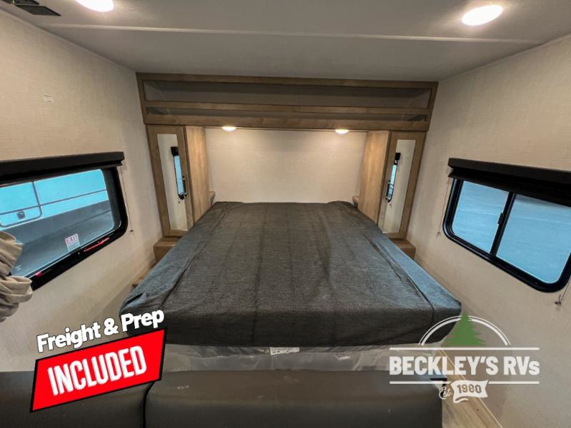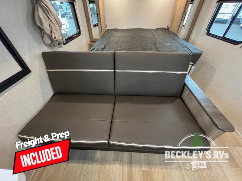 Plan fun trips at the campground in this travel trailer with double-size bunks for your guests or little ones, plus a front bedroom with a walk-around Olympic RV queen bed! The dual bedside wardrobes and overhead shelf will keep your personal belongings organized, and the exterior pass-through will be perfect for fishing poles and camp gear. A full kitchen includes a three-burner cooktop and an air fryer microwave to cook your best meals, and a booth dinette provides a place to dine at. There is also a sofa with an end table where you can enjoy your morning coffee at.