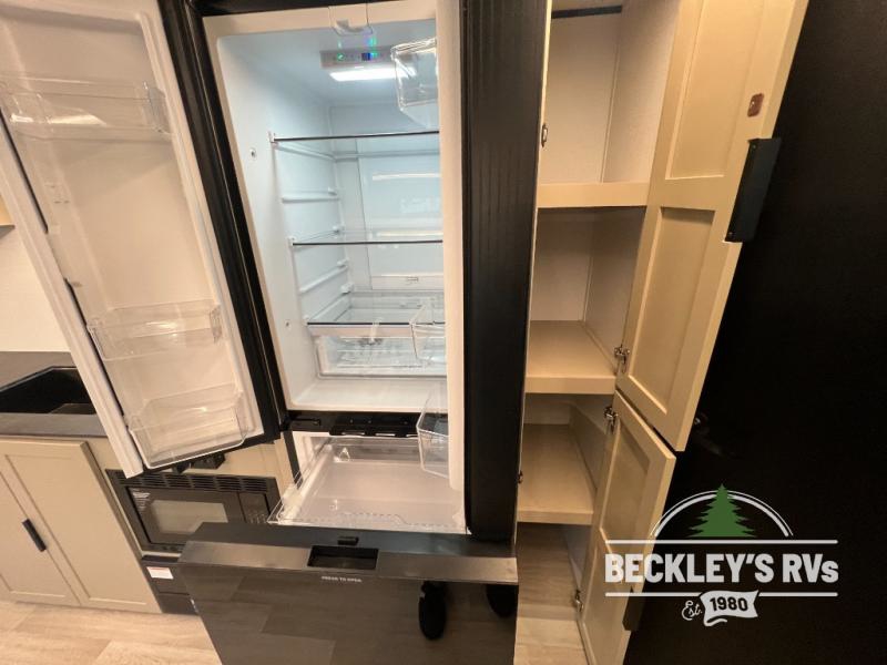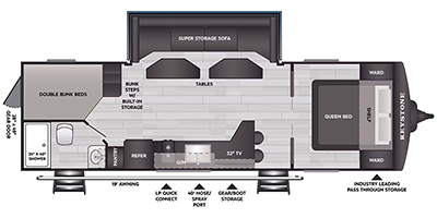 This trailer features double-size bunk beds, perfect for kids or adults, and a front bedroom with a queen bed, shelf, and wardrobes on each side. The living area is a hub of activity, with a super storage sofa that doubles as a comfortable seating area, and two tables that provide plenty of space for meals, games, or working on projects. The kitchen is well-equipped with a refrigerator, overhead cabinets, and a pantry ideal for storing your favorite seasonings. Plus, a 32" TV provides entertainment for the whole family, perfect for relaxing after a long day of exploring, and the full bathroom is a convenient and essential feature, providing a private space to freshen up after a long day.