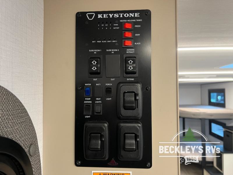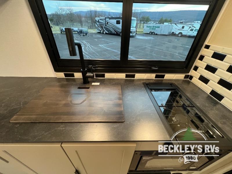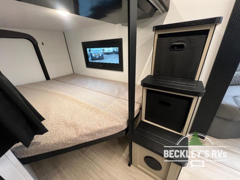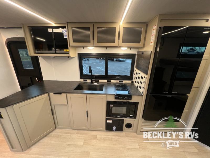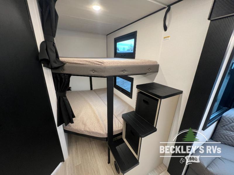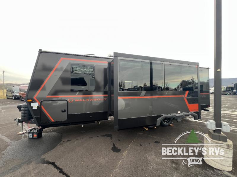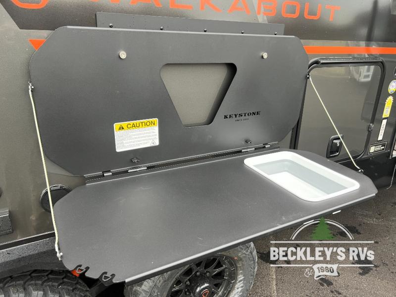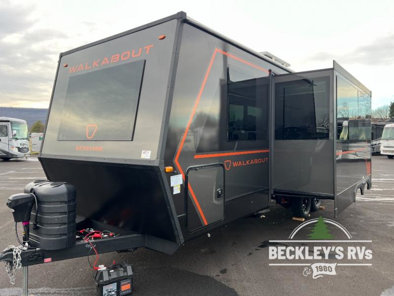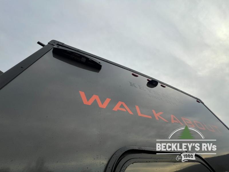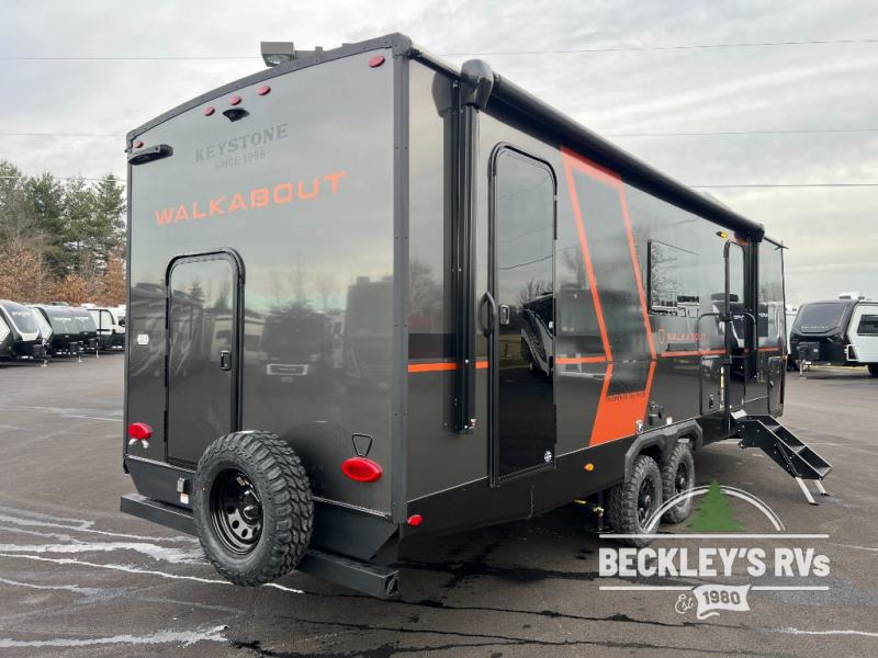 Each Keystone Walkabout travel trailer features a rugged automotive-grade aluminum exterior, designed to withstand the rigors of travel. The 11-gauge aluminum powder corner rails add strength and durability while keeping the trailer lightweight. It is known that storage is key to a comfortable trip. That's why these trailers are designed with maximum storage in mind, providing ample space for all your gear and equipment. You'll also feel like you're gliding down the road, not bouncing along, thanks to the Kurt Touring suspension that ensures a smooth ride, even on rough terrain. Further, the composite solid steps are durable and easy to clean, while the composite Thinscape countertop offers a stylish, low-maintenance surface for food prep and relaxation. Finally, with the 110-volt outlets throughout the trailer, you'll have plenty of power to keep your devices charged and your appliances running.