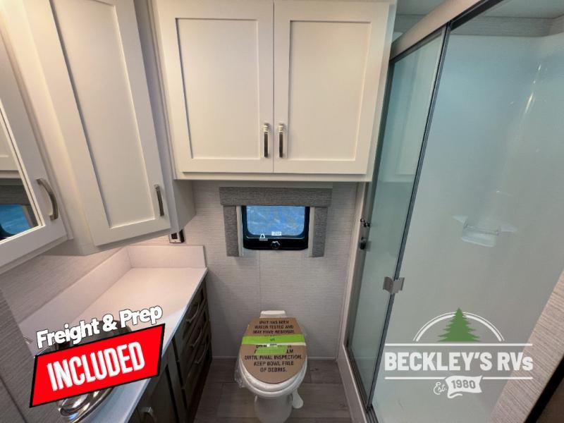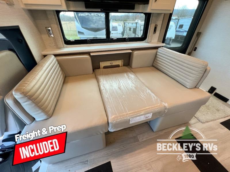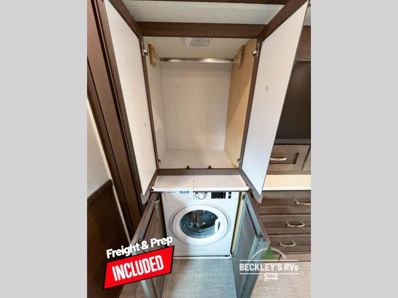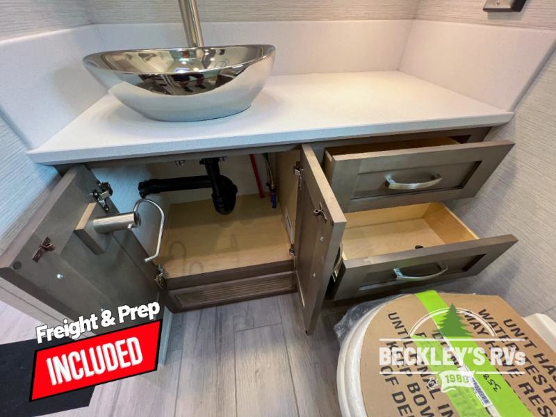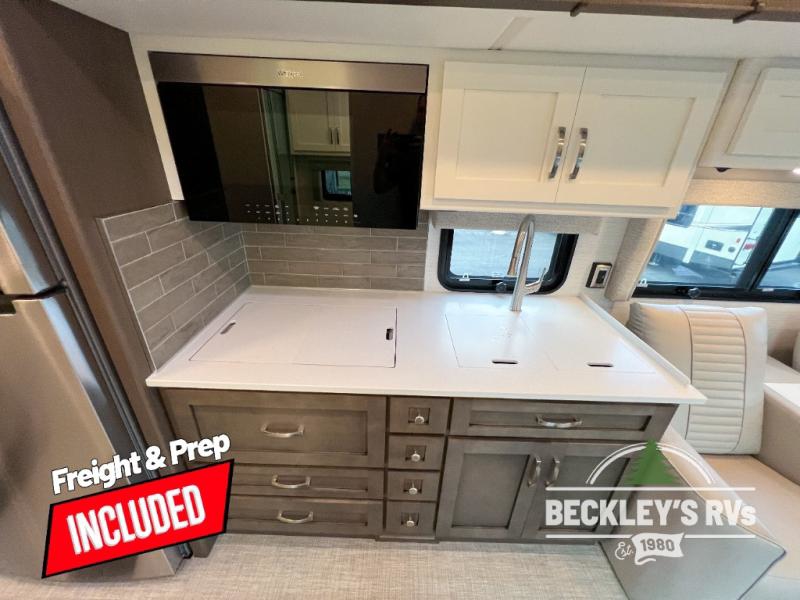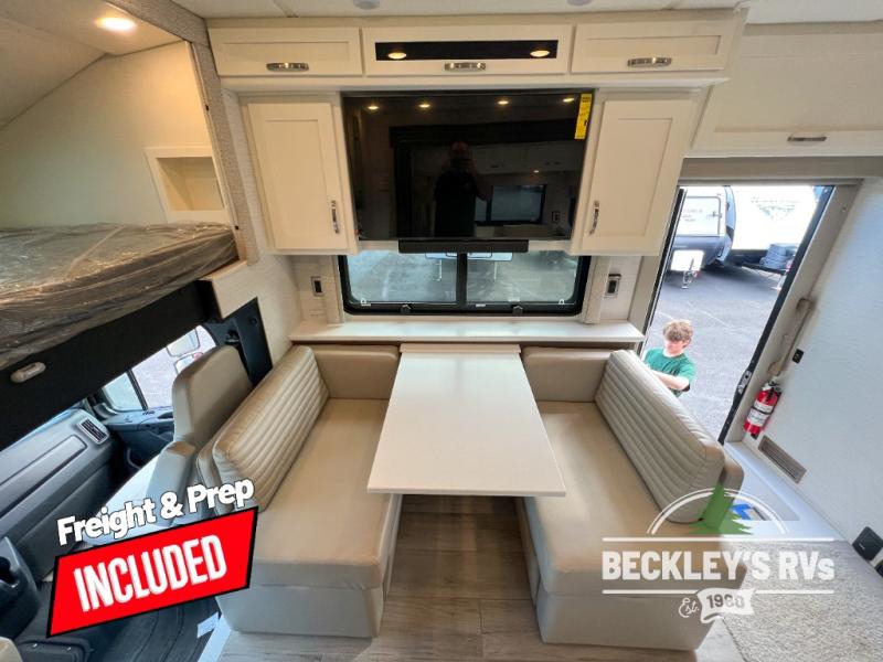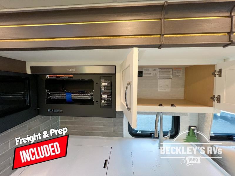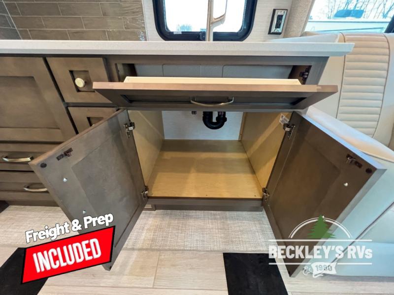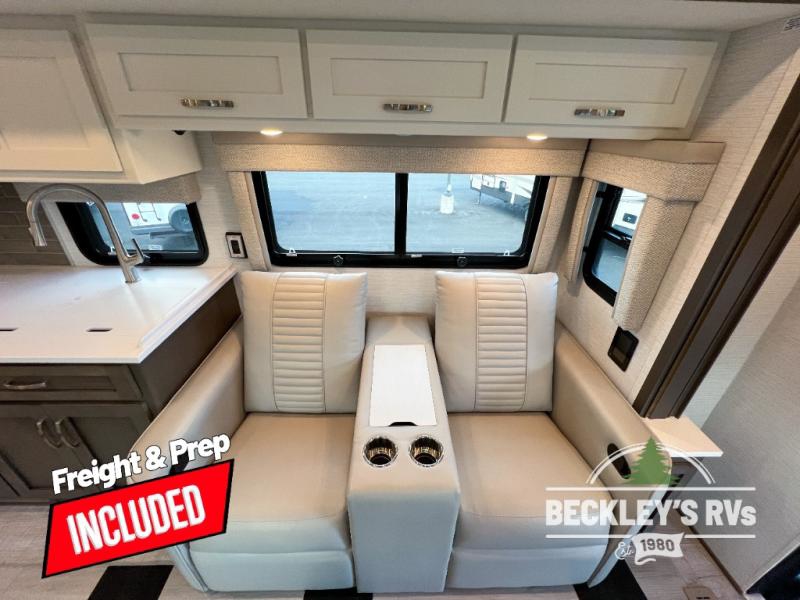 This motorhome is perfect for first time RVers who are looking for a smaller floorplan! The rear private bedroom has a retracting king bed slide across from shirt wardrobes and dresser with an optional washer and dryer below it. If you need more sleeping space then you can utilize the bunk over cab, transform the booth dinette, or lay on the 68" sofa comfort lounge. The chef can prepare their best home cooked meals with the microwave convection oven with air fryer and 18 cu. ft. residential refrigerator, plus you could add the optional induction cooktop or optional dishwasher for easy cleanup. After a long day of traveling, you can easily freshen up in the full bathroom with the 40" x 30" shower and store any necessary toiletries in the overhead cabinets!