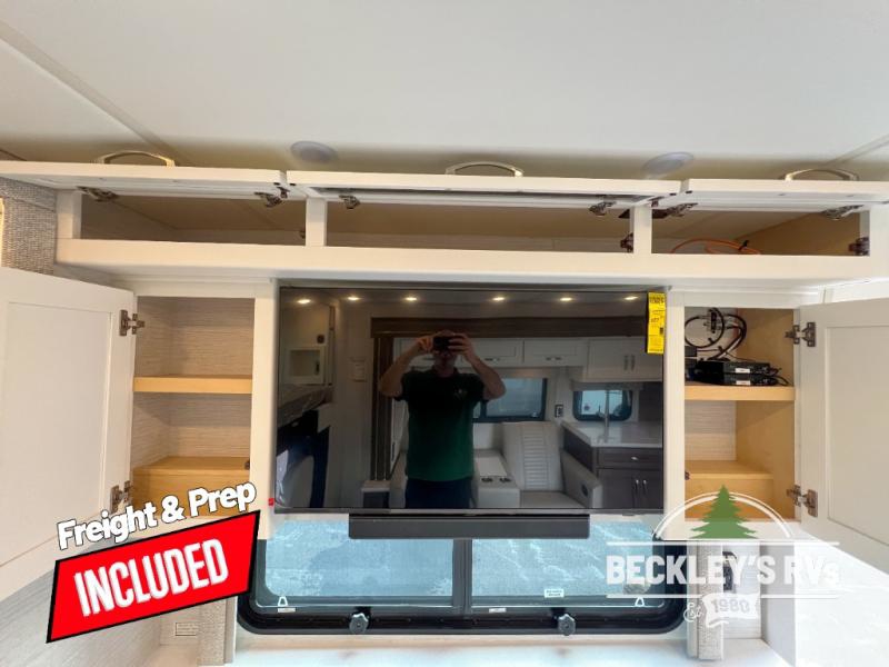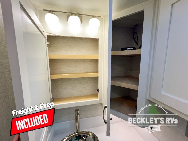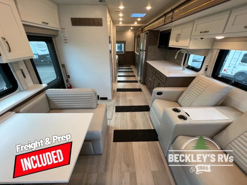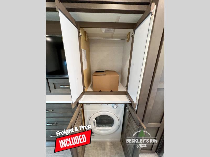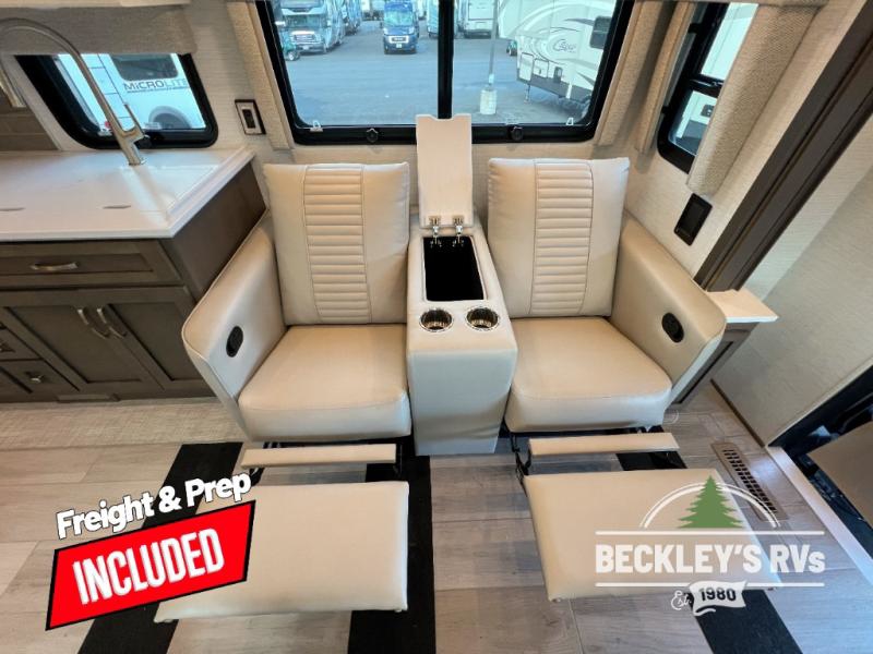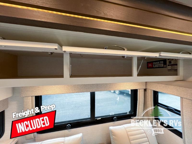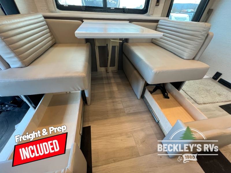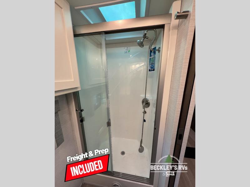 This motorhome is perfect for first time RVers who are looking for a smaller floorplan! The rear private bedroom has a retracting king bed slide across from shirt wardrobes and dresser with an optional washer and dryer below it. If you need more sleeping space then you can utilize the bunk over cab, transform the booth dinette, or lay on the 68" sofa comfort lounge. The chef can prepare their best home cooked meals with the microwave convection oven with air fryer and 18 cu. ft. residential refrigerator, plus you could add the optional induction cooktop or optional dishwasher for easy cleanup. After a long day of traveling, you can easily freshen up in the full bathroom with the 40" x 30" shower and store any necessary toiletries in the overhead cabinets!