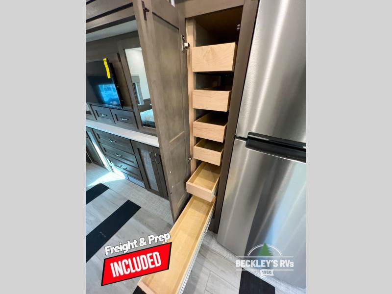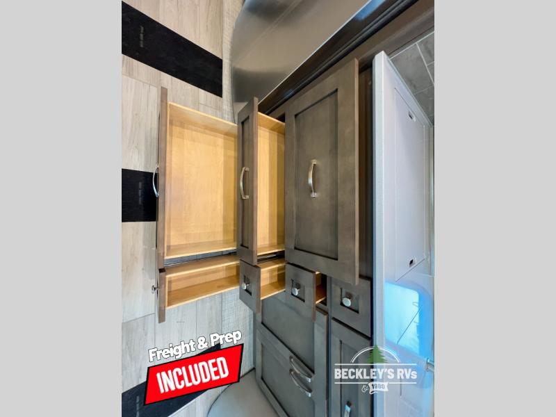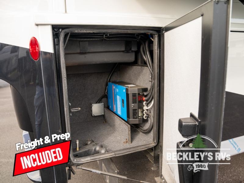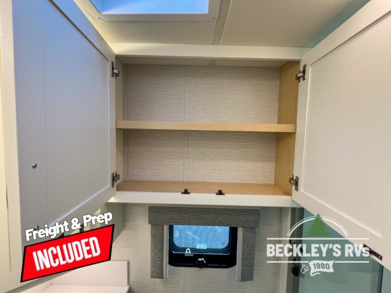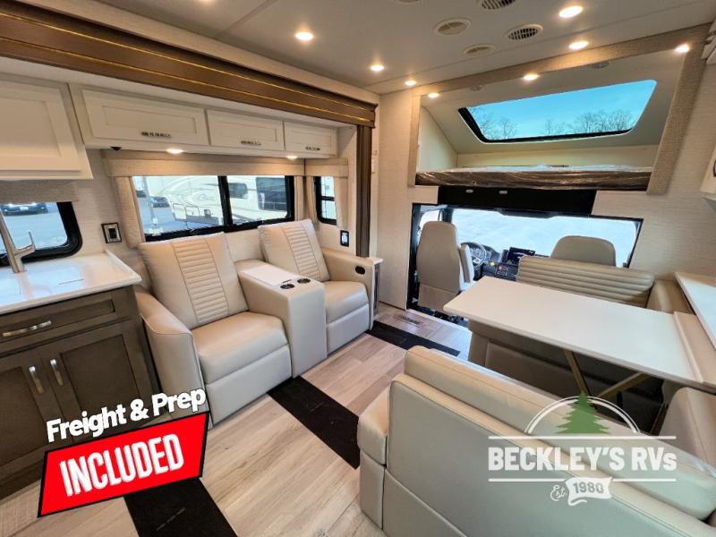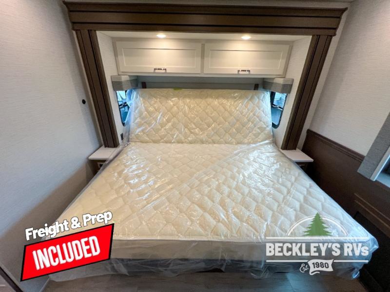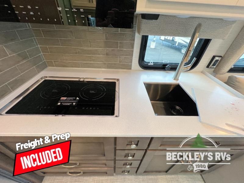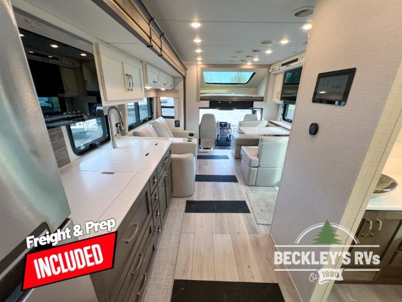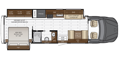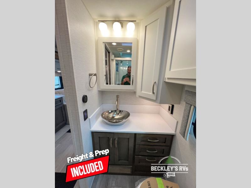 This motorhome is perfect for first time RVers who are looking for a smaller floorplan! The rear private bedroom has a retracting king bed slide across from shirt wardrobes and dresser with an optional washer and dryer below it. If you need more sleeping space then you can utilize the bunk over cab, transform the booth dinette, or lay on the 68" sofa comfort lounge. The chef can prepare their best home cooked meals with the microwave convection oven with air fryer and 18 cu. ft. residential refrigerator, plus you could add the optional induction cooktop or optional dishwasher for easy cleanup. After a long day of traveling, you can easily freshen up in the full bathroom with the 40" x 30" shower and store any necessary toiletries in the overhead cabinets!
