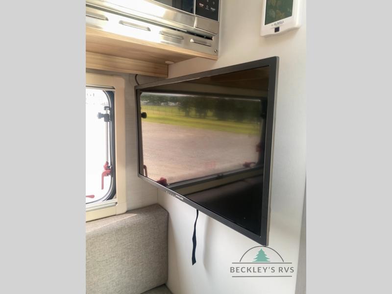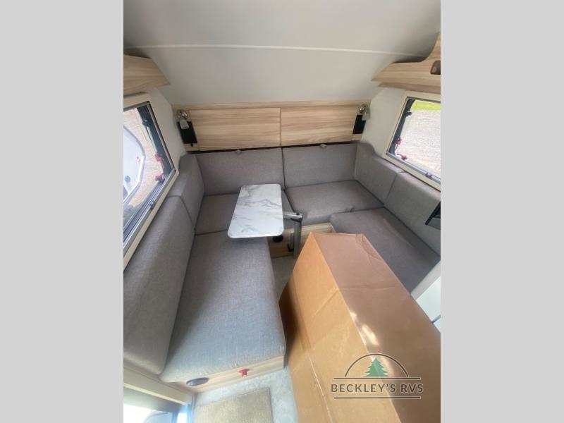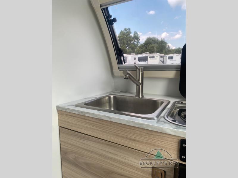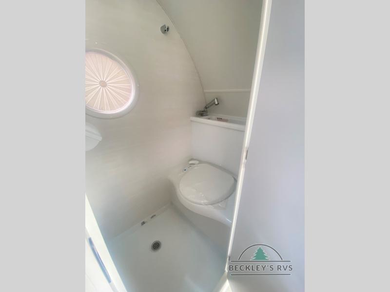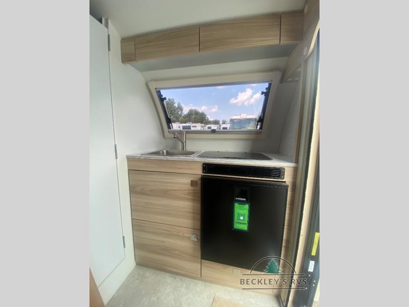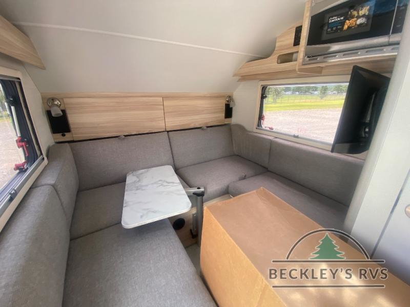 With any TAB 320 teardrop trailer by nüCamp RV, the interior offers premium soft-close cabinetry, a front window, plus a wet bath with a cassette toilet and a molded sink. They are also built with composite flooring and a molded underbelly shield for protection against rock and debris during your journeys. The iconic teardrop design offers an easy-to-tow unit with amenities found in much bigger trailers. Some other highlights include the Alde heating/hot water system, the central air conditioner, 180 watt solar panel, and the Nautilus water system with an external shower.