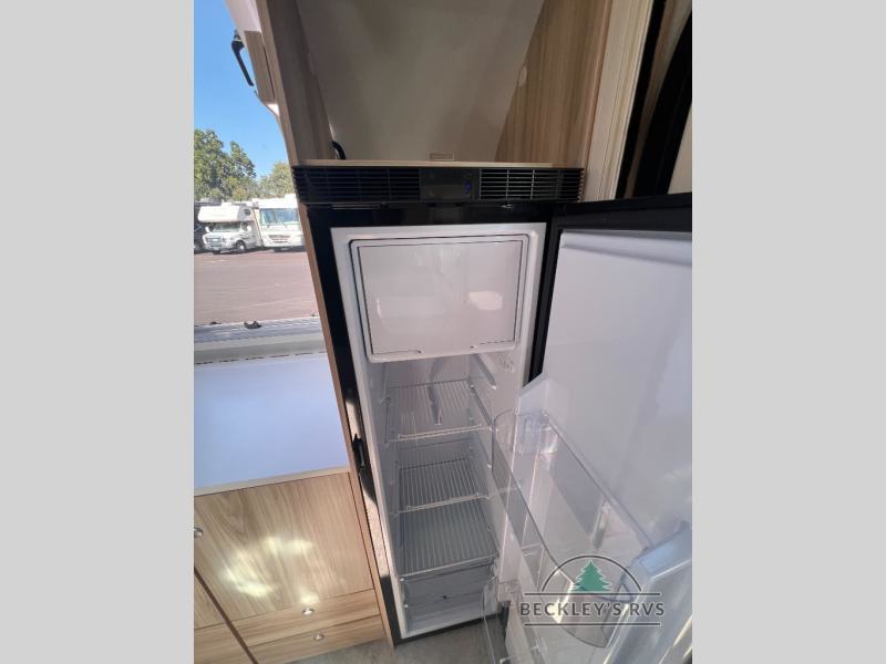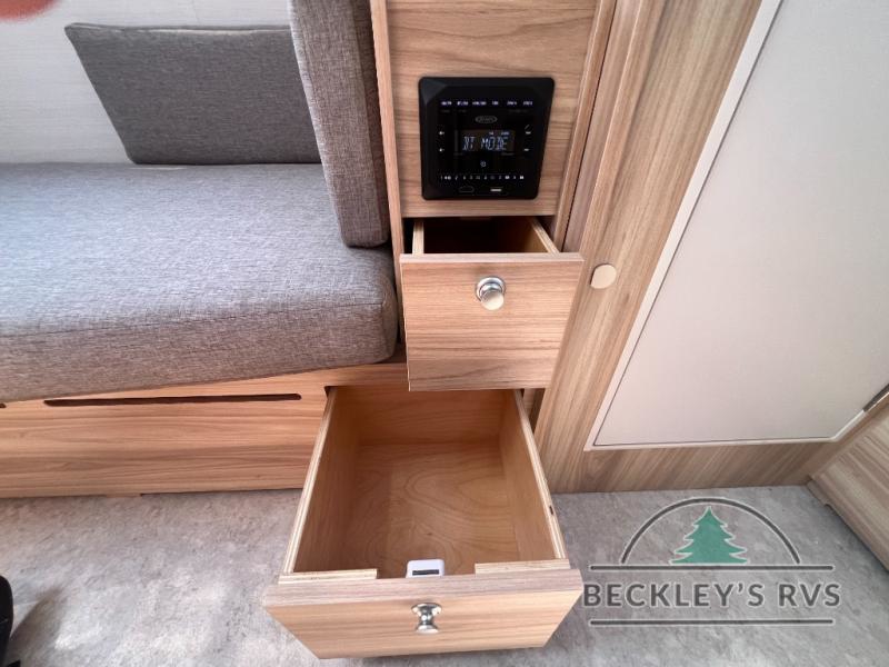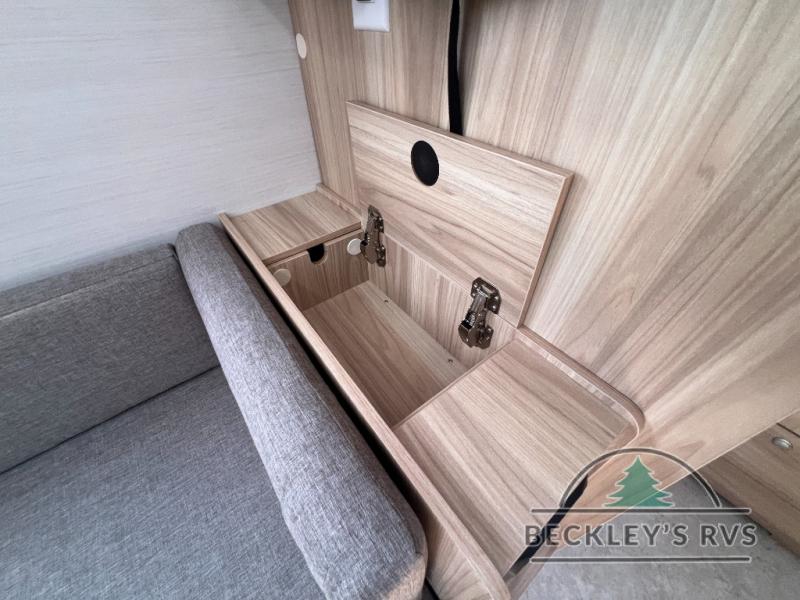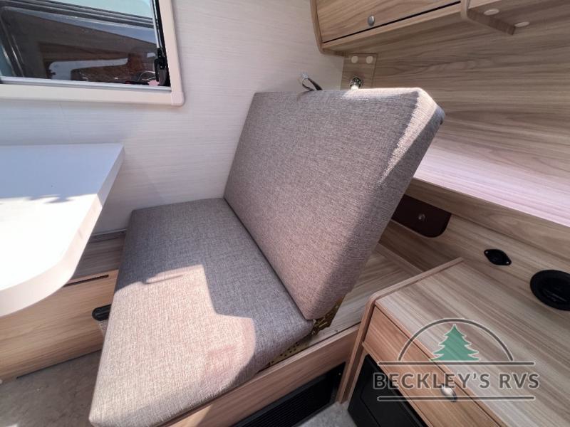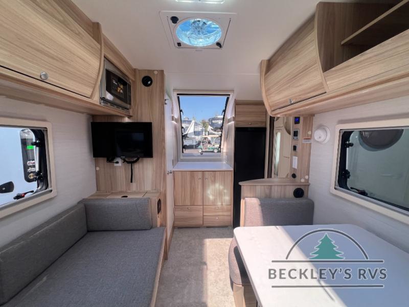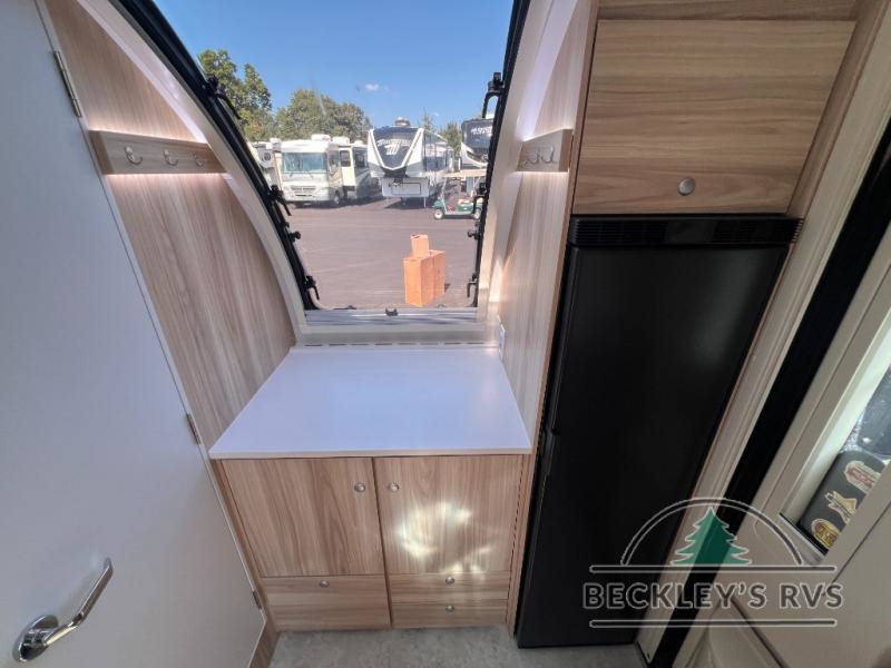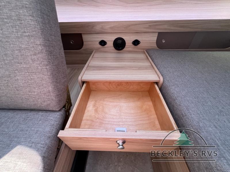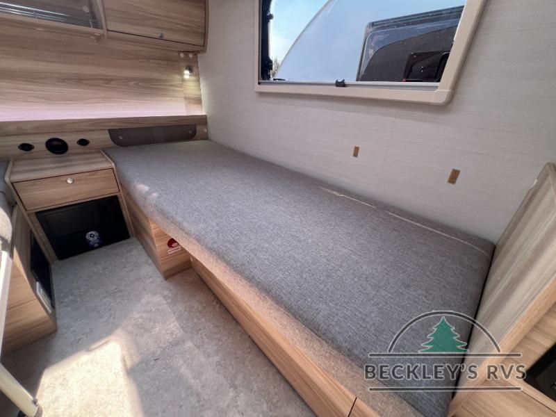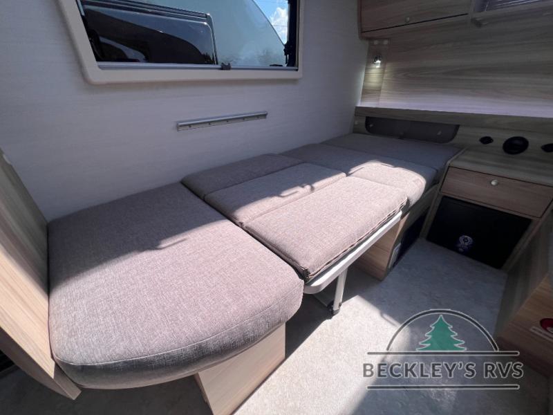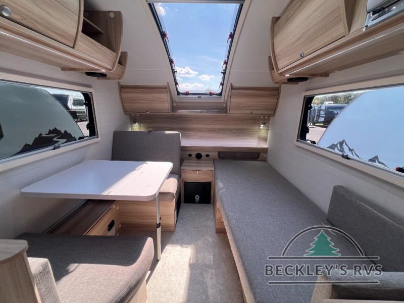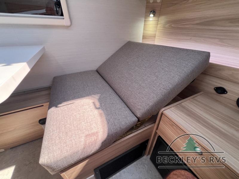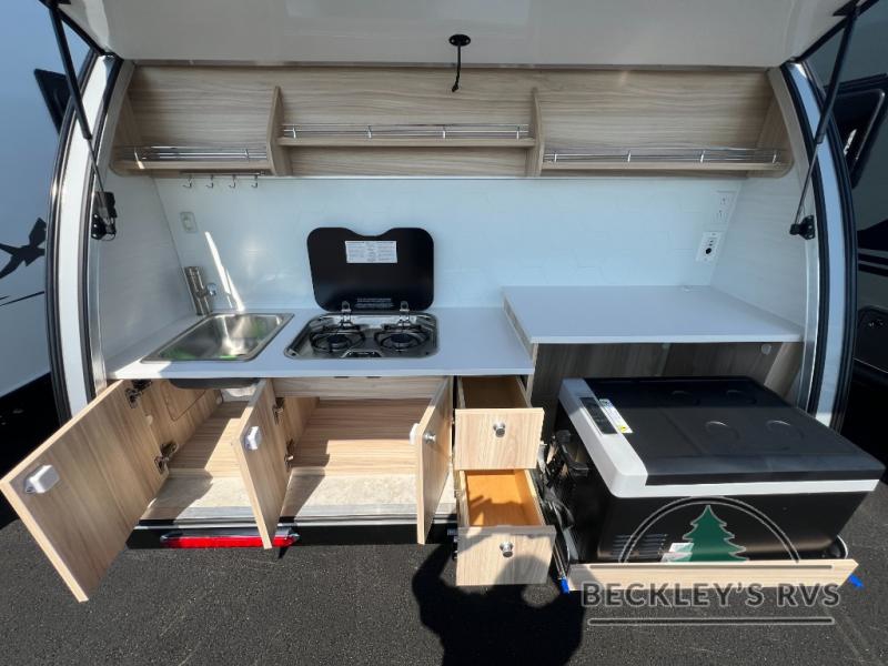 You're going to love camping in this teardrop clamshell trailer! Once you arrive at the campground, you can make lunch on the exterior rear hatch kitchen. There is a two-burner glass-top stove and a 30L 12-volt cooler here to quickly make lunch and grab a cold drink. The interior 5 cu. ft. 12-volt compressor refrigerator will provide more food storage, and an optional microwave can be added inside for the option to heat up quick meals indoors. You're sure to get a great night's rest on the twin-size bed, and the booth dinette can convert to a second twin-size bed so you can sleep two comfortably. The optional Black Canyon Upgrade can be added that includes a solar upgrade to dual 190W panels, holding tank heaters and underglow lights.