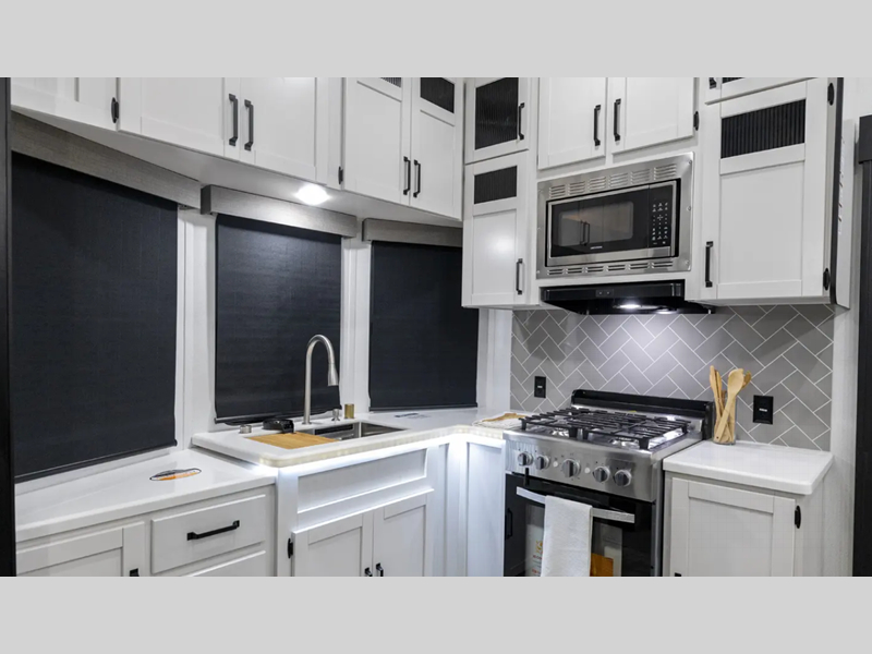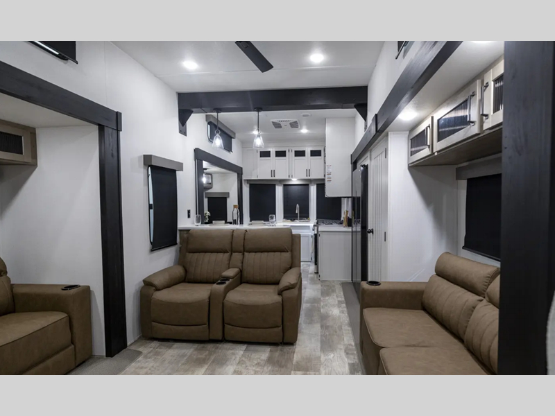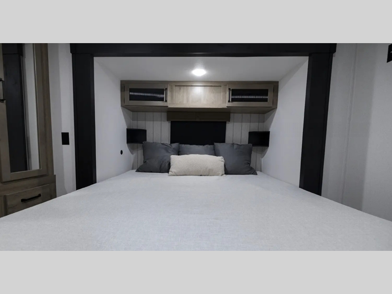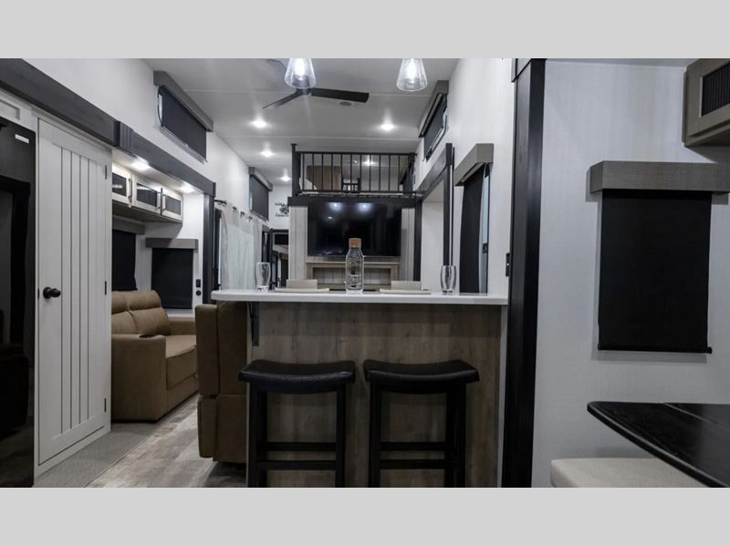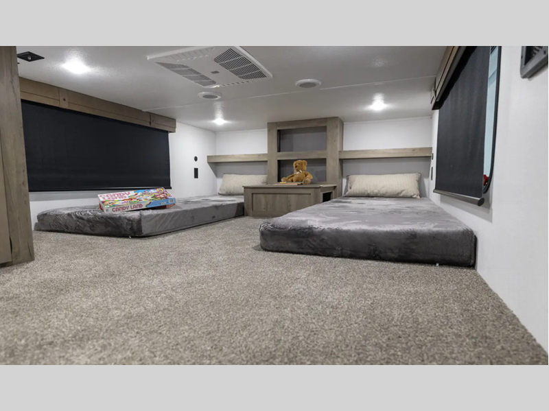 This is the perfect destination trailer for a larger group since it can sleep up to nine campers each night. The little ones will love the double loft areas with three bunk mats and storage space for their things, while you take the rear private bedroom. There is a king bed slide out here, along with a wardrobe/closet for your clothes, plus a second closet with the option to add washer and dryer prep. Everyone can meet in the middle living room to relax on the dual sofas or recliners across from the fireplace and entertainment center. Head to the front of the unit where you'll find the kitchen that includes ample counter space to prep meals, a residential style refrigerator and pantry for food storage, and a free-standing table to dine at. There is also a breakfast nook that overlooks the living area so you can visit with the cook and watch a movie at the same time!