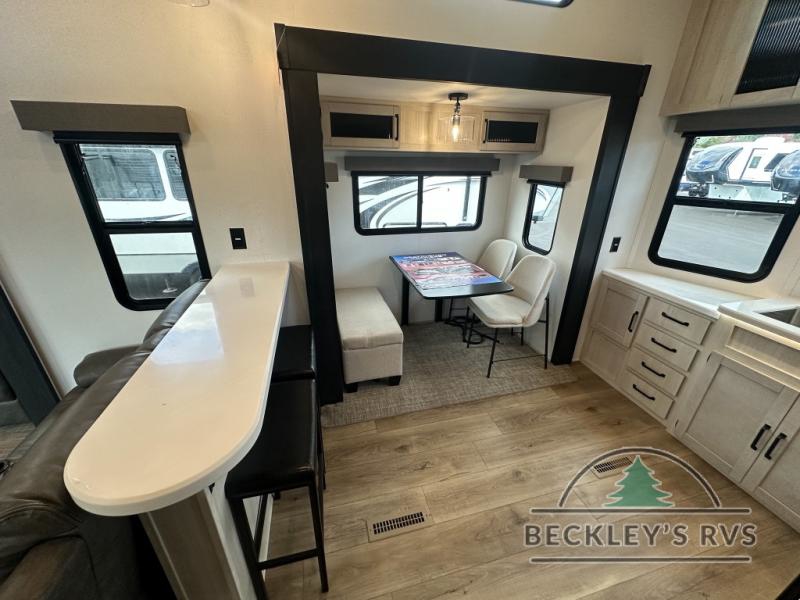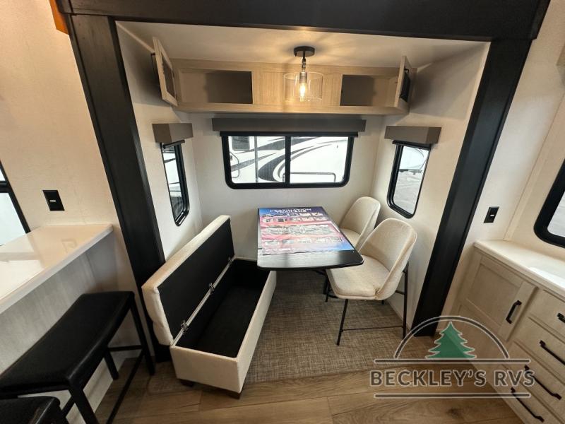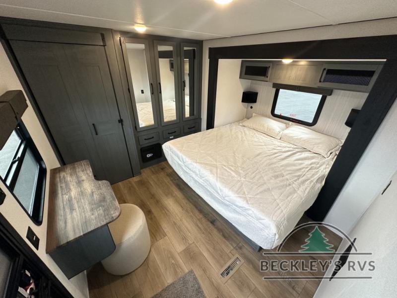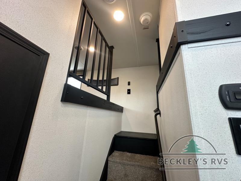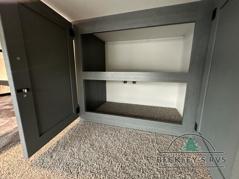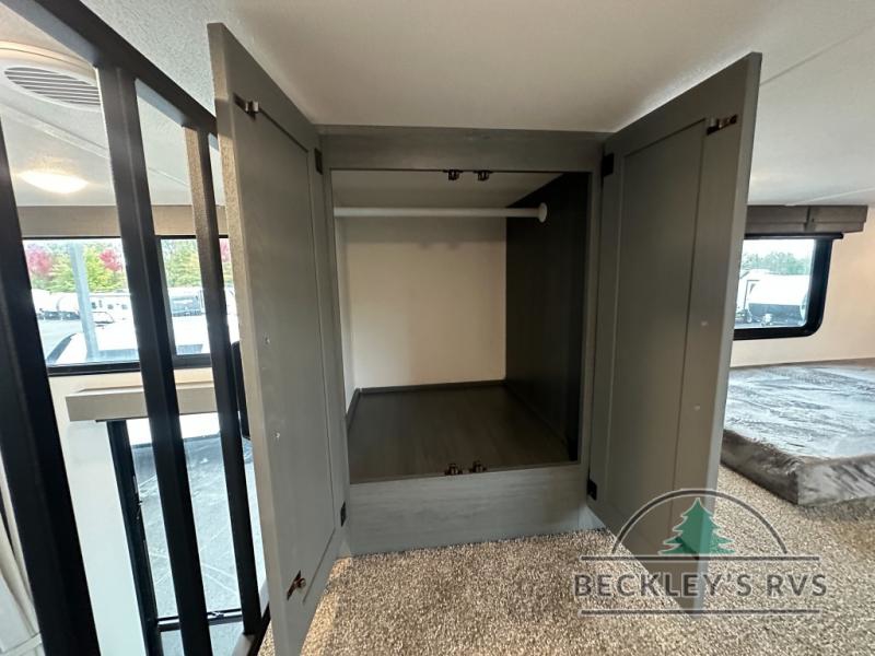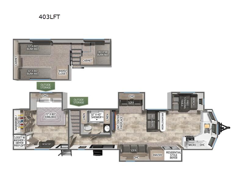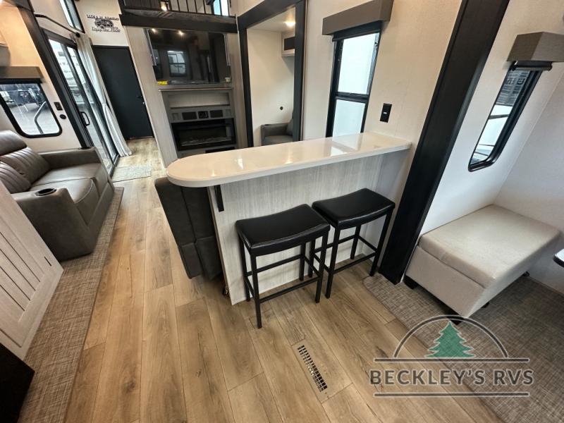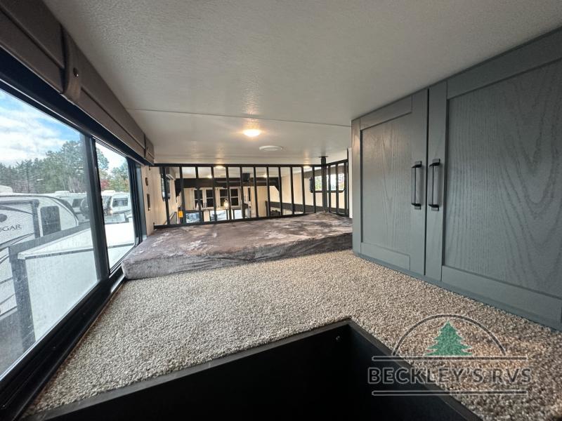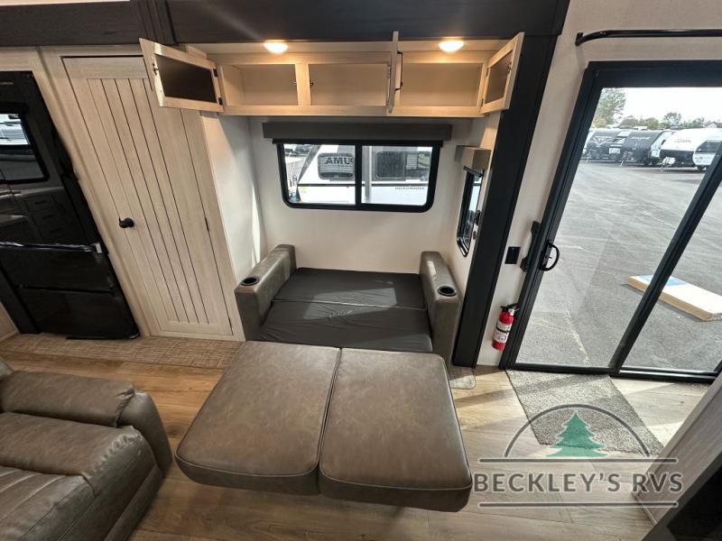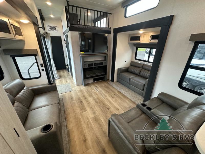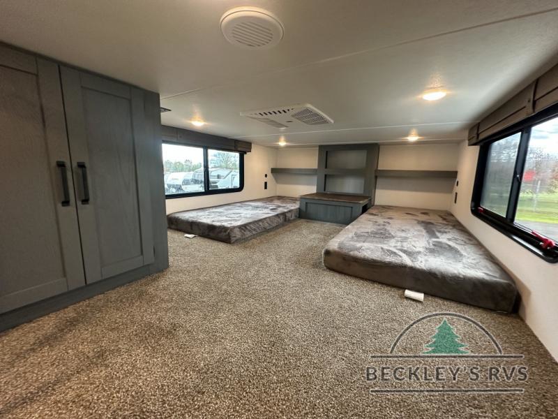 This is the perfect destination trailer for a larger group since it can sleep up to nine campers each night. The little ones will love the double loft areas with three bunk mats and storage space for their things, while you take the rear private bedroom. There is a king bed slide out here, along with a wardrobe/closet for your clothes, plus a second closet with the option to add washer and dryer prep. Everyone can meet in the middle living room to relax on the dual sofas or recliners across from the fireplace and entertainment center. Head to the front of the unit where you'll find the kitchen that includes ample counter space to prep meals, a residential style refrigerator and pantry for food storage, and a free-standing table to dine at. There is also a breakfast nook that overlooks the living area so you can visit with the cook and watch a movie at the same time!