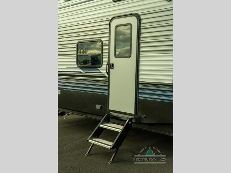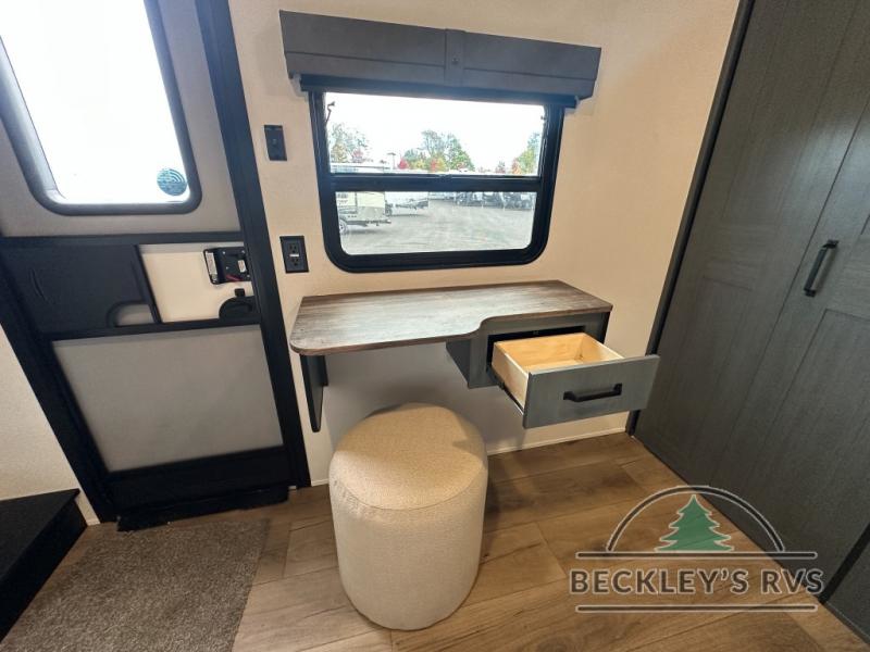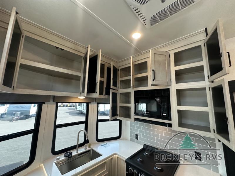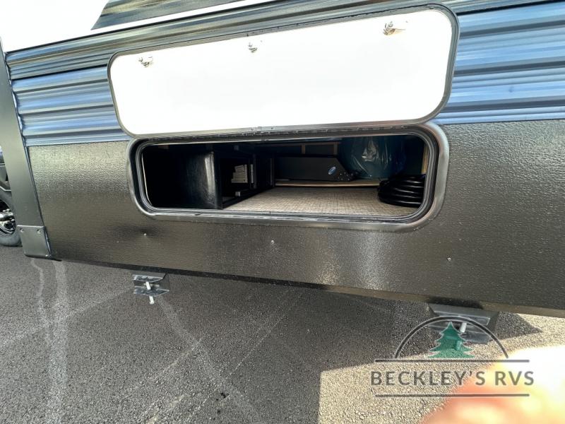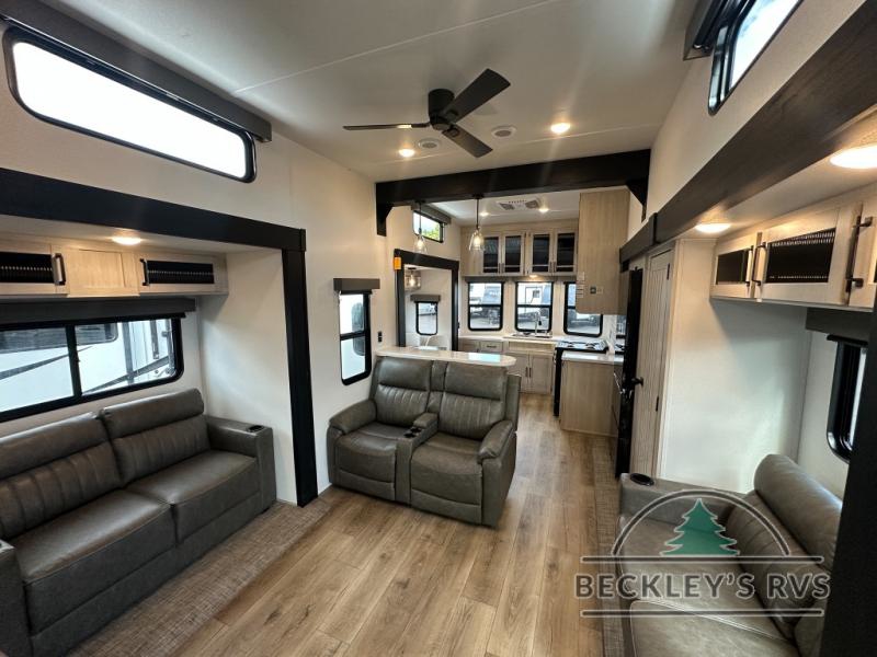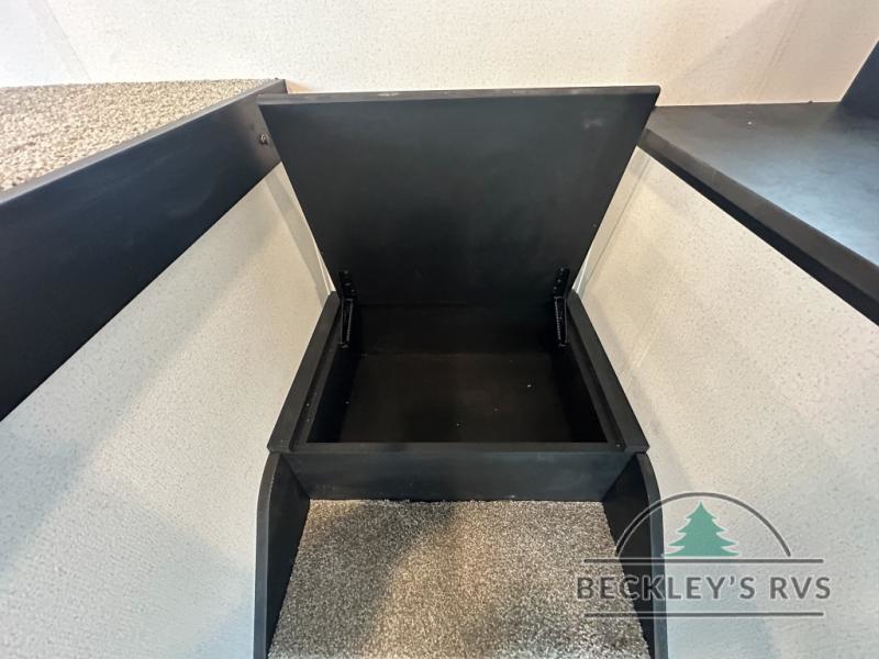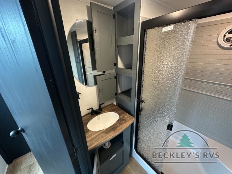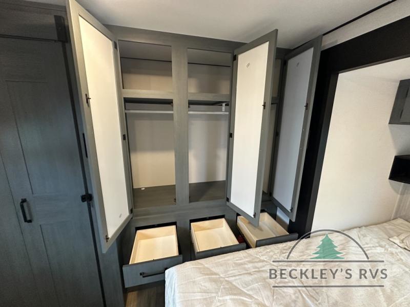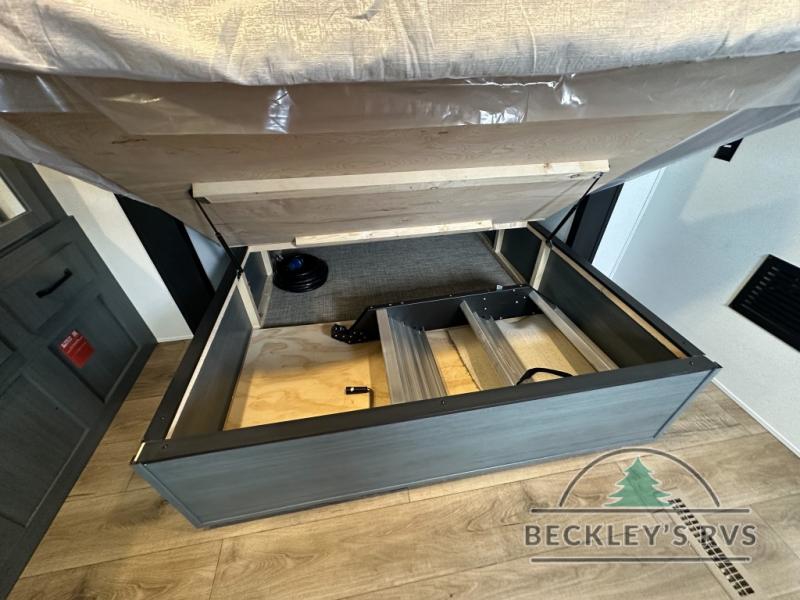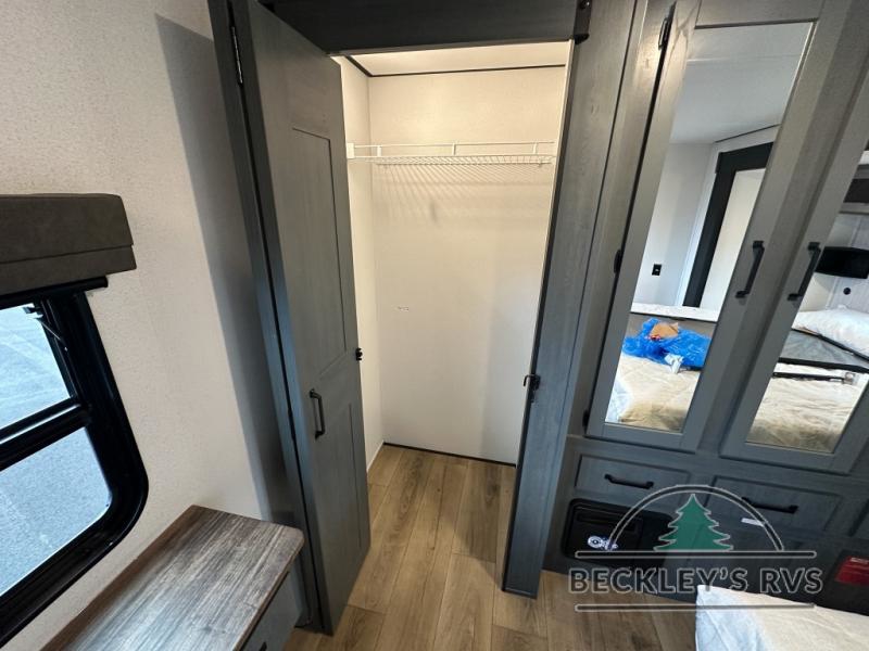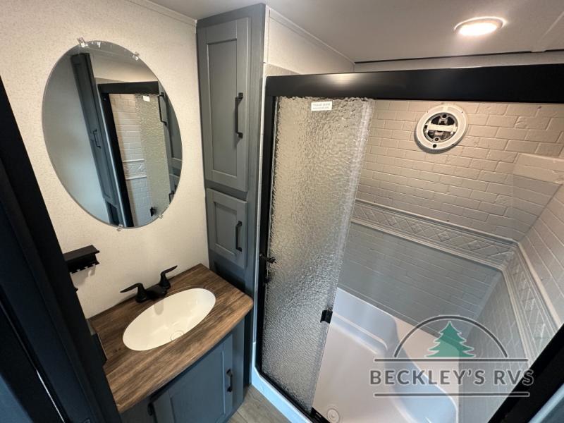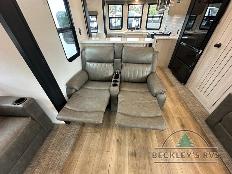 This is the perfect destination trailer for a larger group since it can sleep up to nine campers each night. The little ones will love the double loft areas with three bunk mats and storage space for their things, while you take the rear private bedroom. There is a king bed slide out here, along with a wardrobe/closet for your clothes, plus a second closet with the option to add washer and dryer prep. Everyone can meet in the middle living room to relax on the dual sofas or recliners across from the fireplace and entertainment center. Head to the front of the unit where you'll find the kitchen that includes ample counter space to prep meals, a residential style refrigerator and pantry for food storage, and a free-standing table to dine at. There is also a breakfast nook that overlooks the living area so you can visit with the cook and watch a movie at the same time!