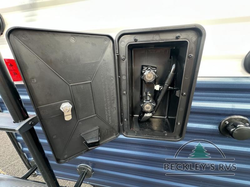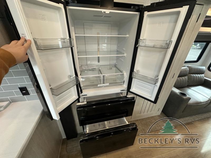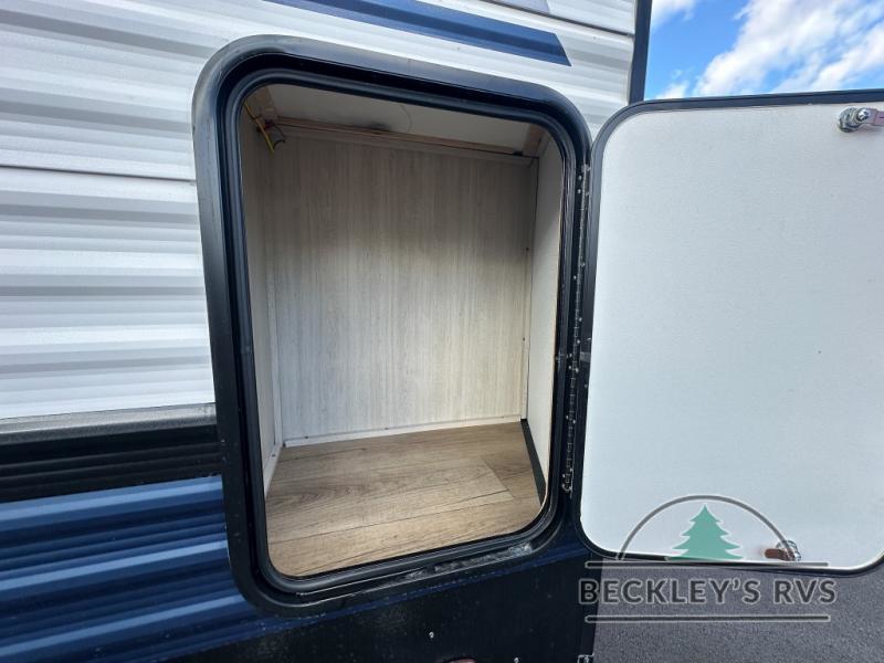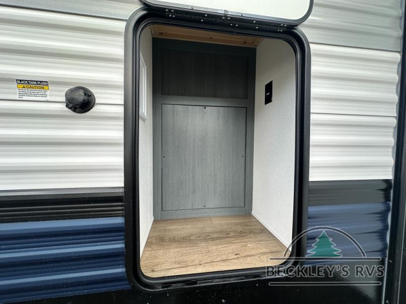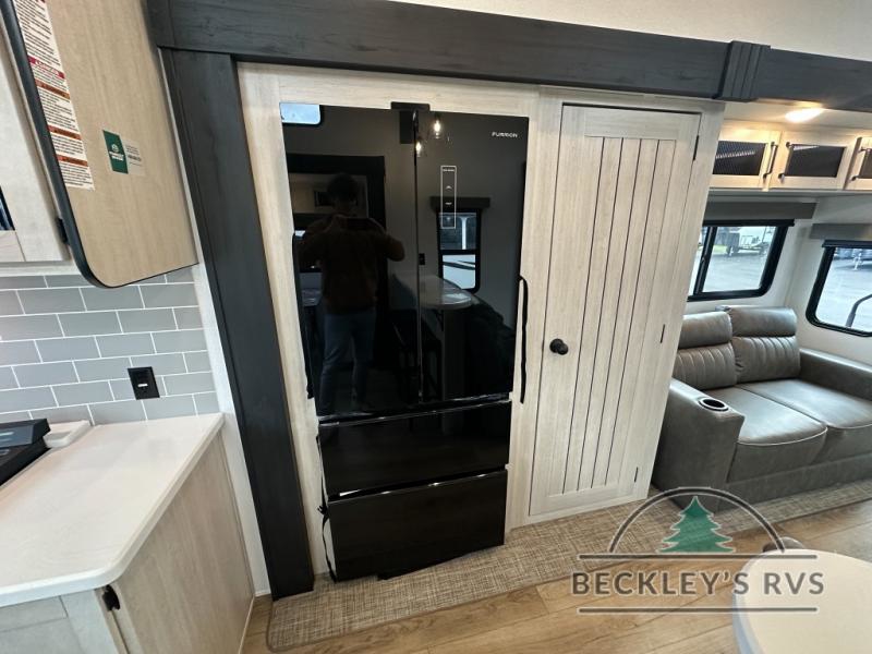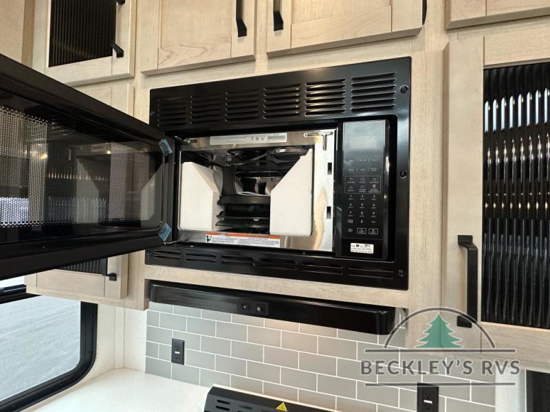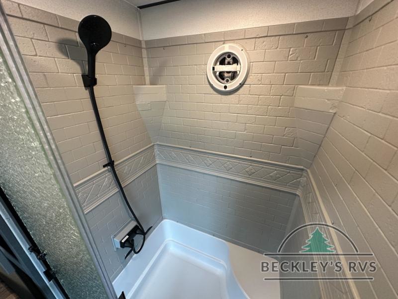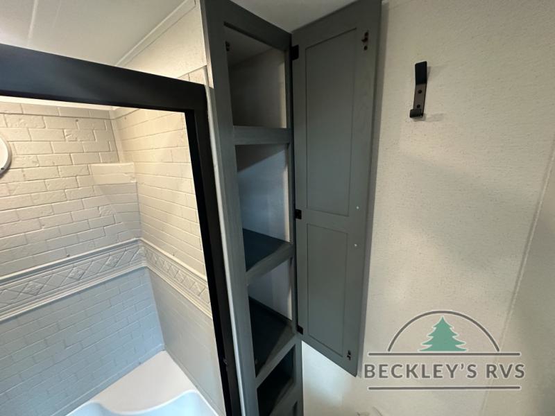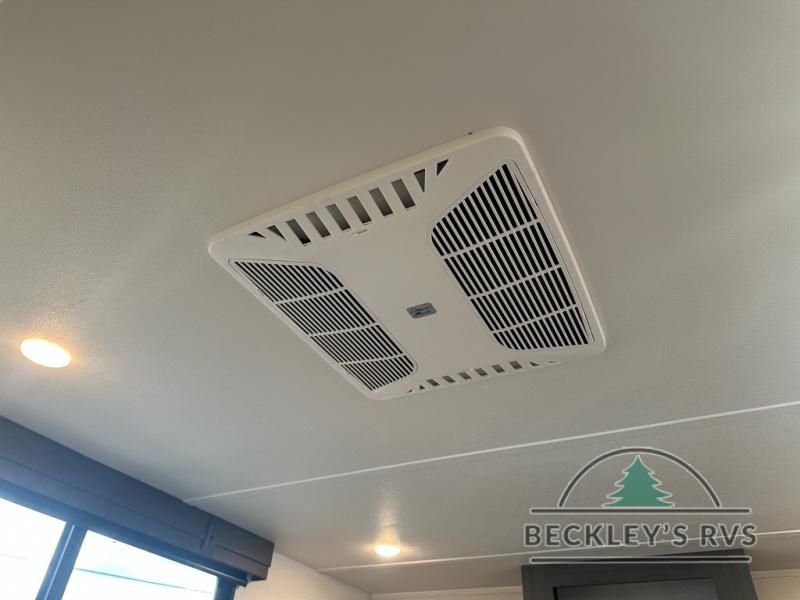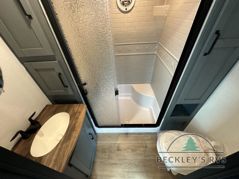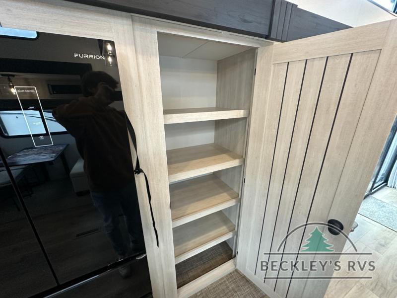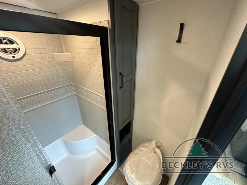 This is the perfect destination trailer for a larger group since it can sleep up to nine campers each night. The little ones will love the double loft areas with three bunk mats and storage space for their things, while you take the rear private bedroom. There is a king bed slide out here, along with a wardrobe/closet for your clothes, plus a second closet with the option to add washer and dryer prep. Everyone can meet in the middle living room to relax on the dual sofas or recliners across from the fireplace and entertainment center. Head to the front of the unit where you'll find the kitchen that includes ample counter space to prep meals, a residential style refrigerator and pantry for food storage, and a free-standing table to dine at. There is also a breakfast nook that overlooks the living area so you can visit with the cook and watch a movie at the same time!