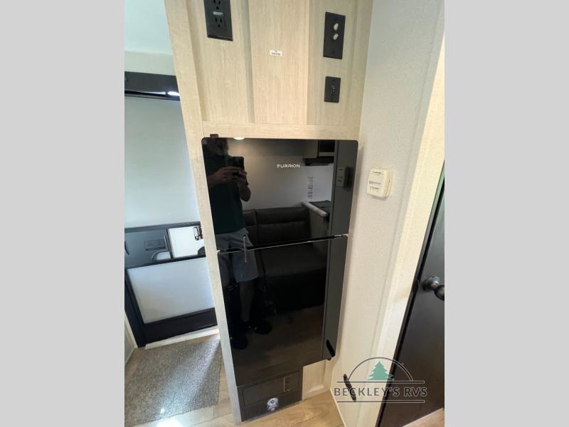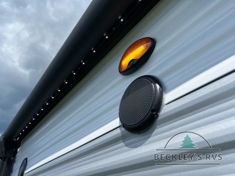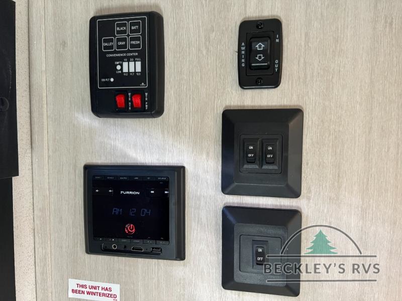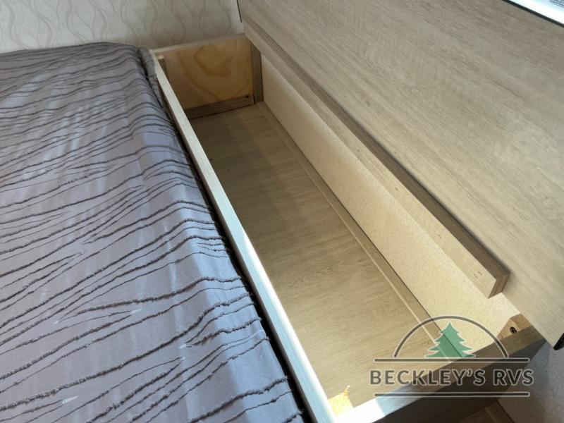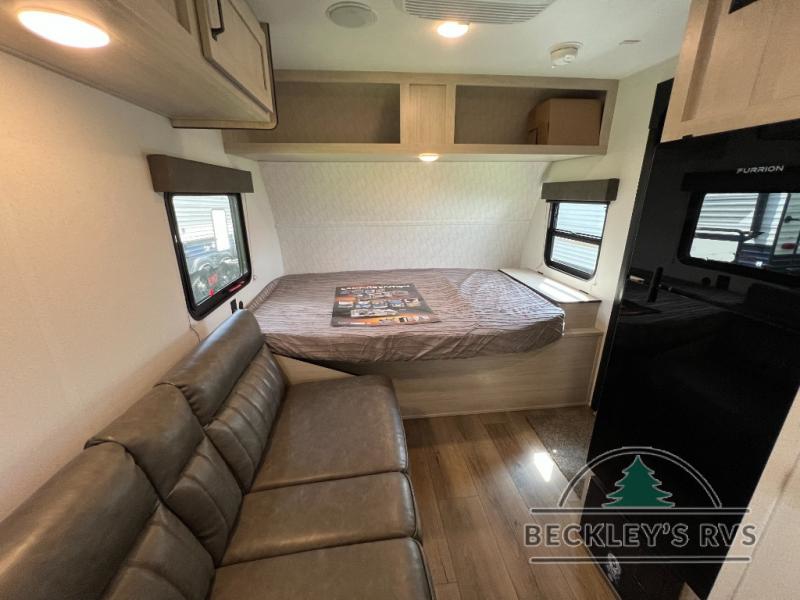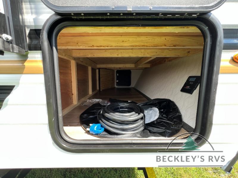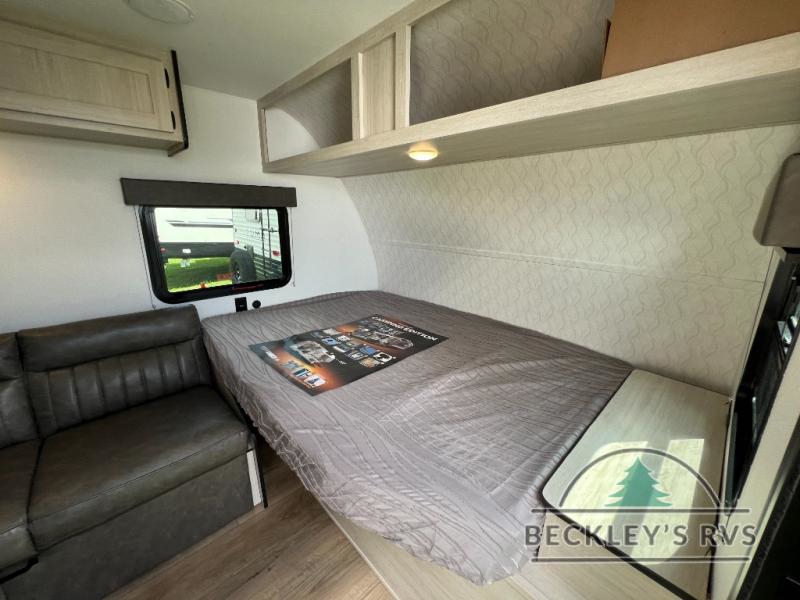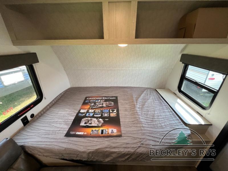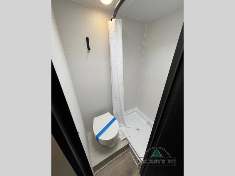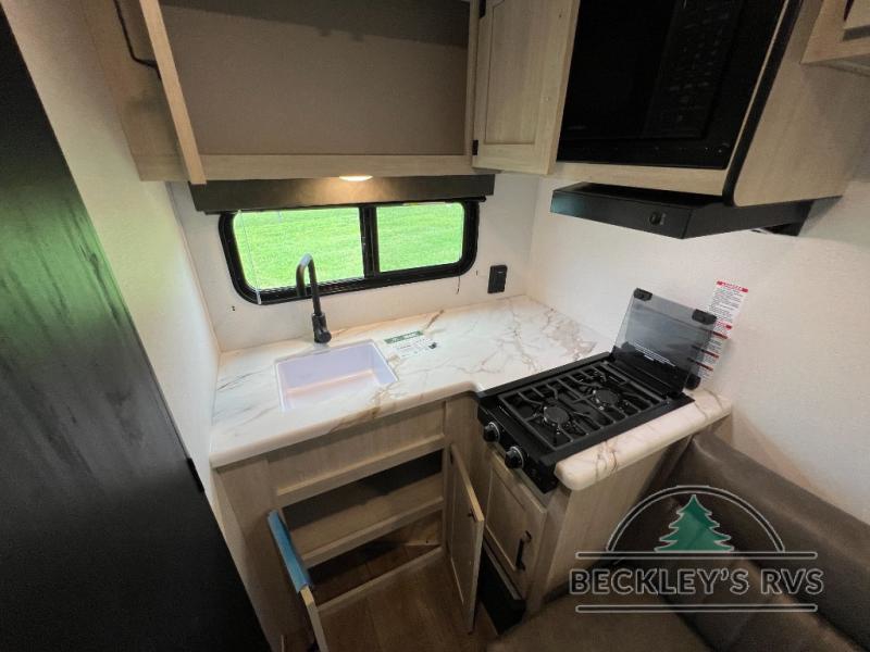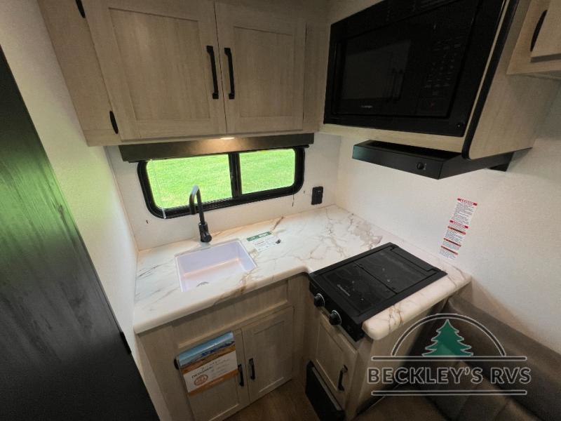 It will be so easy to enjoy camping trips in this single axle travel trailer! There is an RV queen bed up front with flip-up storage at the foot of the bed for your belongings, and any additional guests can sleep on the sofa. A full kitchen includes a stainless two burner cooktop and stainless microwave to cook meals each day, and the 4.3 cu. ft. 12V black glass refrigerator will keep your food fresh. And a private bath with a toilet and shower will let you freshen up without having to use the camp's facilities!