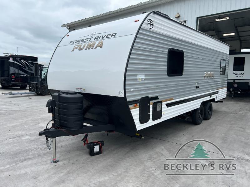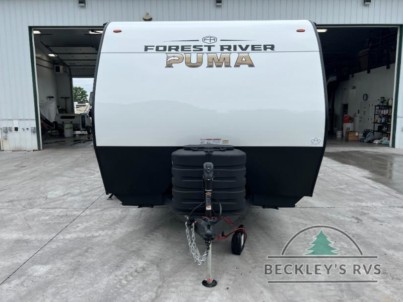The Puma Camping Edition by Palomino offer an affordable travel trailer for rookie campers or seasoned RVers! They are built with 5/8" tongue and groove plywood flooring and a front diamond plate for added protection. There are also exterior clamp style door latches, back up camera prep, and 20 lb. LP bottles. Head inside to find Thermofoil countertops with a smooth drop edge, bedroom USB ports and outlets, and a GE appliance and kitchen package