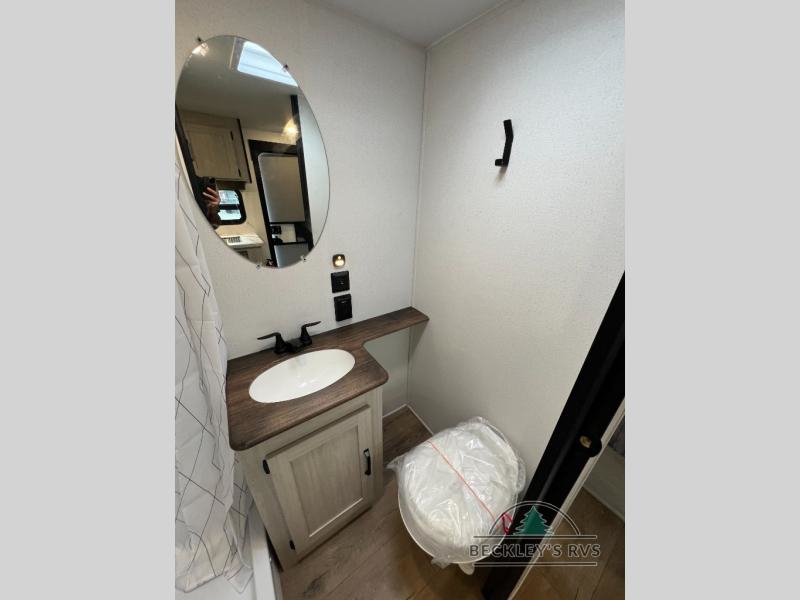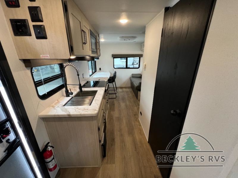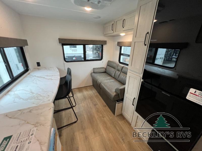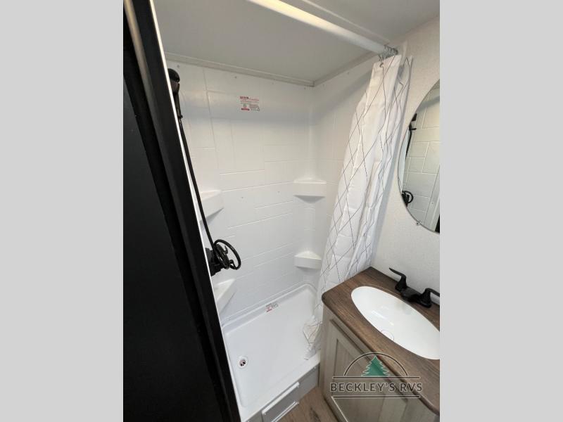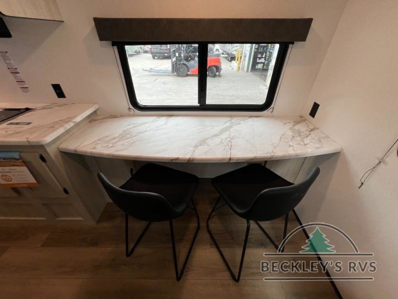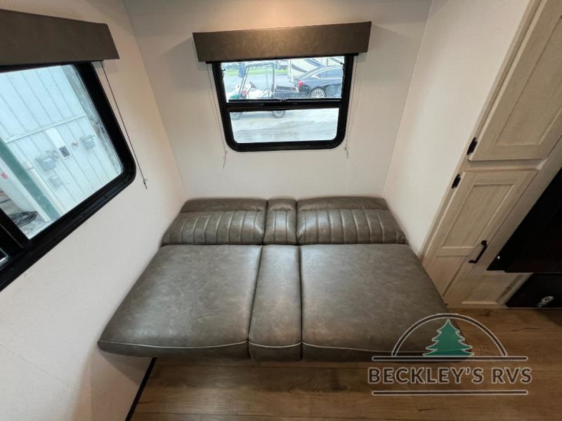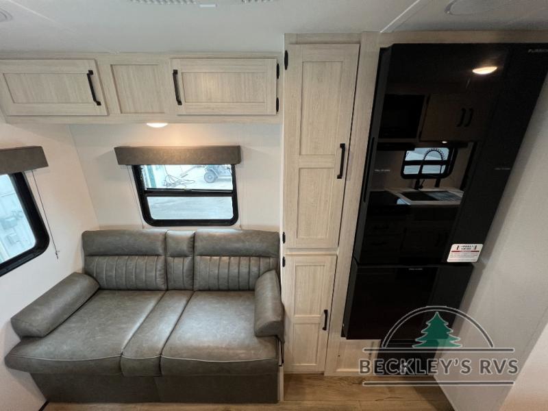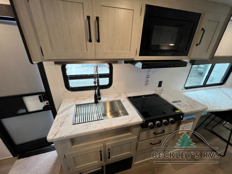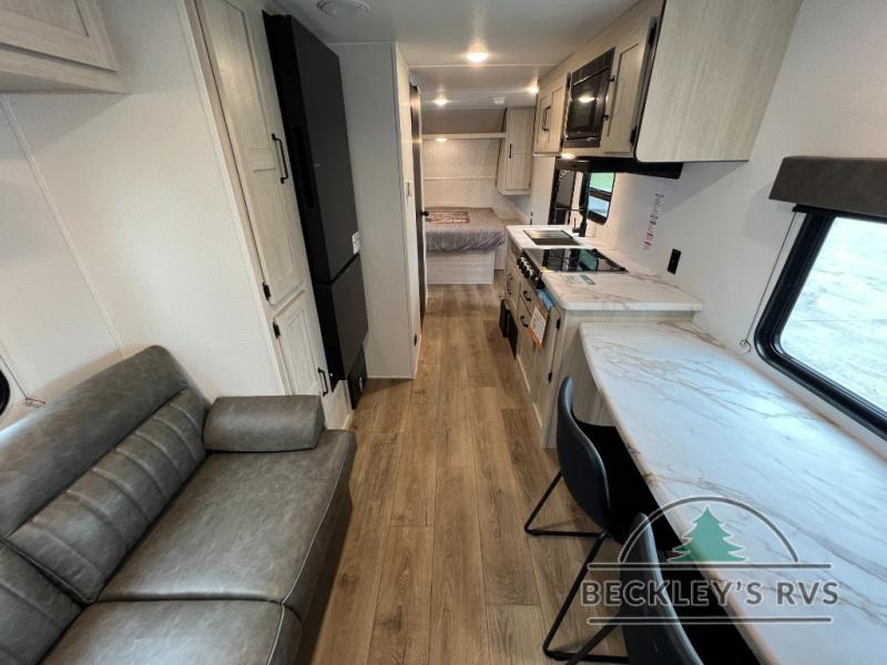 Escape the hustle and bustle of city life for weekends at the campground in this rear living travel trailer. There is a sofa to relax on across from a bar table, or you can choose the optional booth dinette if you prefer this type of dining space. Prepare all your meals on the three burner cooktop or in the stainless microwave, then keep leftovers in the 10. cu. ft. 12V refrigerator. When you're ready to get some shut-eye, the front 60" x 74" RV queen bed is sure to bring a great night's rest, and you'll find dual shirt closets to keep your clothes organized.