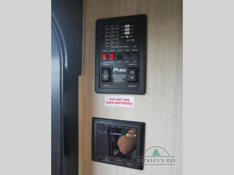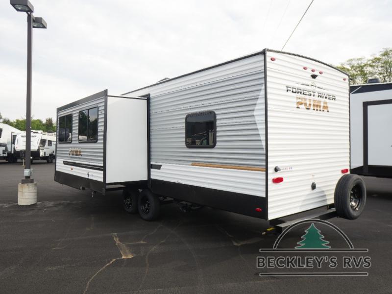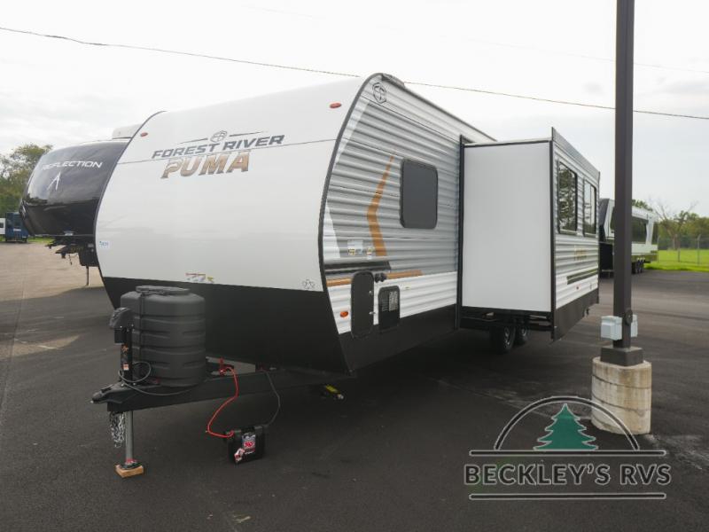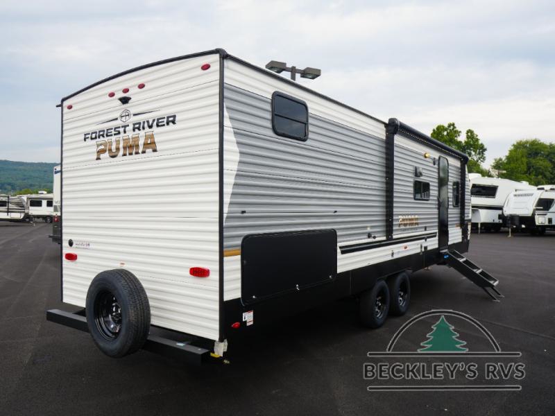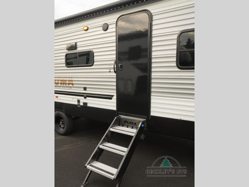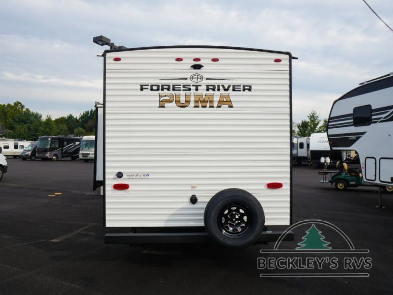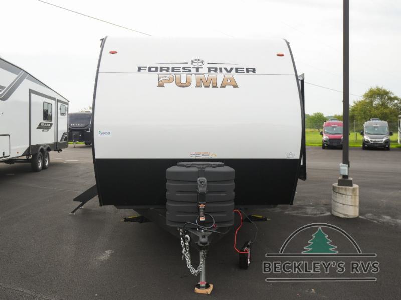 The Puma Camping Edition by Palomino offer an affordable travel trailer for rookie campers or seasoned RVers! They are built with 5/8" tongue and groove plywood flooring and a front diamond plate for added protection. There are also exterior clamp style door latches, back up camera prep, and 20 lb. LP bottles. Head inside to find Thermofoil countertops with a smooth drop edge, bedroom USB ports and outlets, and a GE appliance and kitchen package.