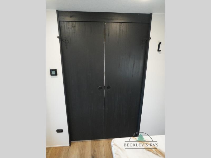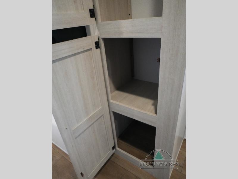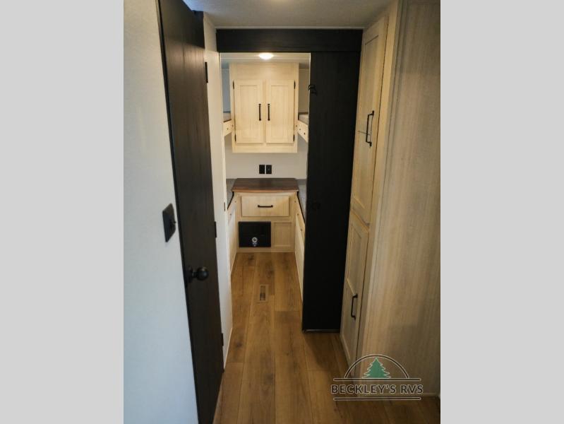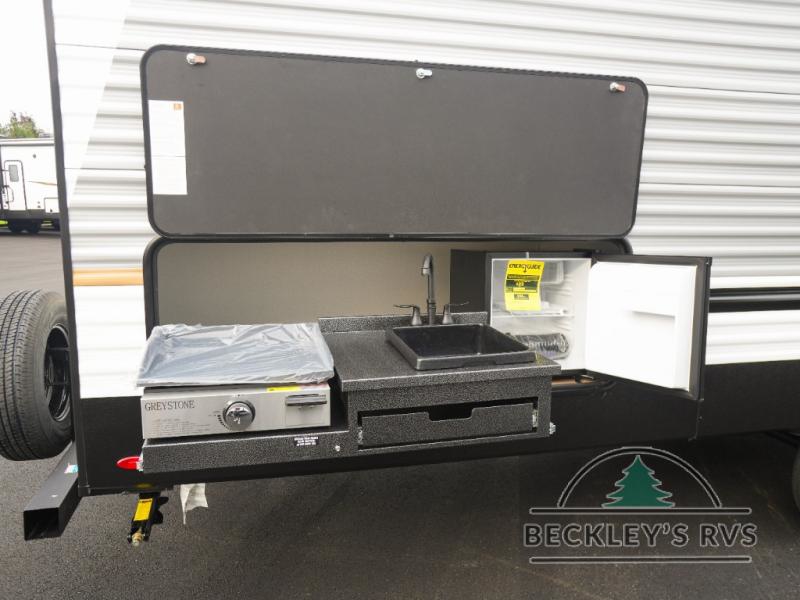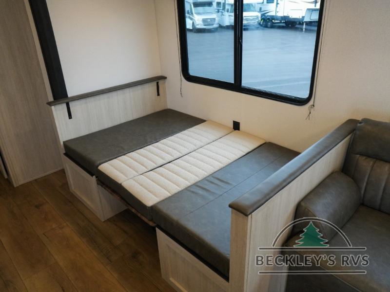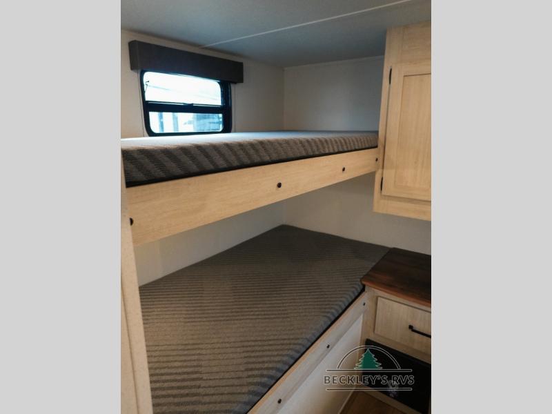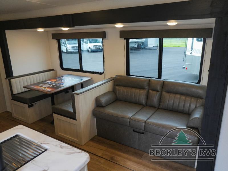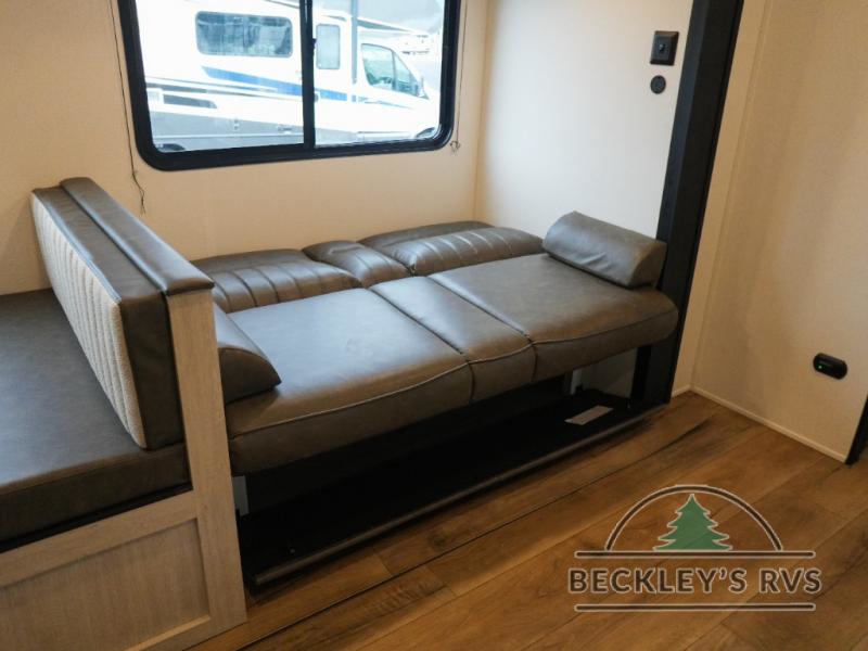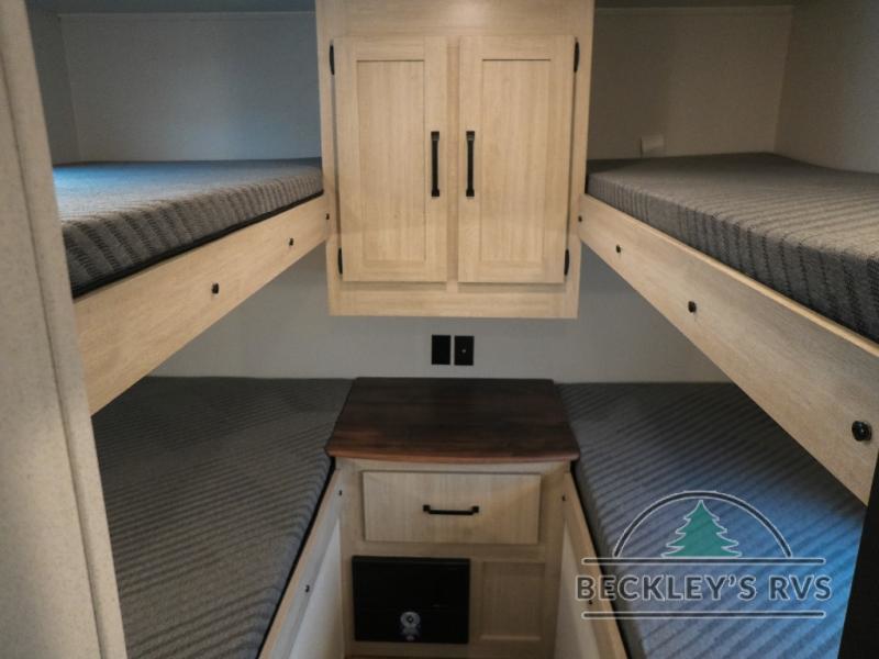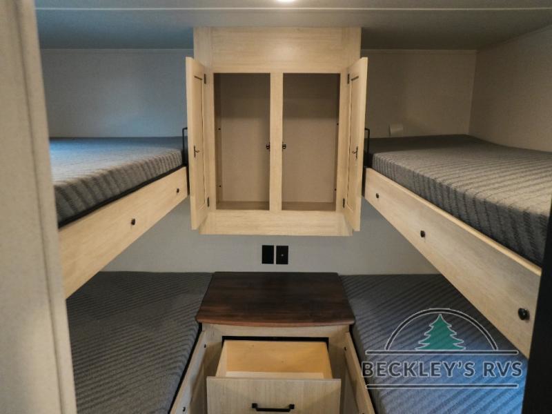 If you're looking for more space, this double axle unit features a large slide so you can walk about freely. Here, you'll find the booth dinette and sofa, which sit across from the optional TV if you want to enjoy movie nights. The full kitchen includes a stainless microwave and three burner cooktop to make meals, plus a pantry and 12V refrigerator for food storage. And an optional outside kitchen with a griddle can be added if you enjoy cooking outdoors! Your guests or littles are sure to enjoy the rear private bunkhouse with four bunk beds and a wardrobe for their things!