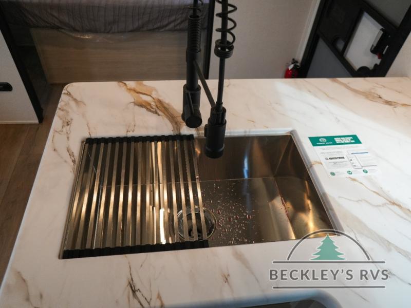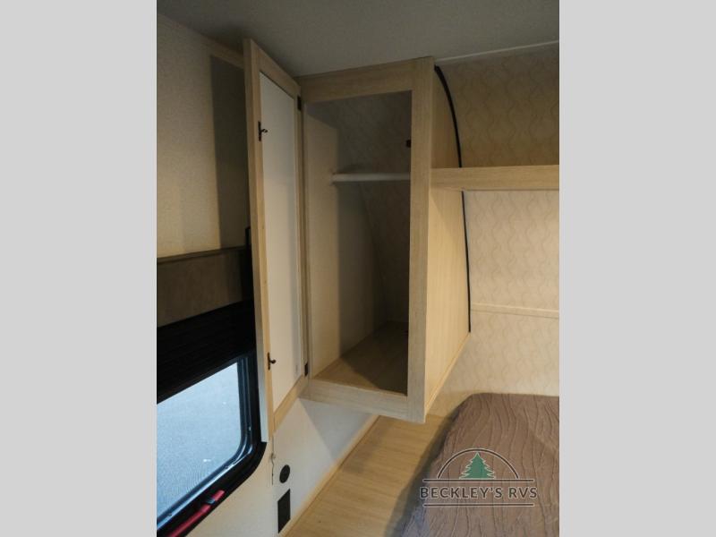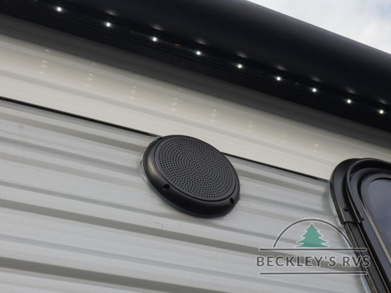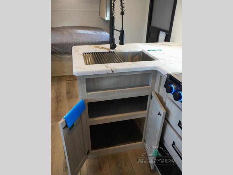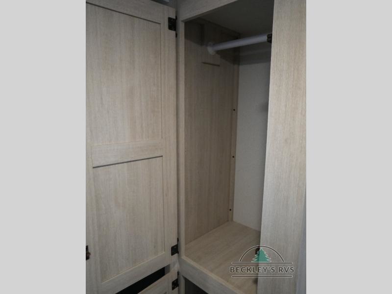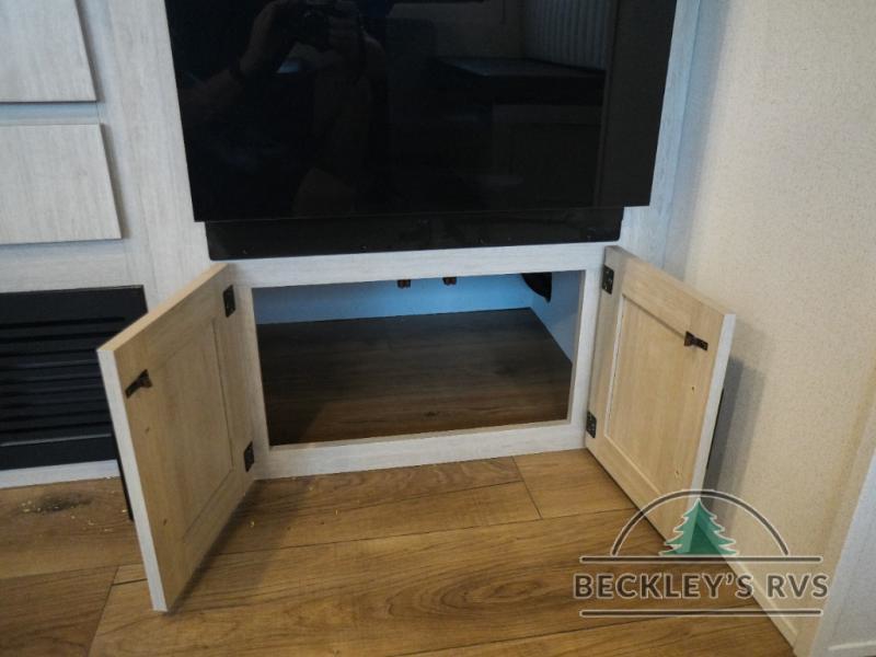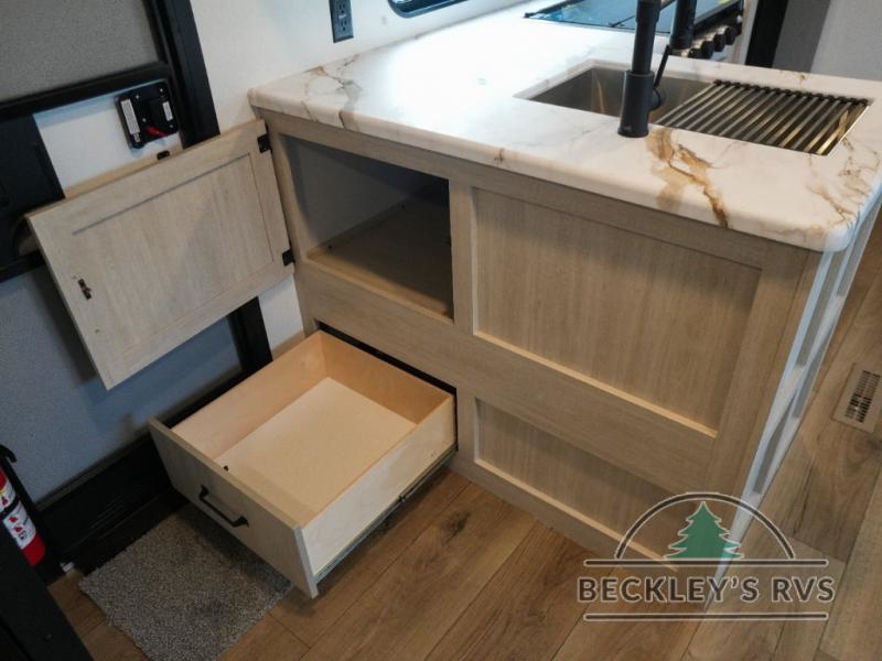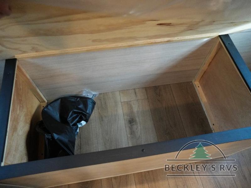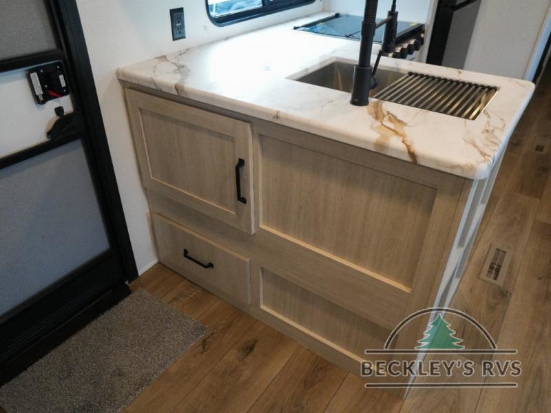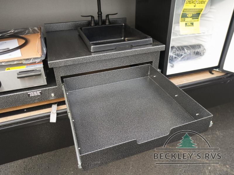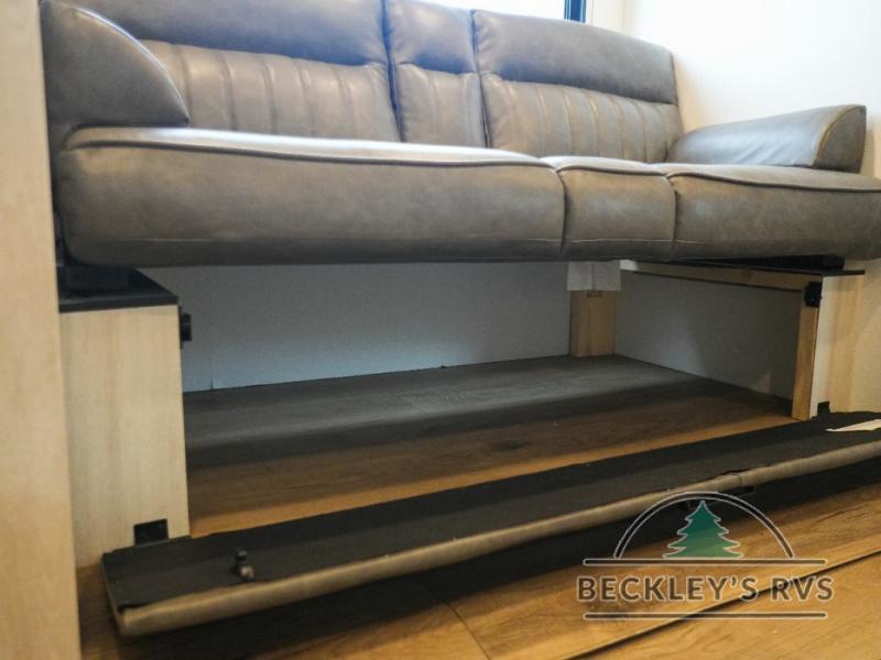 If you're looking for more space, this double axle unit features a large slide so you can walk about freely. Here, you'll find the booth dinette and sofa, which sit across from the optional TV if you want to enjoy movie nights. The full kitchen includes a stainless microwave and three burner cooktop to make meals, plus a pantry and 12V refrigerator for food storage. And an optional outside kitchen with a griddle can be added if you enjoy cooking outdoors! Your guests or littles are sure to enjoy the rear private bunkhouse with four bunk beds and a wardrobe for their things!