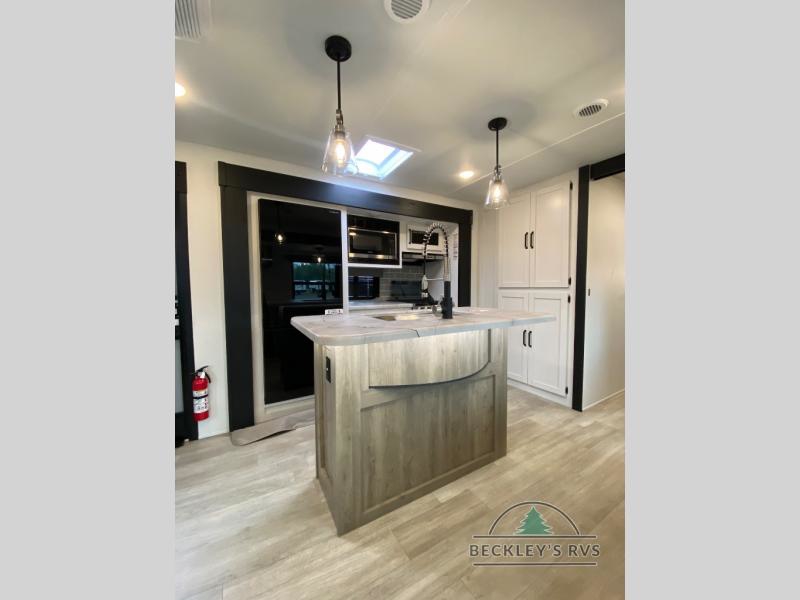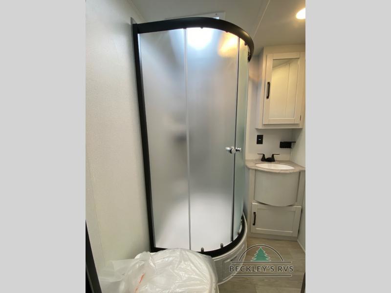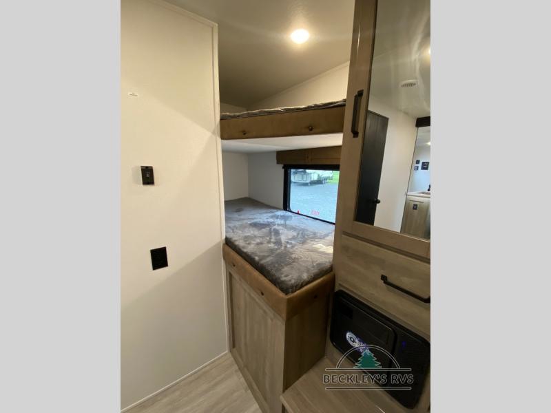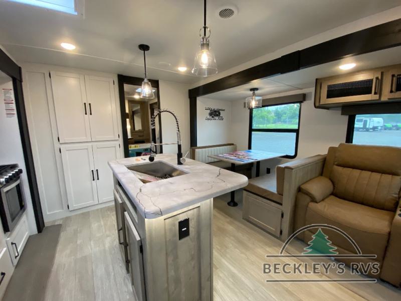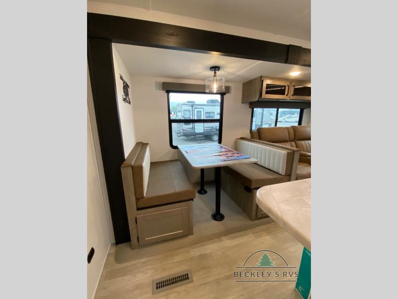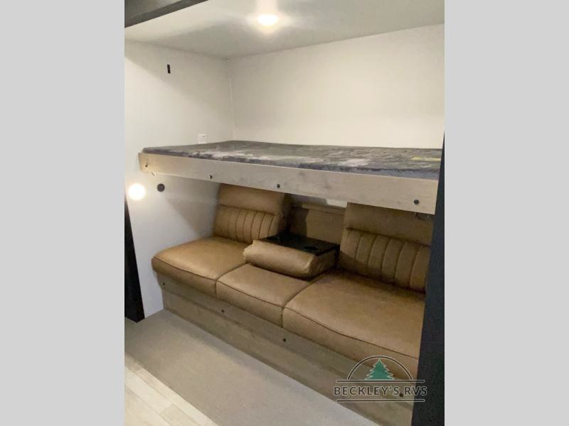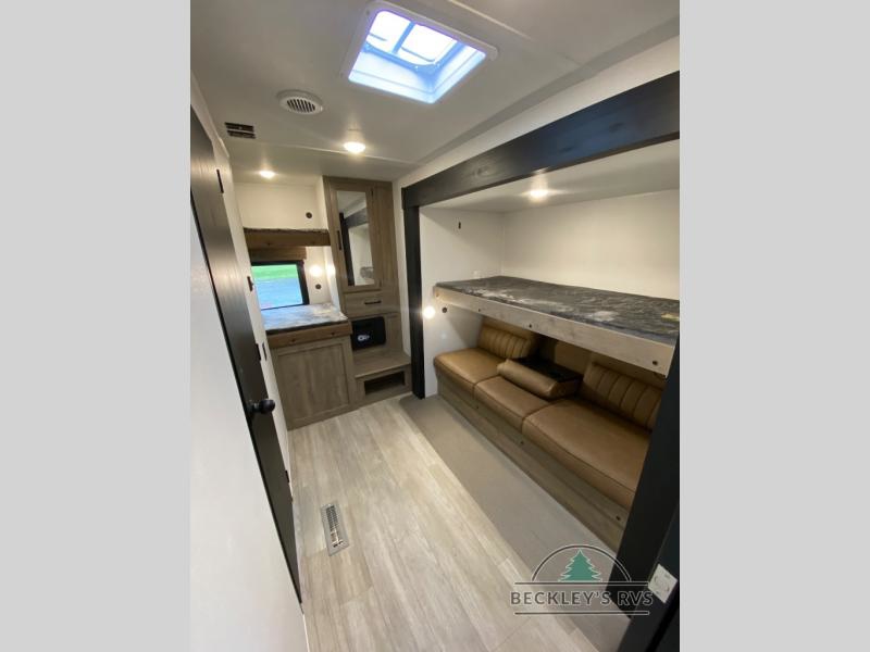 With two full bathrooms, it's a clean decision to take this travel trailer on your next family vacation! Start each morning feeling recharged after sleeping on the queen bed in the front private bedroom or in the rear private bunkhouse with an angled top bunk above a 32" x 69" double bunk bed and a 32" x 69" bunk above a 68" sofa slide. The bunkhouse also has a full bathroom with a 24" x 40" tub and one of the dual entry doors to the unit. You can relax on the sofa while enjoying the entertainment center and eat your meals prepared with the kitchen island at the booth dinette.