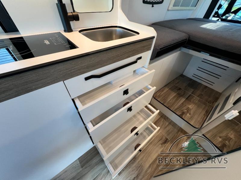 The Roadtrek Westfalia Wave Pop Top is a perfect choice - small size but packed wtih features and ready for fun! The interior features a well-equipped kitchen with microwave, 2-burner cooktop, and 3.2 cubic foot refrigerator. There's plenty of storage with 17 different cabinets and drawers, featuring clever solutions for all your belongings. At night there's the rear convertible bed, which can be equipped with a king or queen mattress, the bench/bed in the dining area, and the pop top roof with its own mattress. Screen window with roll shades mean you can enjoy the breeze without the bugs.