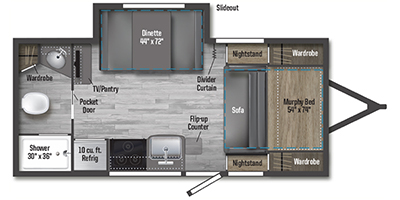 If you're looking for versatility, then you need this travel trailer! Depending on the time of day you enter will determine whether you see the Murphy bed or the sofa up front. A slide out 44" x 72" booth dinette can be used for dining, playing games, and sleeping space at night. The full rear bathroom is equipped with everything you will need to freshen up each morning and features a wardrobe for your clothing and linens, and a pocket door into the bath saves space in the main room. The Smart TV is conveniently located so you can watch your favorite shows from the sofa or Murphy bed as well as the dinette, plus the pantry offers a place to store your snacks and such for easy access. The cook in your bunch will love all the amenities to make meals including the handy flip-up counter for more prep space.
