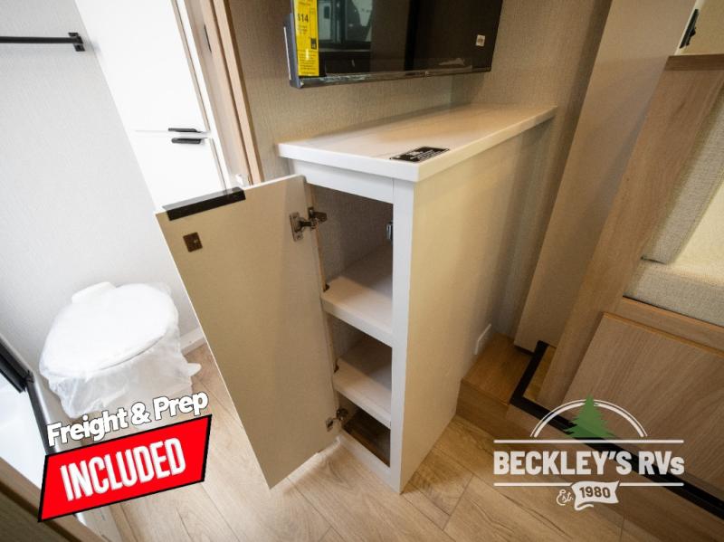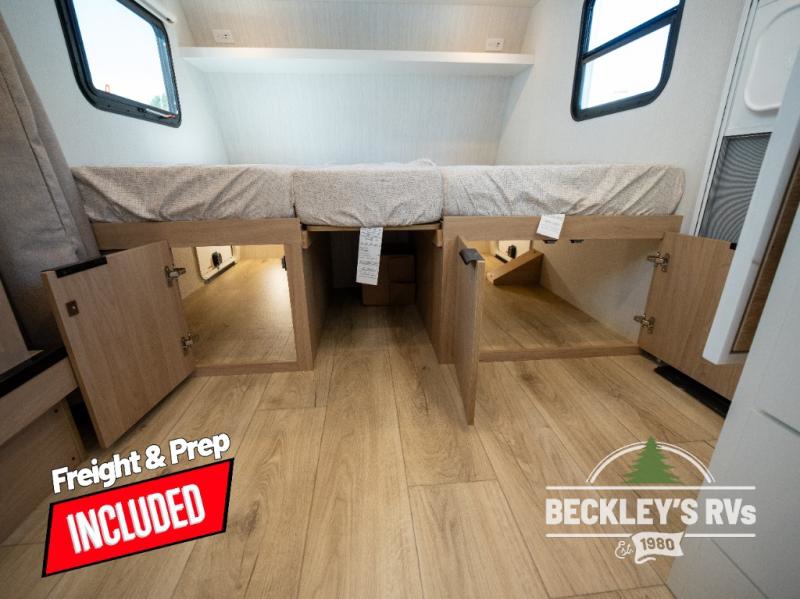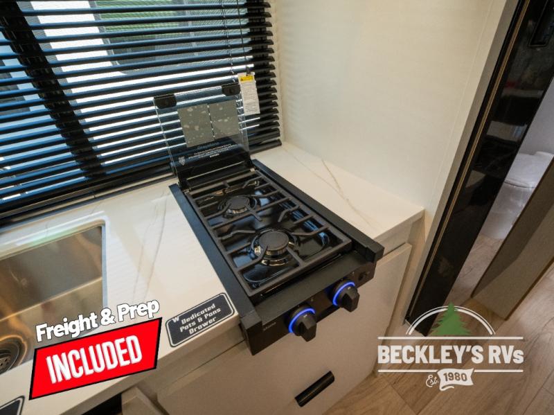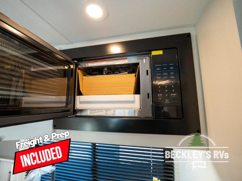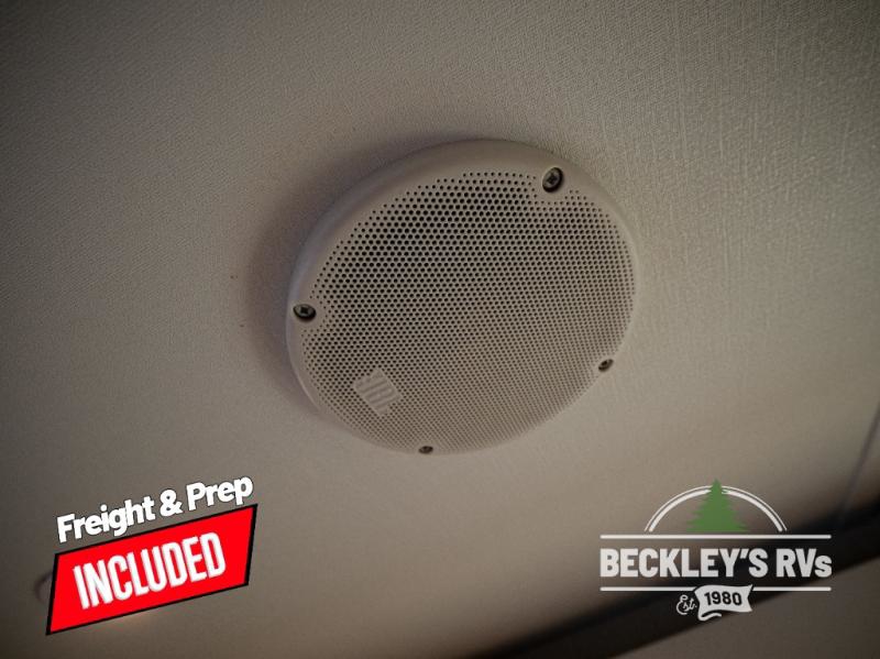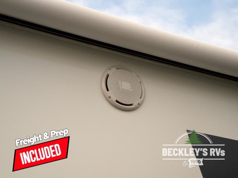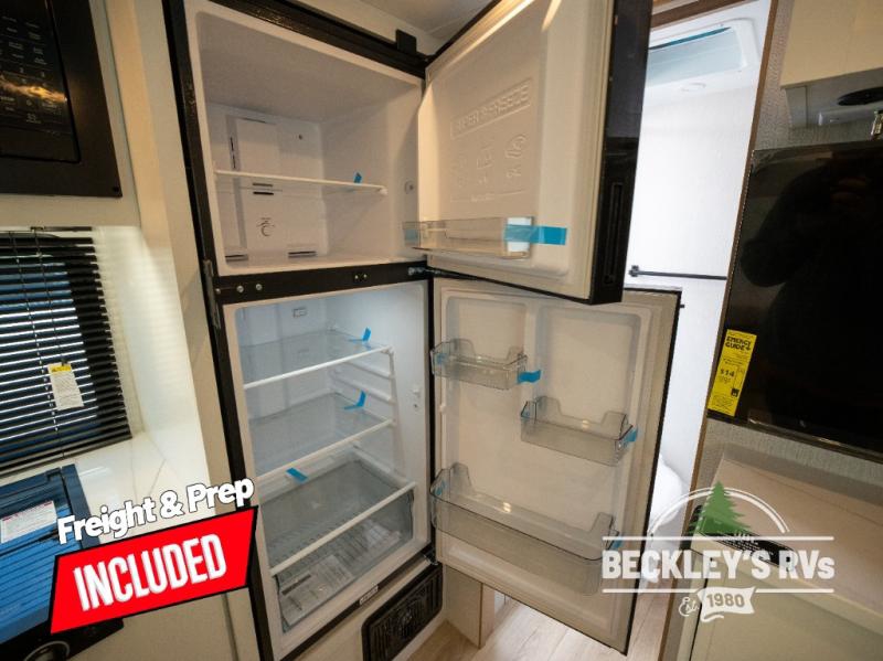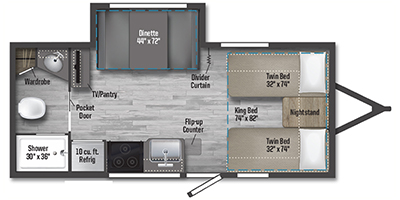 Come see just how accommodating this travel trailer can be! The two 32" x 74" twin beds up front have a nightstand in between them and a divider curtain to draw, plus they can convert into one 74" x 82" king-size bed. The 44" x 72" booth dinette slide can also convert into an extra sleeping space when you're not using it for mealtime or playing games. Everyone can get squeaky clean in the full rear bathroom, and the wardrobe is a convenient place to store your linens and extra clothes. Grab a snack from the kitchen pantry or pop a bag of popcorn in the convection microwave then watch a movie on the Smart TV or head outdoors and relax underneath the power awning!
