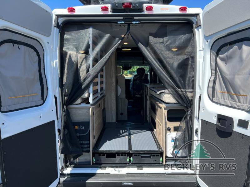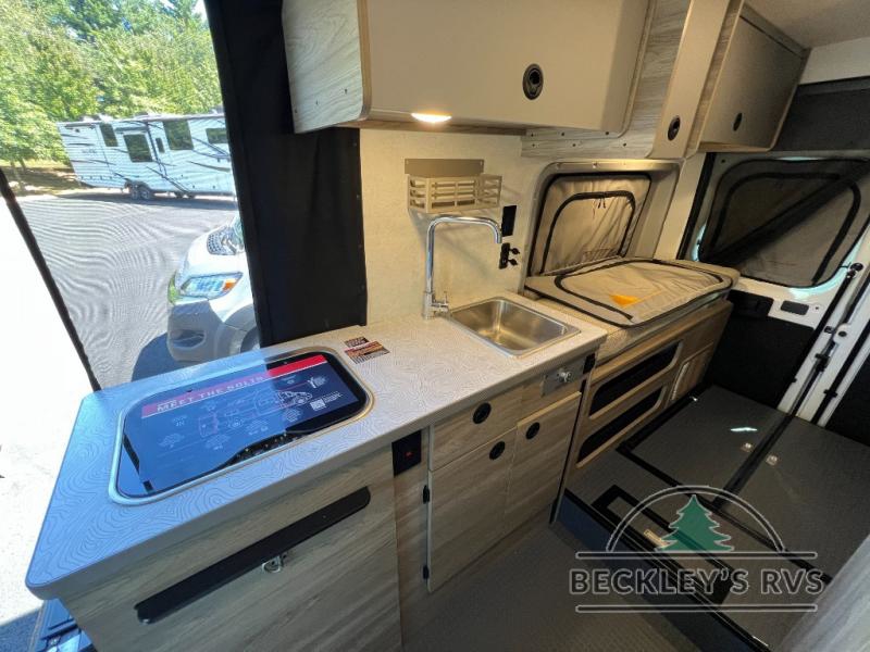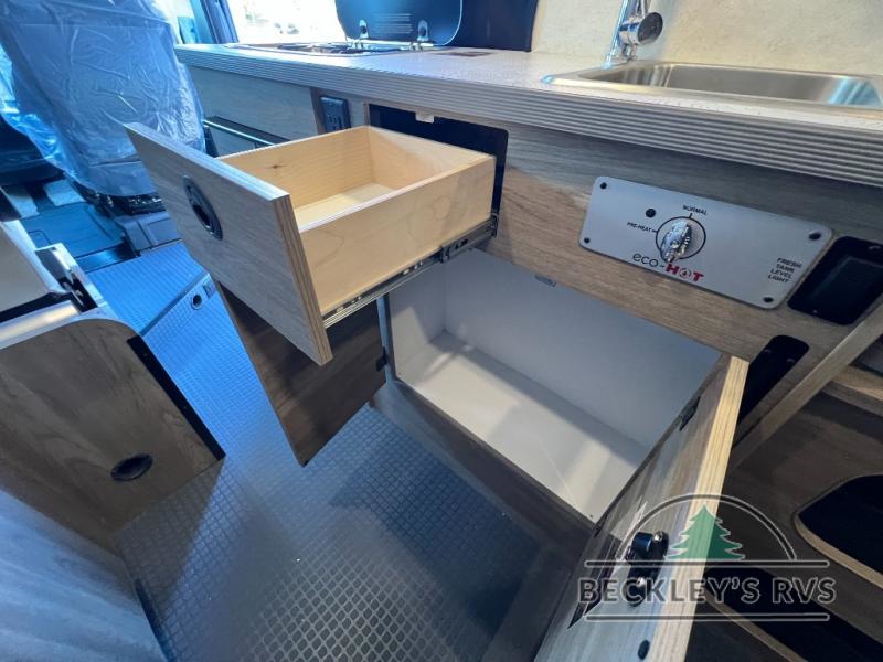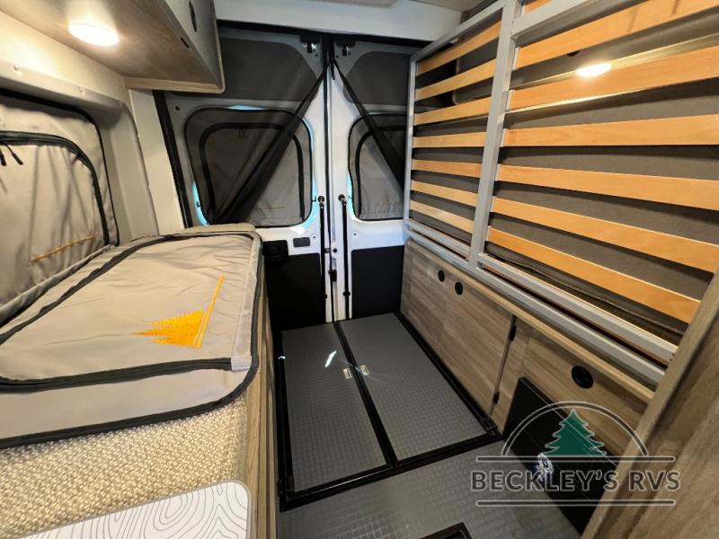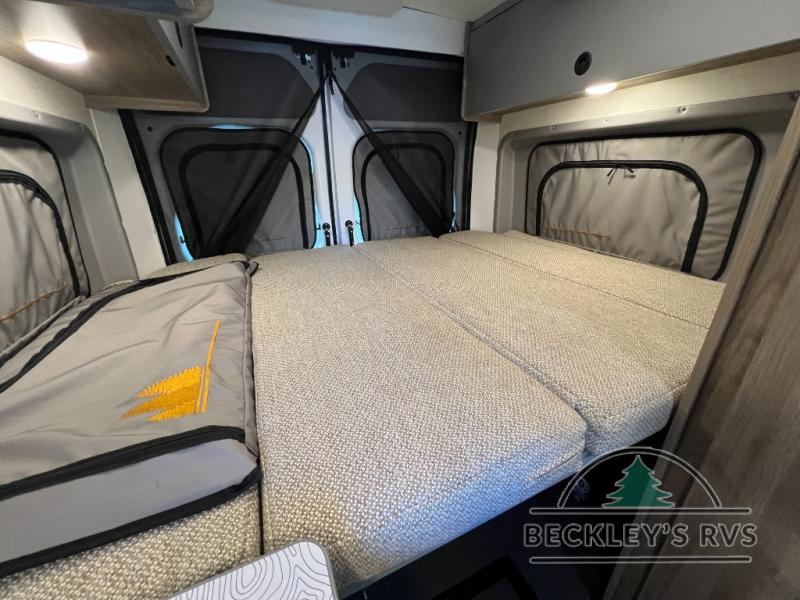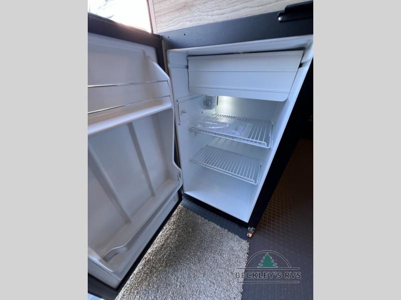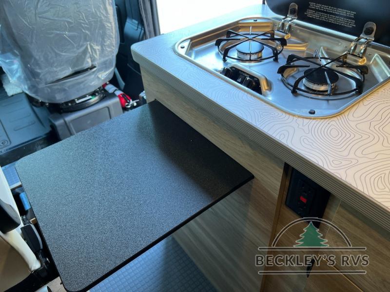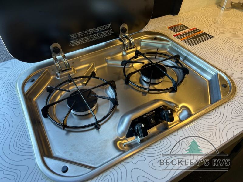 Enjoy a weekend ride in the mountains or make it an overnight stay with versatile sleeping options in this camper van. You'll find the Murphy+ bed in the back will provide a great night's rest, or you can choose the optional sofa/bed with added belted seating if you have more tag-alongs. And of course the little ones will love the pop-top sleeping area to climb into each night.  After you've freshened up in the convenient wet bath, prepare breakfast on the two burner range, and the milk and eggs can go back in the 3.0 cu. ft. single door refrigerator/freezer. This model also includes rear double doors with screens to let the breeze in and keep bugs out!