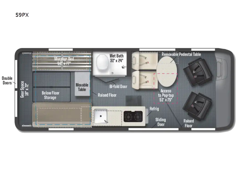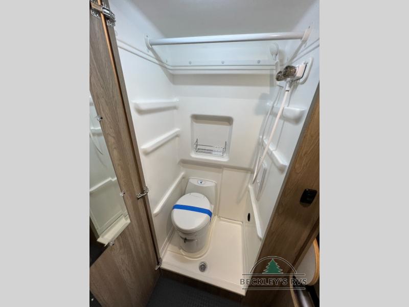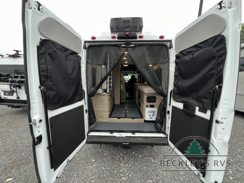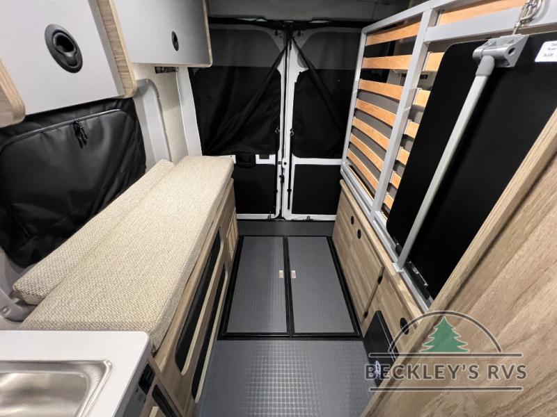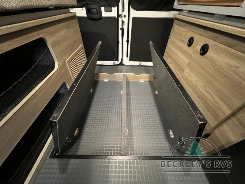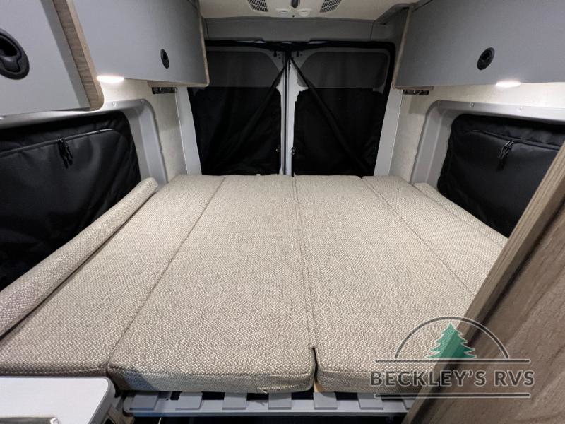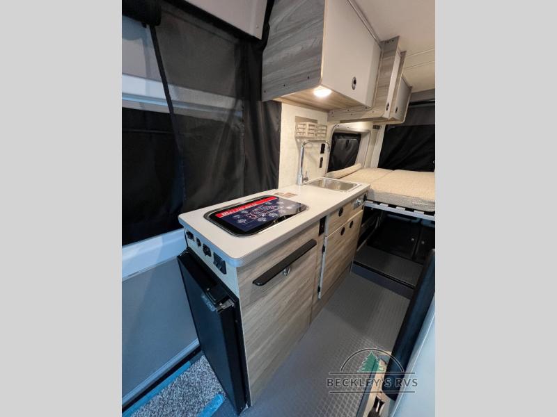 This camper van with an L-track storage system is perfect for those needing more storage space for their hiking and biking gear. You can stay powered up with the 2,800-watt gas generator, and there is a 13,500 BTU air conditioner with directional ducts and dial control that will allow you to come inside to cool off after a trail ride. A Murphy+ bed comes standard, and any guests that tag along can sleep in the pop-top sleeping area! If you choose to remove the pop-top, you'll enjoy the deluxe powered ventilator fan instead. You'll find the wet bath to come in handy when you want to clean up, and the dinette seating with a removable pedestal table will provide a place to enjoy your dinner at.