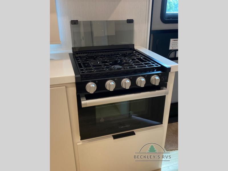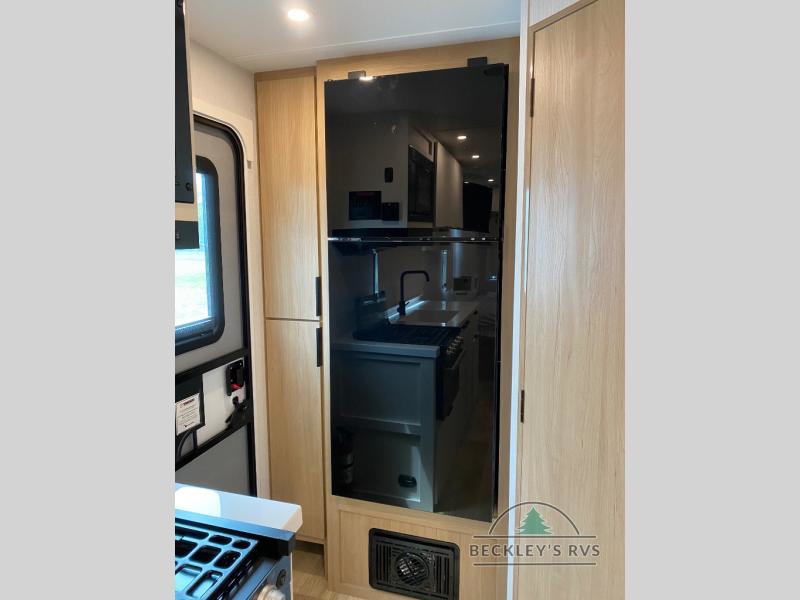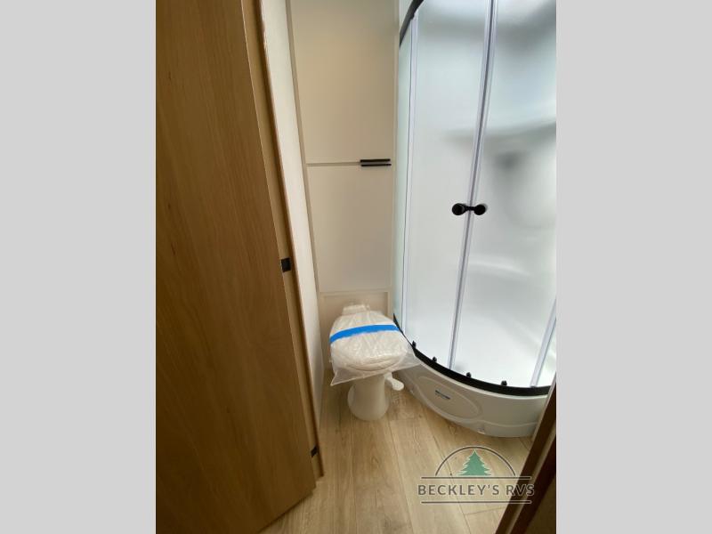 It will be so easy to enjoy camping trips in this compact travel trailer. The jack knife sofa slide provides more floor space plus a place for an overnight guest to sleep. You'll find a king-size bed up front with a privacy curtain and dual bedroom wardrobes to keep your things tidy. A recessed three burner cooktop with an oven will let you make meals each day, and the 10.6 cu. ft. 12V refrigerator will keep your cold items fresh. There is also a pantry with pull-out and removable shelves for added storage space. The full bath includes a power vent fan and a shower skylight that will give you more lighting and extra head room as you get ready each day!