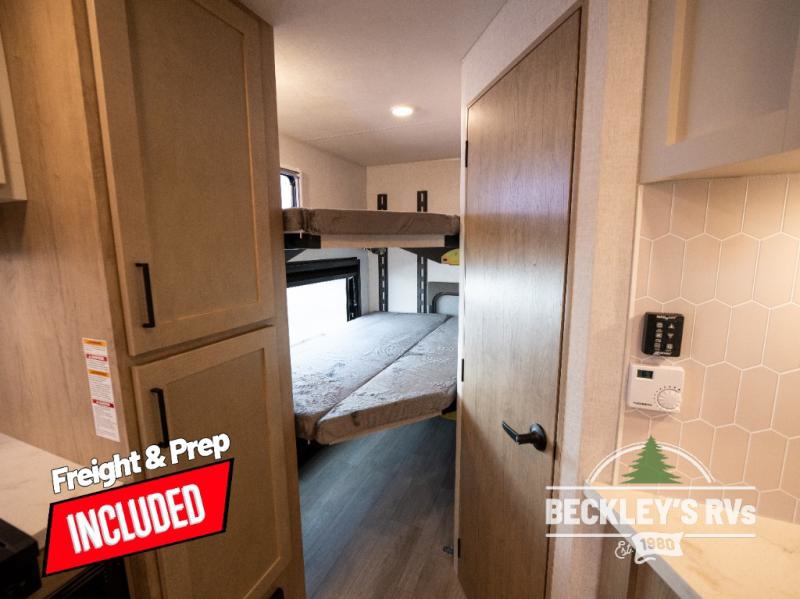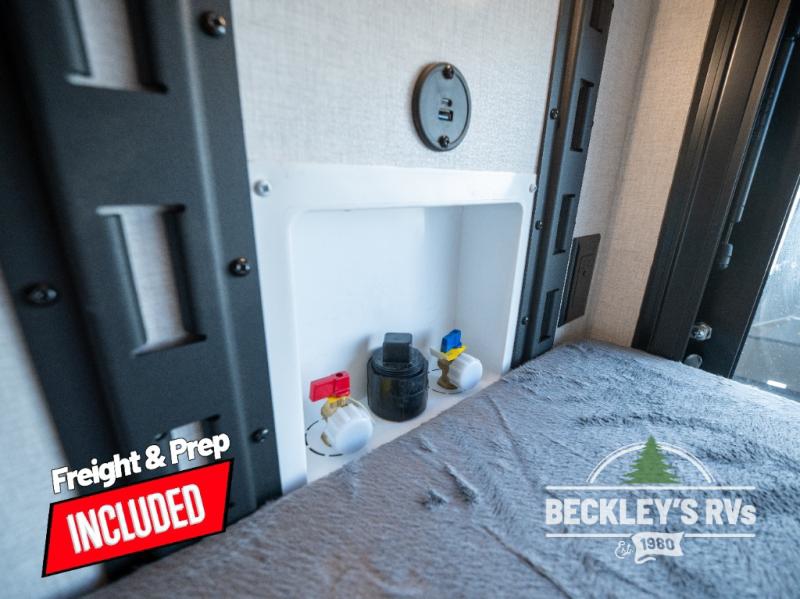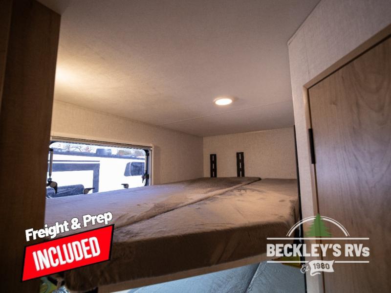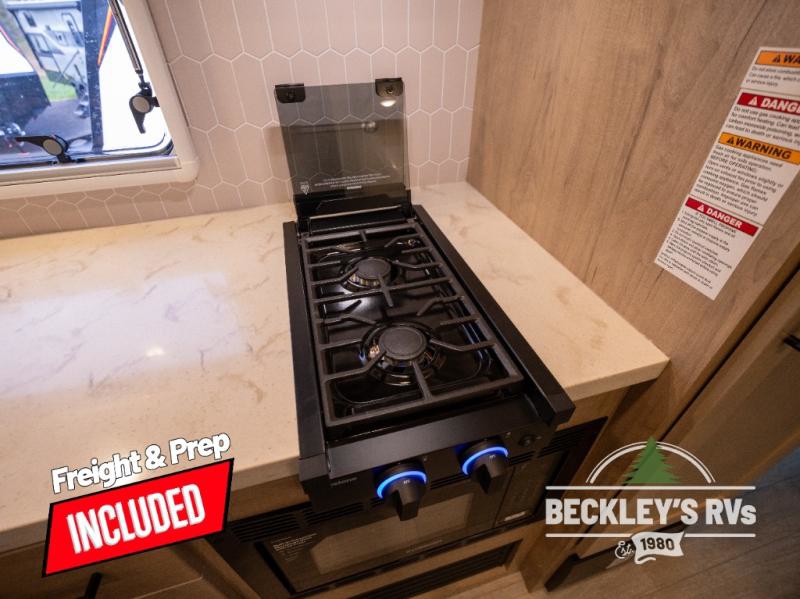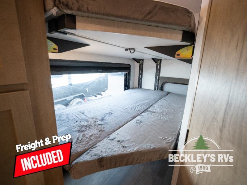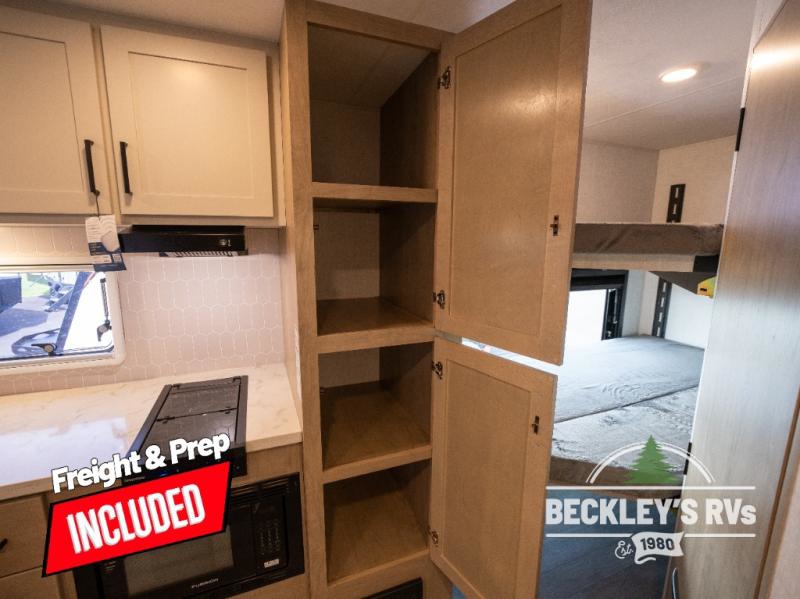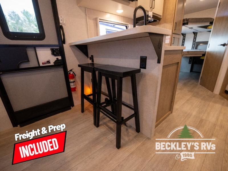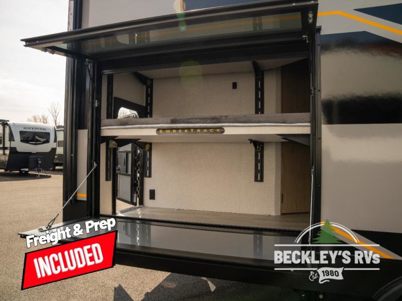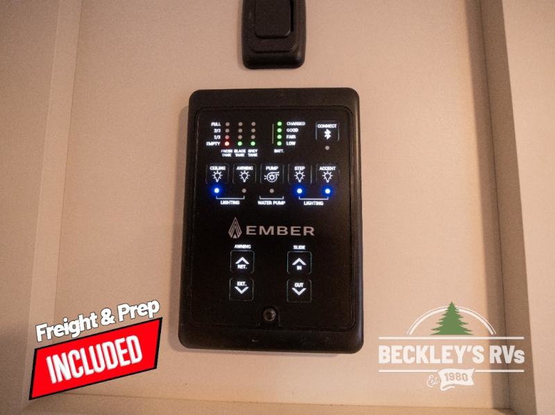 You will love camping in this versatile travel trailer! There is a repositionable EmberTrack E-Track bunk/storage system with single and double-size bunk configurations, depending on your needs, plus a fold-up Bar-V window that overlooks the exterior fold-down bar top/door. You'll find your own semi-private bedroom up front with a walk-around queen bed, dual nightstands and wardrobes, plus an overhead cabinet for ample storage. An optional Murphy bed can be chosen in place of the queen bed if you're needing more seating space during the day! The dual-burner LP cooktop and air fryer convection microwave will let you make meals each day, and there is a breakfast bar with bar stools where you can dine together. This unit also includes a slide out with theater seating with rotating side tables for the ultimate place to relax, plus there is a 12V refrigerator and overhead cabinet here for more storge space!