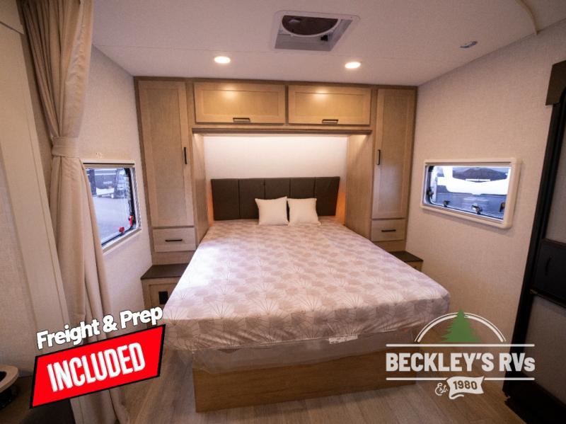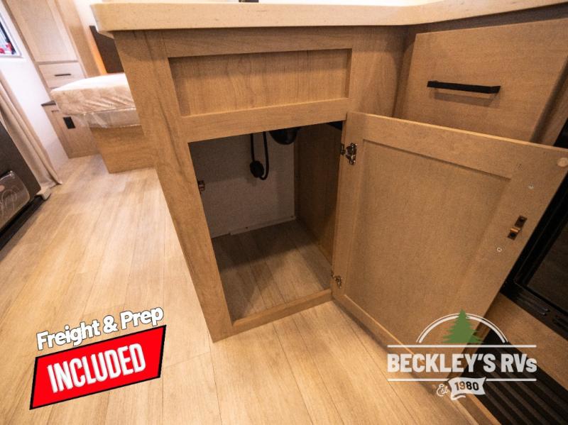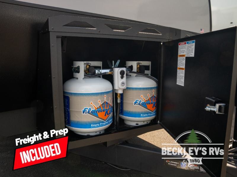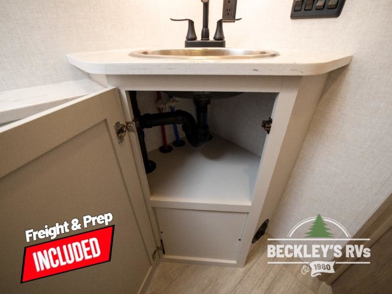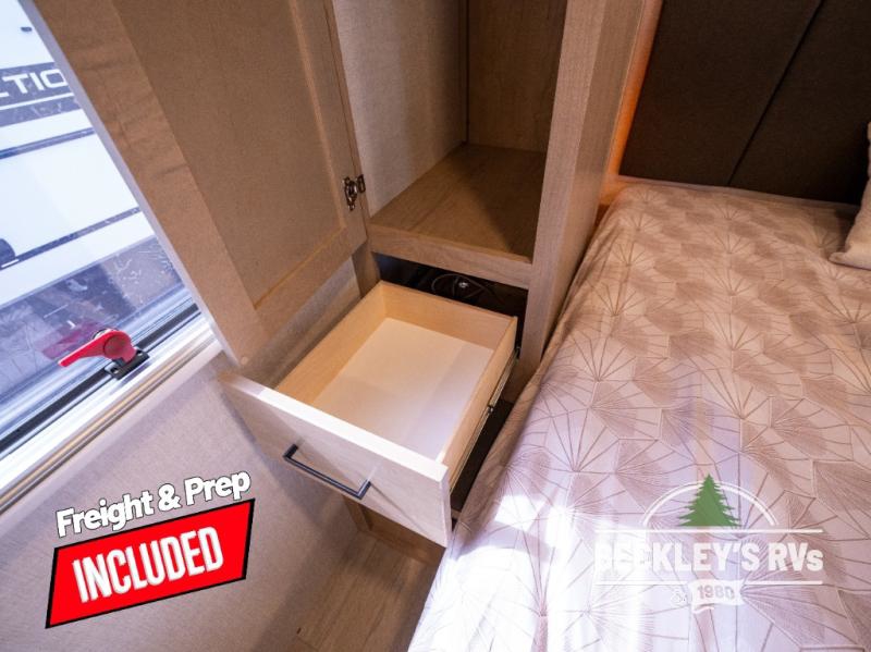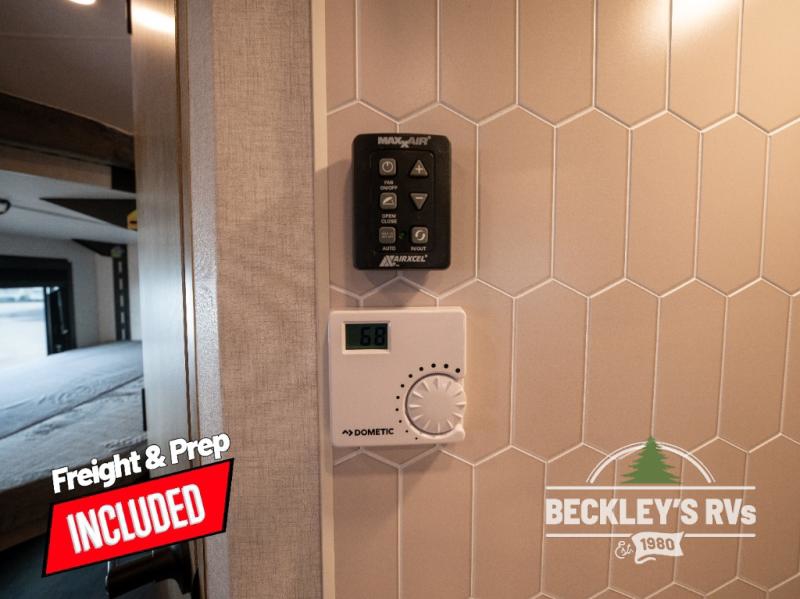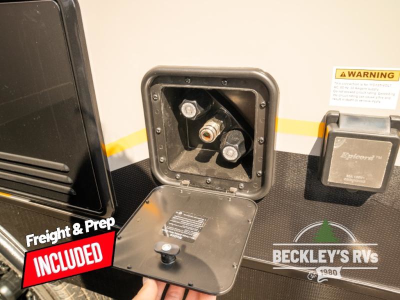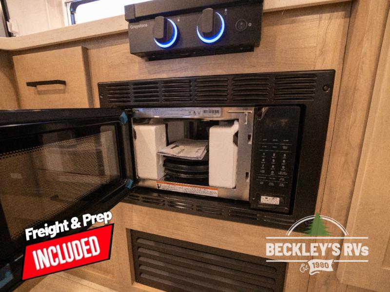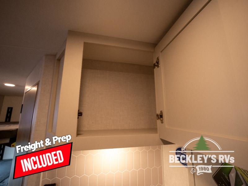 You will love camping in this versatile travel trailer! There is a repositionable EmberTrack E-Track bunk/storage system with single and double-size bunk configurations, depending on your needs, plus a fold-up Bar-V window that overlooks the exterior fold-down bar top/door. You'll find your own semi-private bedroom up front with a walk-around queen bed, dual nightstands and wardrobes, plus an overhead cabinet for ample storage. An optional Murphy bed can be chosen in place of the queen bed if you're needing more seating space during the day! The dual-burner LP cooktop and air fryer convection microwave will let you make meals each day, and there is a breakfast bar with bar stools where you can dine together. This unit also includes a slide out with theater seating with rotating side tables for the ultimate place to relax, plus there is a 12V refrigerator and overhead cabinet here for more storge space!