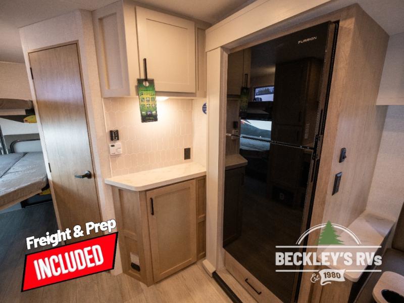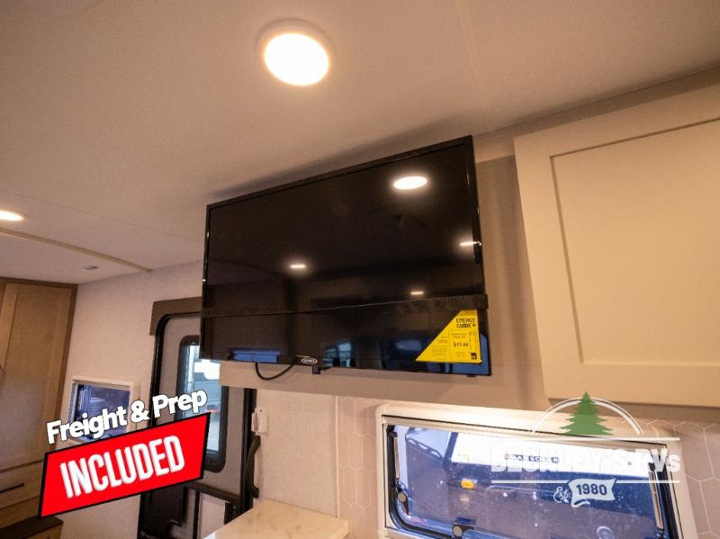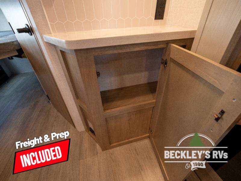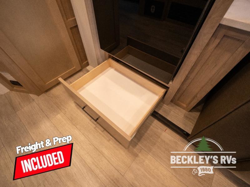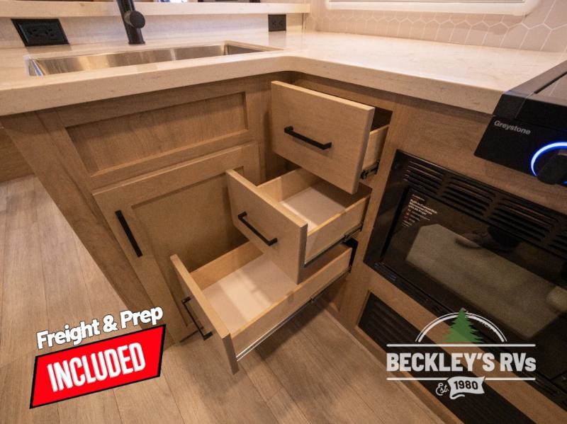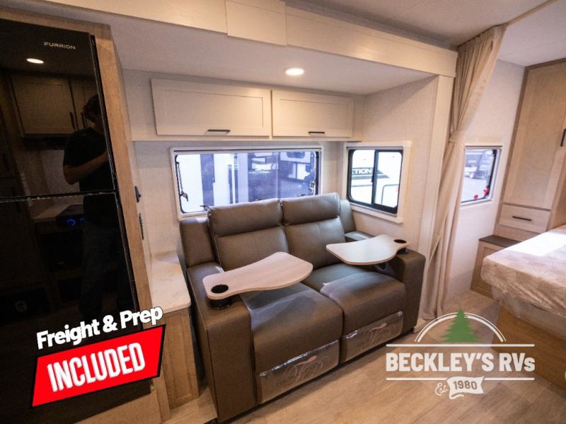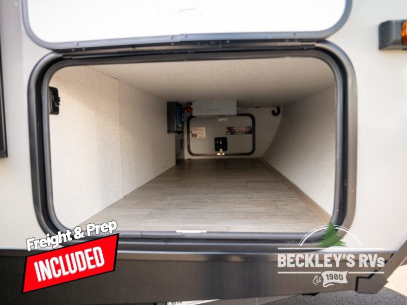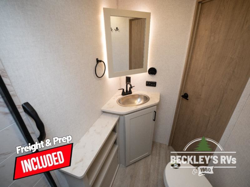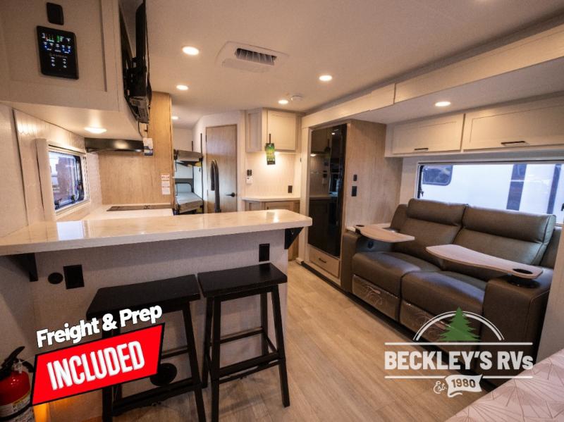 You will love camping in this versatile travel trailer! There is a repositionable EmberTrack E-Track bunk/storage system with single and double-size bunk configurations, depending on your needs, plus a fold-up Bar-V window that overlooks the exterior fold-down bar top/door. You'll find your own semi-private bedroom up front with a walk-around queen bed, dual nightstands and wardrobes, plus an overhead cabinet for ample storage. An optional Murphy bed can be chosen in place of the queen bed if you're needing more seating space during the day! The dual-burner LP cooktop and air fryer convection microwave will let you make meals each day, and there is a breakfast bar with bar stools where you can dine together. This unit also includes a slide out with theater seating with rotating side tables for the ultimate place to relax, plus there is a 12V refrigerator and overhead cabinet here for more storge space!