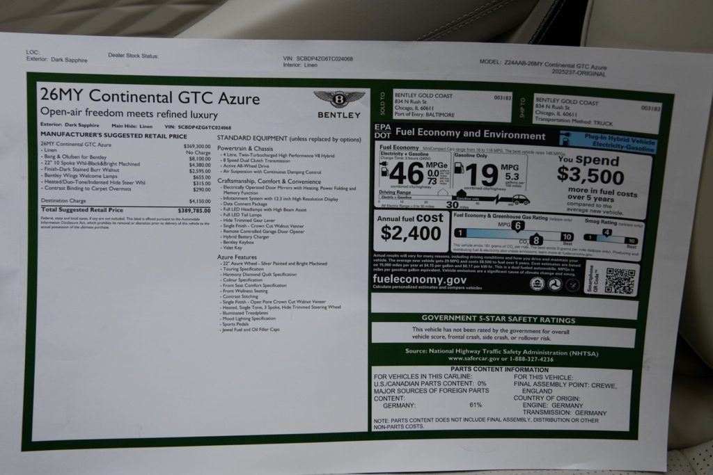2026 Bentley Continental GTC Convertible GTC Azure 4.0L Plug-in Hybrid Twin Turbo V8 671hp 686ft. lbs