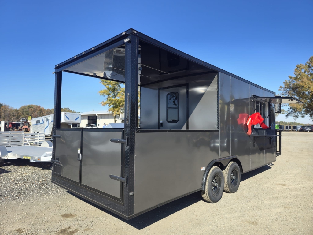 πŸ’₯ Welcome to Best Trailers & Supply – Your Ultimate Trailer Destination! πŸ’₯ πŸ“ Location: Byron, GA πŸ‘ πŸ“ž Call us at 478.654.5350 for Expert Advice and Unbeatable Deals! πŸ†“ Don’t Miss Out! Get a FREE White Wheel Spare Tire when you Pay Cash at Pick Up! πŸ†“ Empire Cargo 8.5Γ—22 Concession Porch Trailer – Mini Split AC, 50 Amp Package, Sinks, Gen Platform & Blackout Trim This Empire Cargo 8.5Γ—22 concession porch trailer is fully equipped and ready to be customized for food service, vending, events, or mobile business operations. With a spacious interior, dedicated porch area, upgraded electrical package, and a full AC system, this trailer provides the comfort, durability, and flexibility needed for serious commercial use. Interior Features Mill finish walls and ceiling for a clean, durable, easy-to-sanitize workspace Rubber coin flooring for slip resistance and long-term wear Mini Split A/C system keeps the interior cool and comfortable during long work days Sinks in the nose for convenient cleaning and prep 50 amp electrical package ready to support appliances, lighting, and equipment 36″ access door in the V-nose for quick entry and exit Exterior & Porch Features Extended tongue with generator platform β€” ideal for mounting a generator without sacrificing interior space Rear porch with knee wall β€” perfect for serving, grilling, or outdoor food operations Blackout trim package adds a modern, high-end look Tandem 5200 lb leaf spring axles for smooth towing and dependable load capacity Built for Mobile Food & Business Use Whether you’re outfitting it for concessions, BBQ, shaved ice, retail, or events, this 8.5Γ—22 porch model provides the strong foundation and essential features you need to get up and running quickly. Its rugged construction and smart layout make it ideal for both new builds and established businesses looking to upgrade. 🚚 Delivery Available at $2 per Loaded Mile! 🚚 πŸ“ž For any questions, concerns, or info on this trailer, don’t hesitate to call our dedicated sales team at 478.654.5350! πŸ“ Visit us at Best Trailers & Supply in Byron, GA or call 478.654.5350 for more information! 🌟