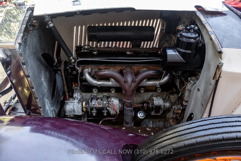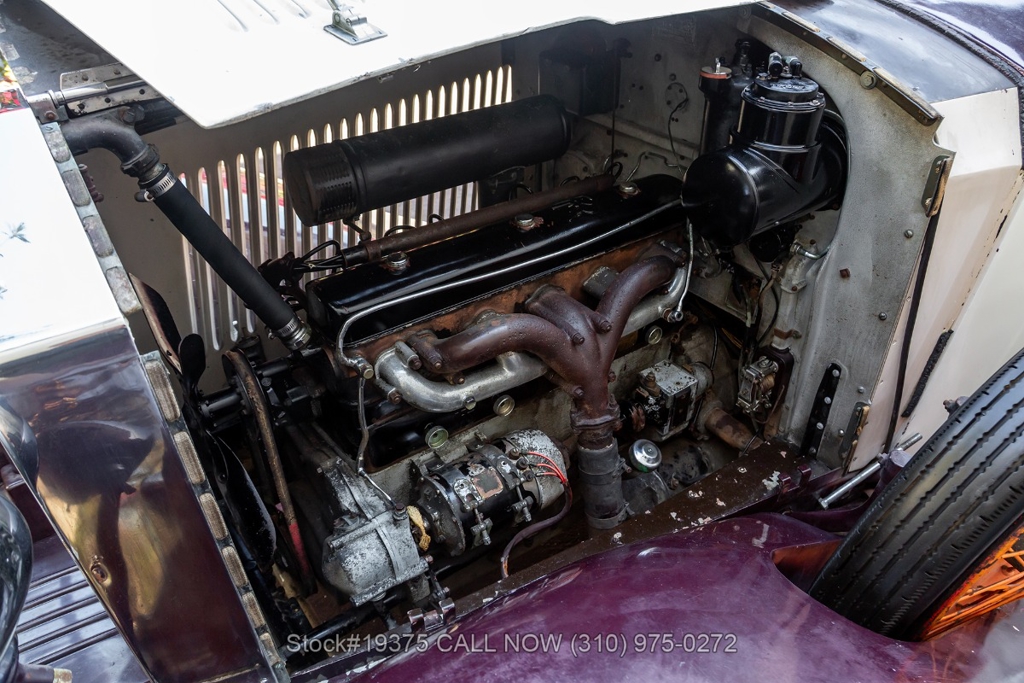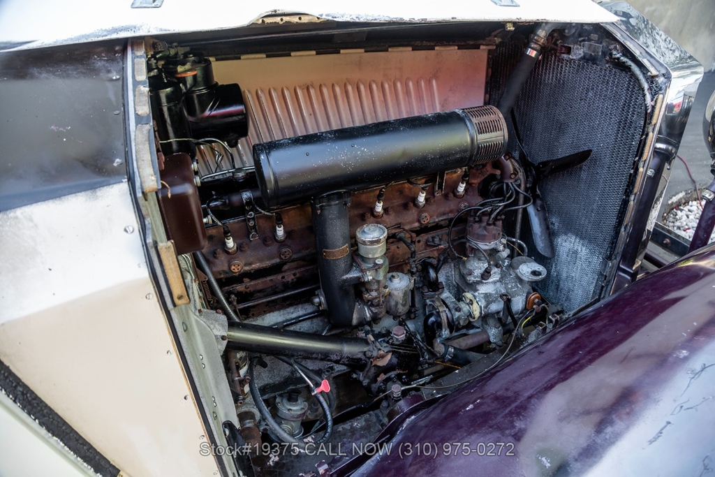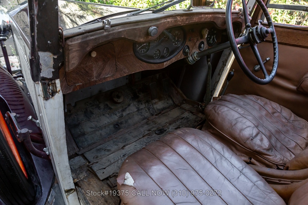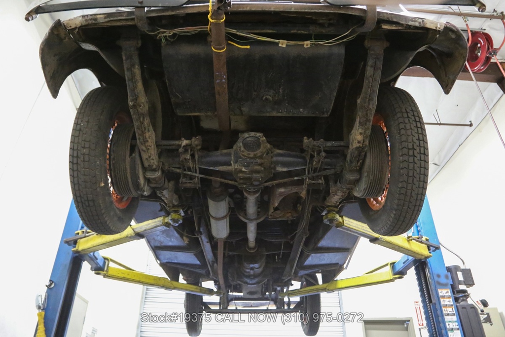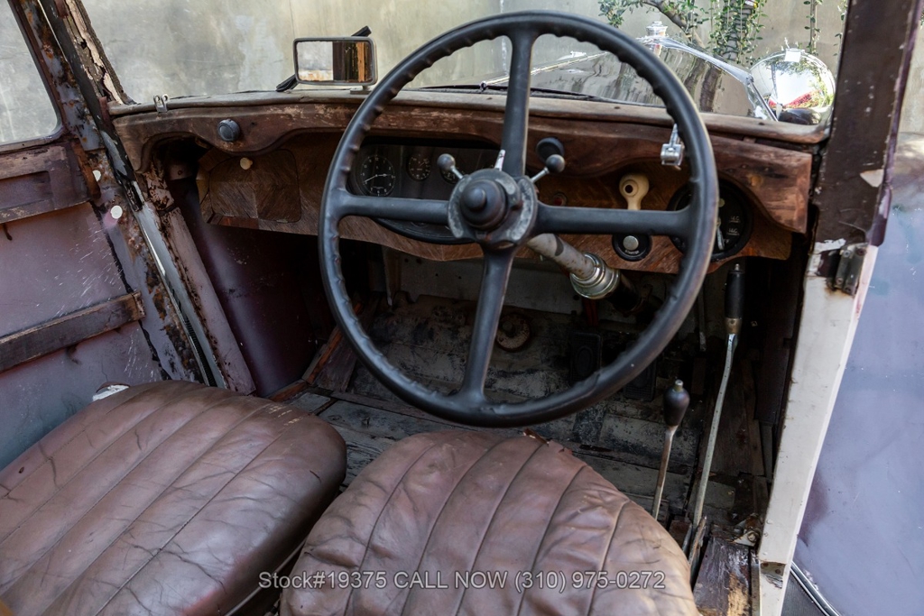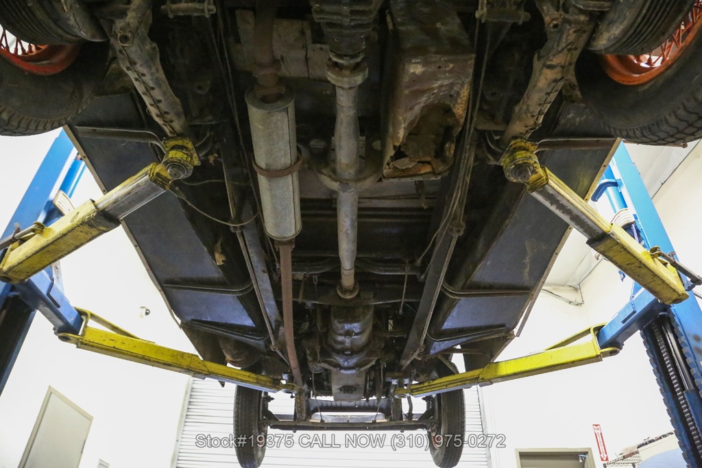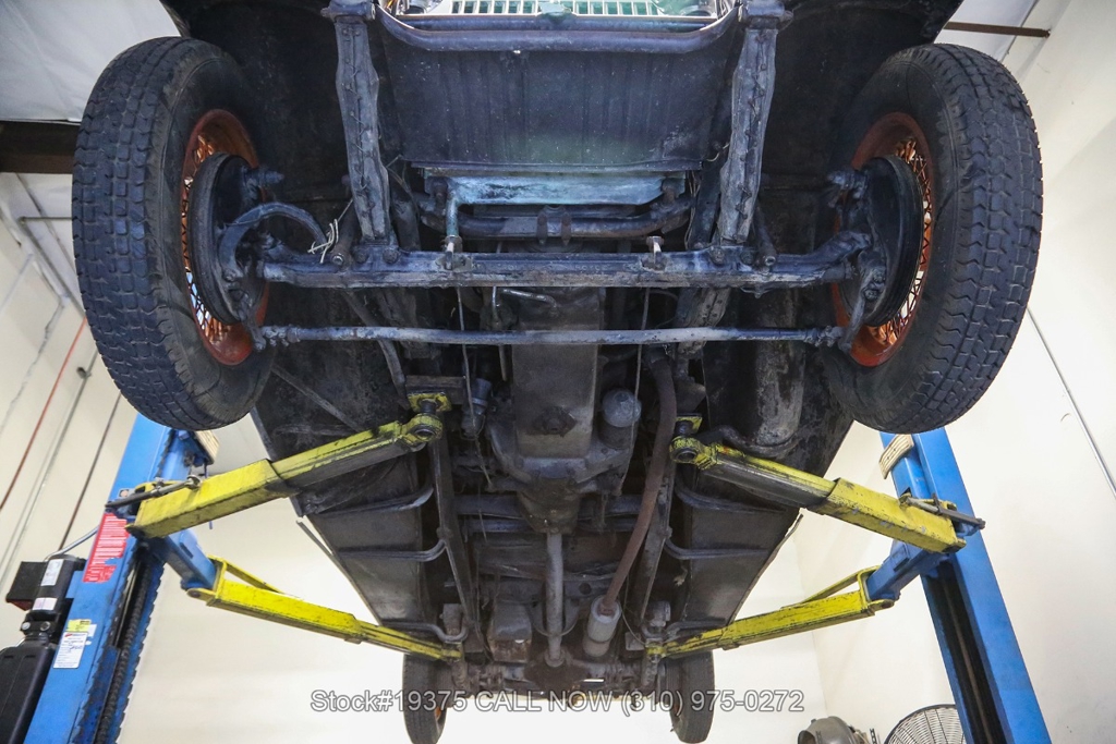 Equipped with a 4-speed manual transmission, straight-six engine, single-barrel carburetor, drum brakes, rear hinged doors, Lucas-branded headlights, interior wood trim, Exelsior Racing tires, 19-inch wire wheels, and a side-mounted spare tire. Featured amenities include adjustable separate seats, dash-mounted rearview mirror, and a 4-spoke steering wheel.