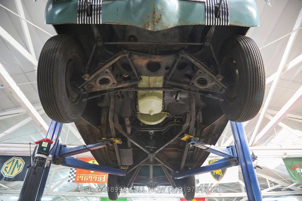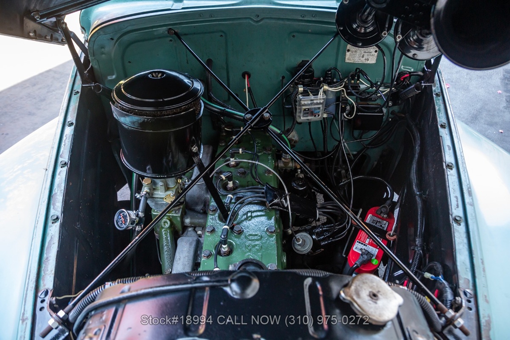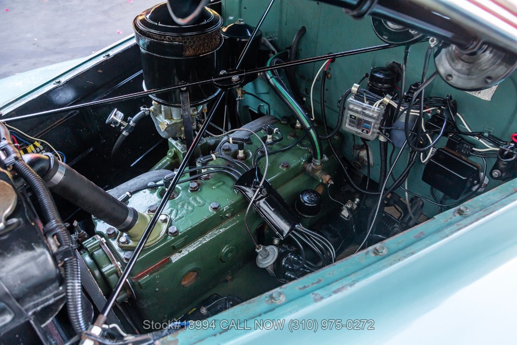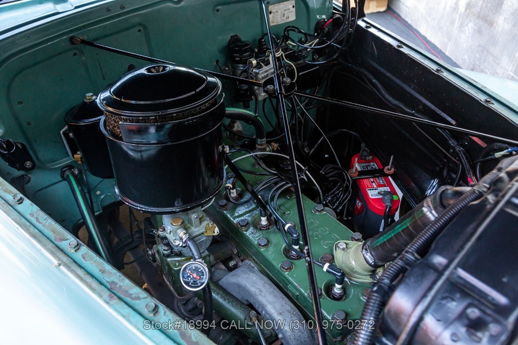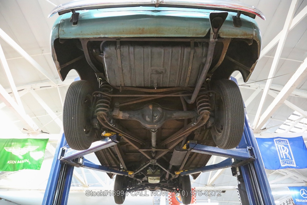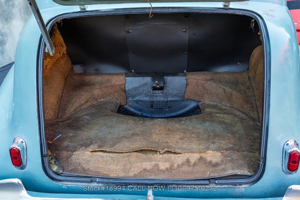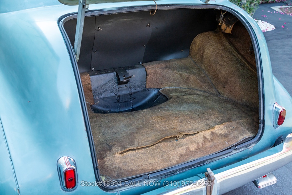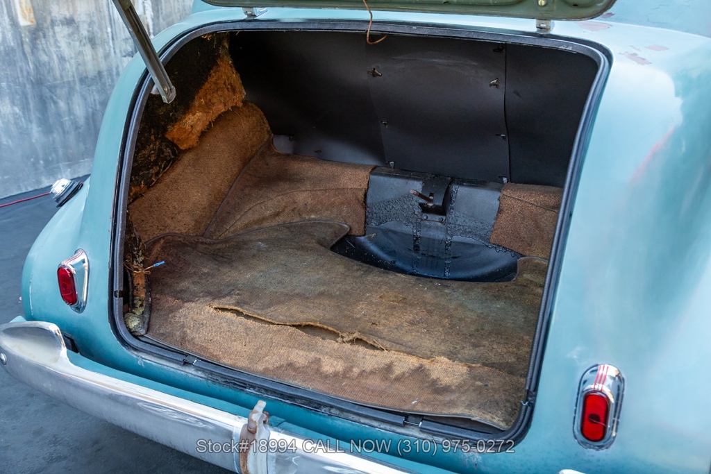 Equipped with a 3-speed manual transmission, straight-6 engine, Carter carburetor, single exhaust outlet, chrome trim/bumpers, hood ornament, 3-spoke steering wheel, column-mounted gear selector, Lester white-wall tires, 16-inch steel wheels with Oldsmobile hubcaps, and a full-size spare tire fitted in the trunk. Featured amenities include bench seating, dual-side rearview mirrors, pivoting vent windows, push button radio, and a fender-mounted antenna.