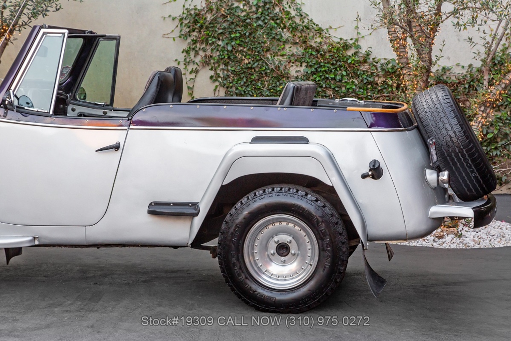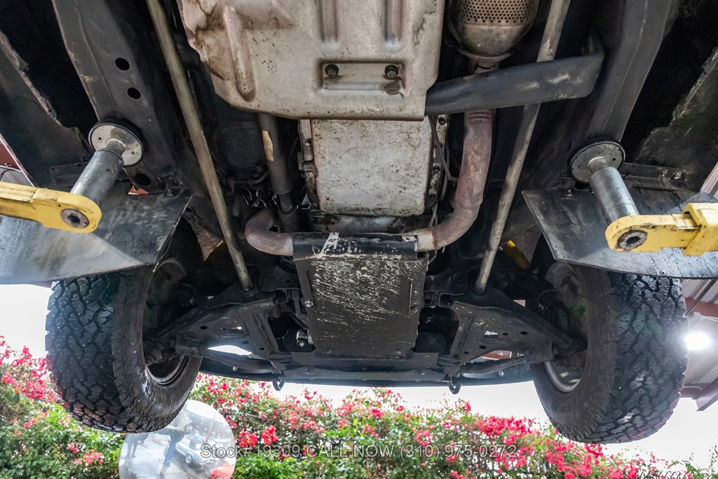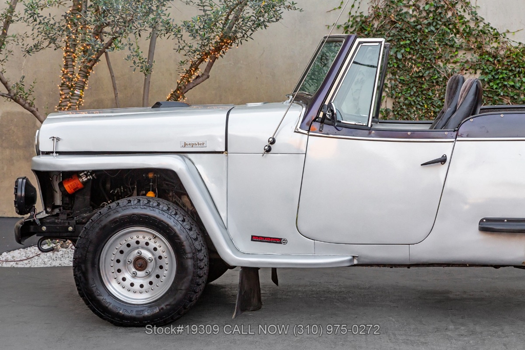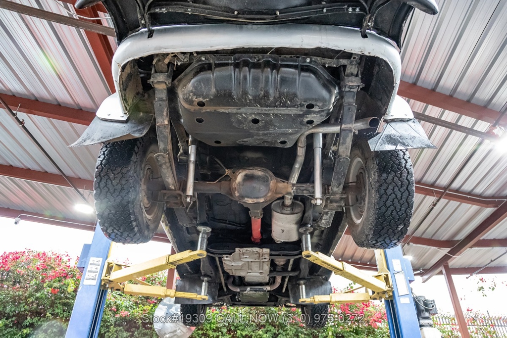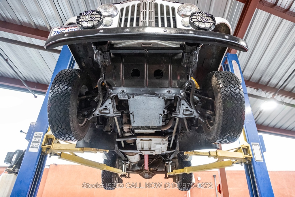 The chassis has been upgraded using S10 truck components, enhancing ride quality, durability, and overall handling. Front disc brakes improve stopping power, while the single exhaust outlet delivers a clean and subtle sound. The Jeepster rides on 15-inch steel wheels wrapped in white-letter General Grabber tires, complementing its classic look.